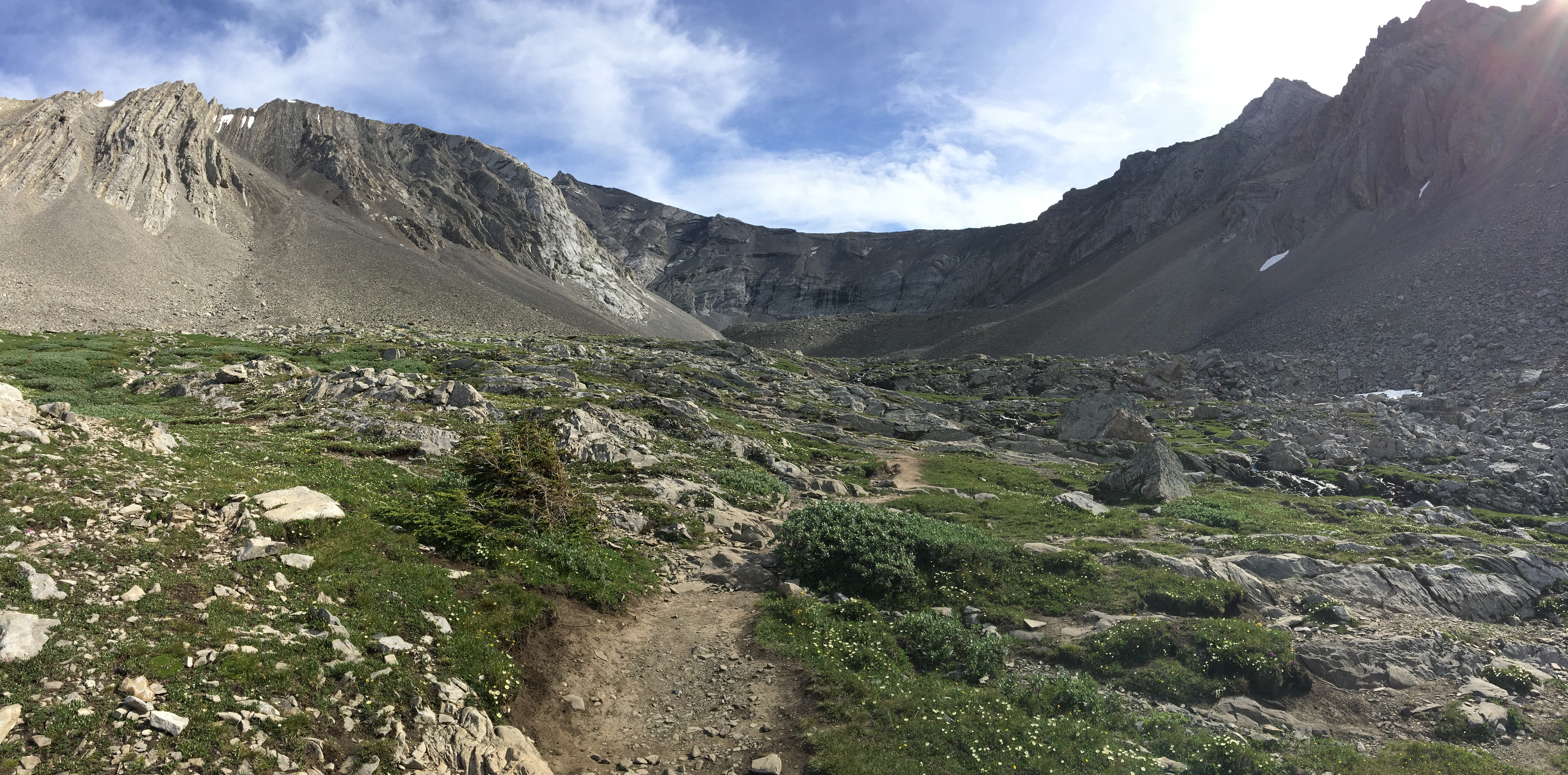 Ptarmigan Cirque is located in Kananaskis Country, and the trail begins at the Highwood Pass. At 2206 m, it’s the highest point in Canada accessible by highway. There’s literally no way you could drive your car higher up a mountain in Canada to get you started on a hike. Get there on Highway 40, 67 km south from the Trans-Canada Highway junction, or 38 km north from Highwood Junction. The pass itself has a prominent sign marking the high point. There are very clear signs pointing to the Ptarmigan Cirque hike, which begins at the Highwood Pass Day Use Area. Be aware that this part of Highway 40 is closed between December 1 and June 15. As an aside, if you’ve never driven Highway 40, you should. The views are astounding.