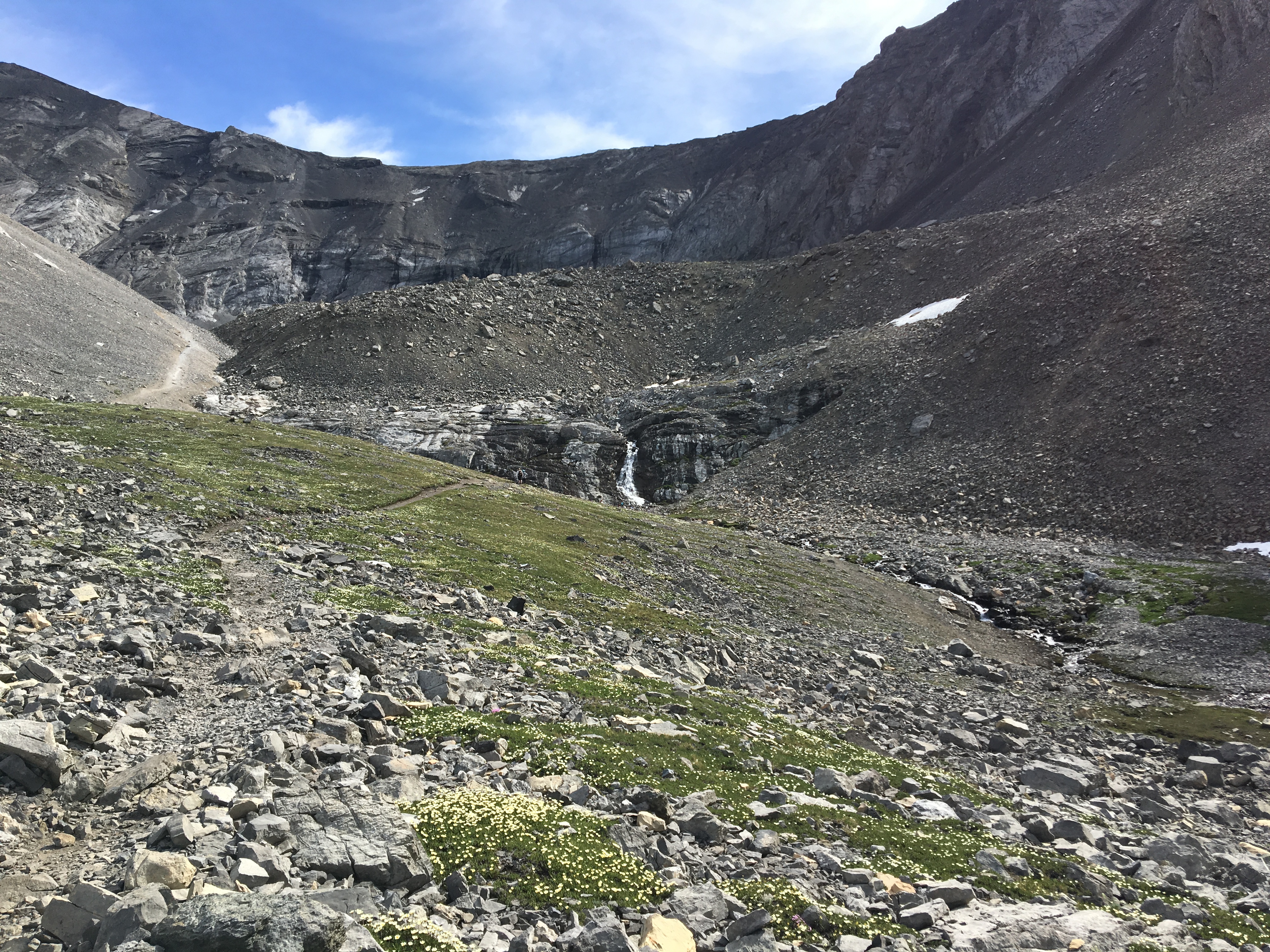In 30 minutes or less, you pass an intersection, with a “Do not enter” sign on the right branch. This is where you’ll return after a clockwise loop of the cirque. Very soon after, you’re out of the forest and the cirque lies before you, Mount Rae and Mount Arethusa looking down from either side. Proceed along the trail as it makes a clockwise loop. At the apex, you’re on a rocky outcrop next to a little creek and waterfall. There’s an option here to break from the loop and explore further up toward the northeast, following the creek through easy, rocky terrain to a waterfall. We made the waterfall our final destination, but there’s a trail that continues beyond and climbs the scree. This is the start of the Mount Rae scramble route.
