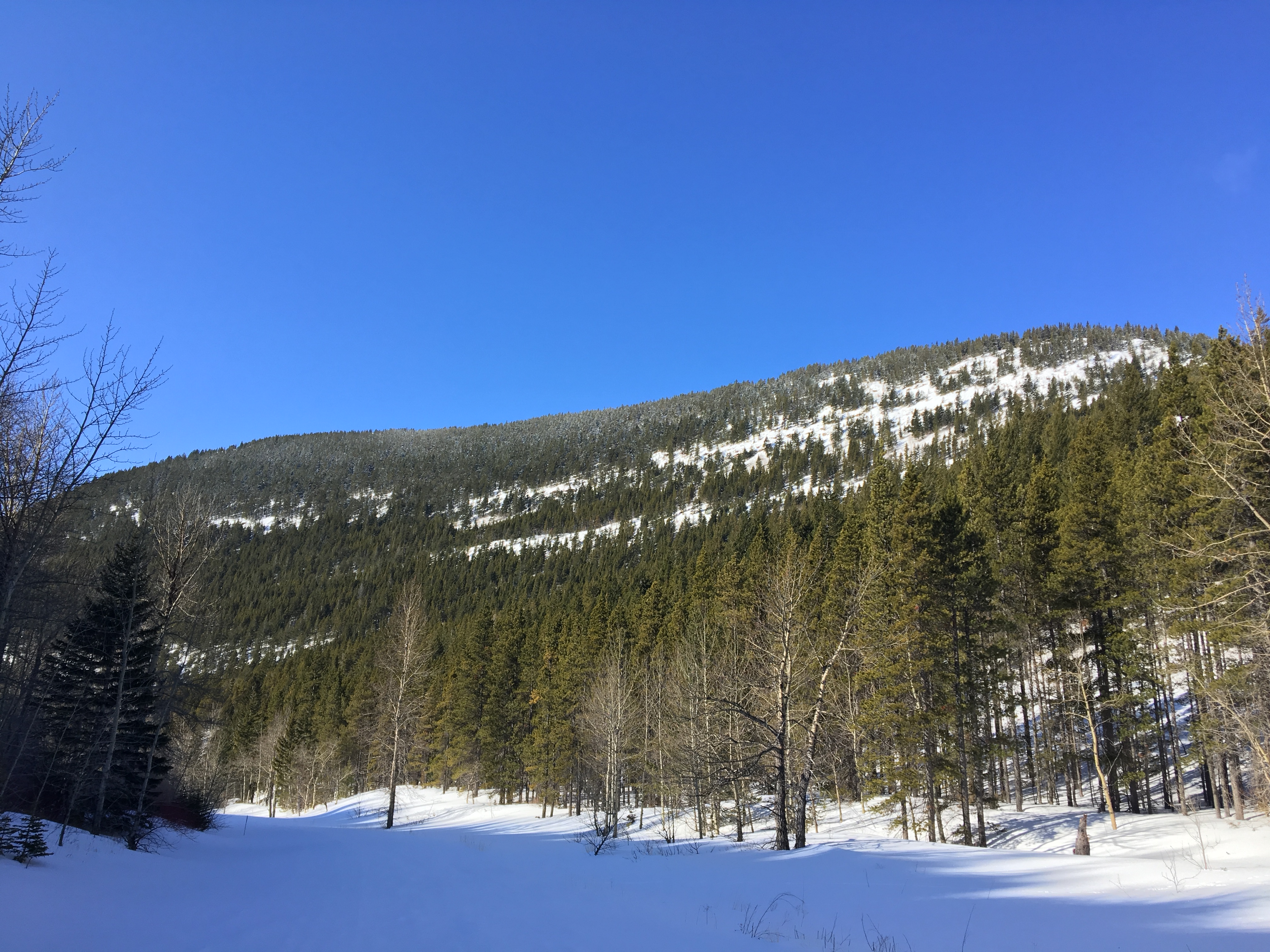 Island Ridge sits adjacent to Highway 3, just before it crosses into B.C. Ask Google Maps to drop a pin here: 49.626550, -114.671854. Turn south at that intersection. There’s a mining/logging road there that heads south down the valley. The highway skims past the north end of Island Ridge, but the start of the climb is at the south end. Most of the horizontal distance of this route, therefore, involves walking around to the south side of the ridge so you can begin to climb up. People with a lot of confidence that their vehicle won’t get stuck in the snow can drive a lot of that distance on the road, but I had no such confidence in my Mazda 6 so I parked just inside the turn-off.