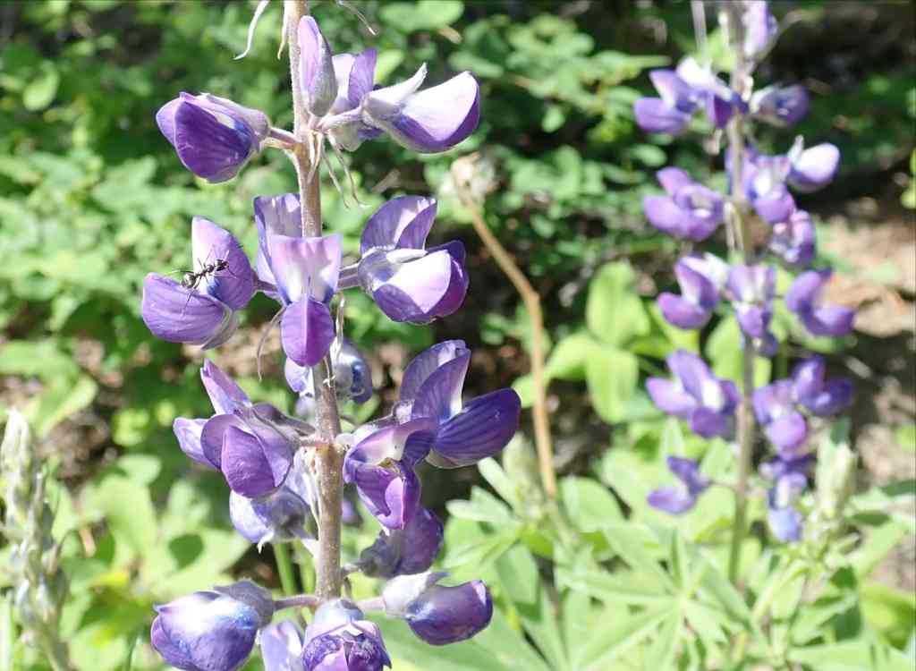 If you venture off the road into the clearings wildflowers are abundant. During our 2022 summer visit we used the ridge route (my snowshoe ascent route) for descent. An ant is exploring the petals on this Lupine. Photo courtesy of Cassie Boora.