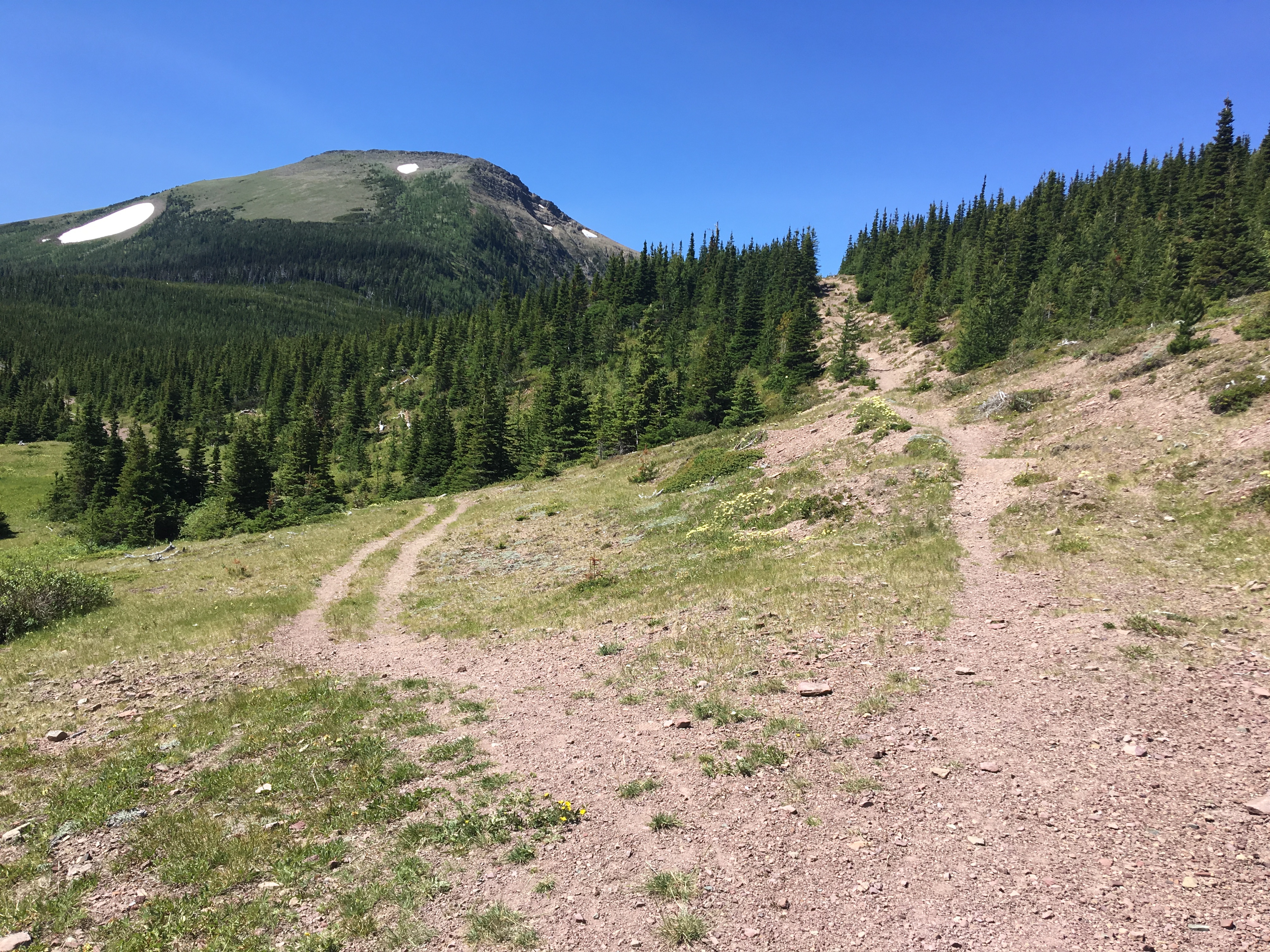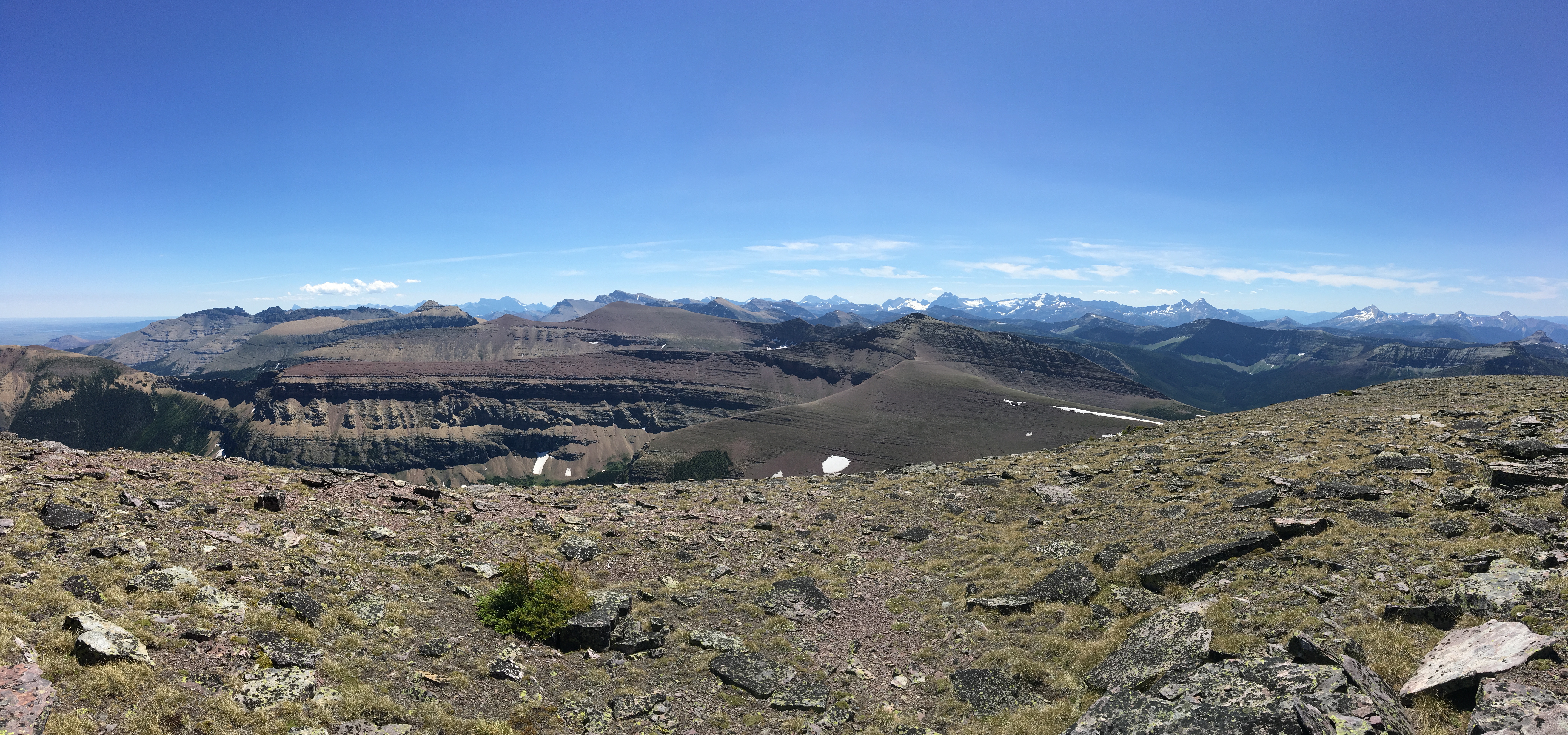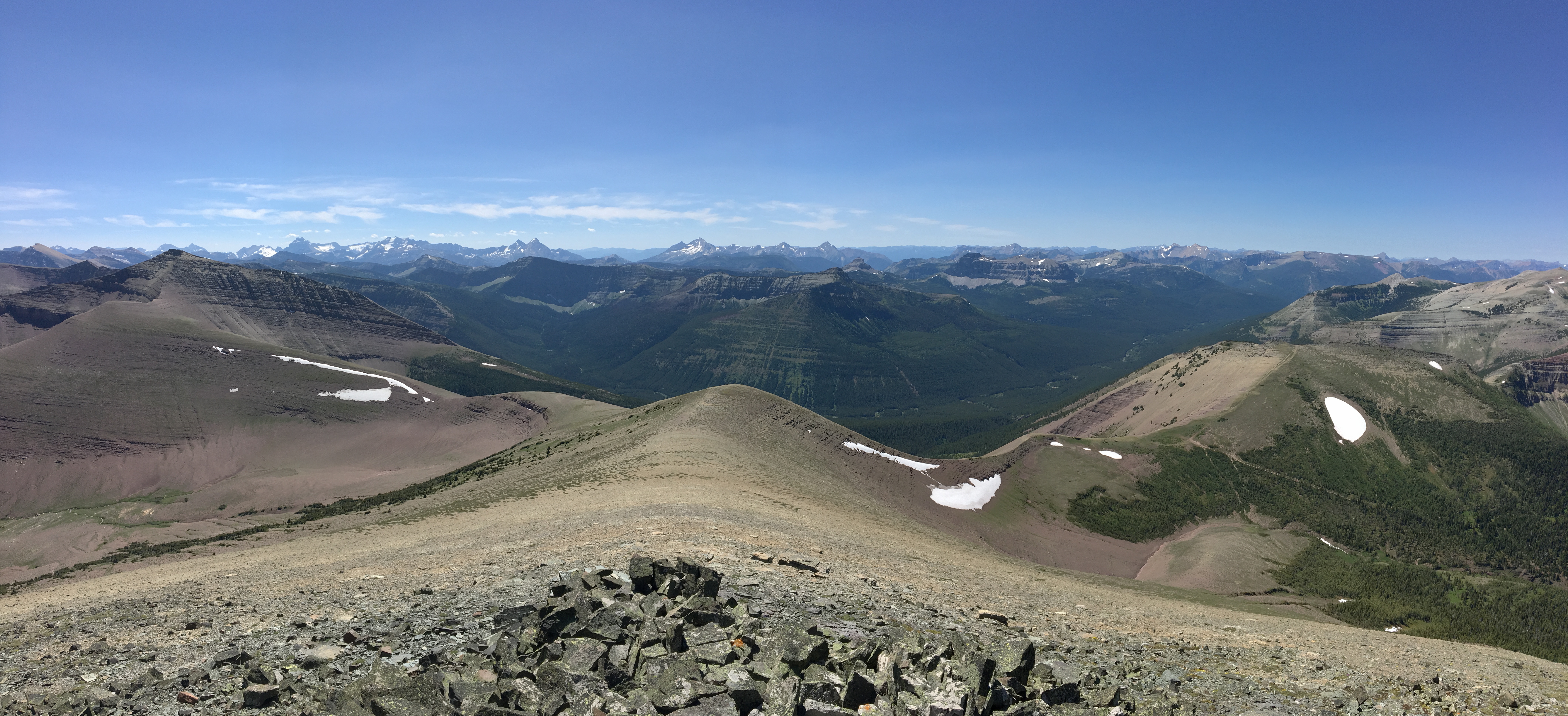 As the trail climbs to the saddle, the grade increases somewhat. Now, in a cut-line on a treed slope, there are neither views nor shade. It’s a short-lived section, though, and the saddle is soon gained along with the first glimpses of the amazing views to come. From my car, parked on the other side of the locked gate, the saddle was 11.2 km distant with 726 m elevation gain. It took 2h 40m to reach there. There were nice views of Sage Mountain on the other side of a broad valley. More impressive were the towering peaks in the far distance to the south, which I realized were in Montana’s Glacier National Park.