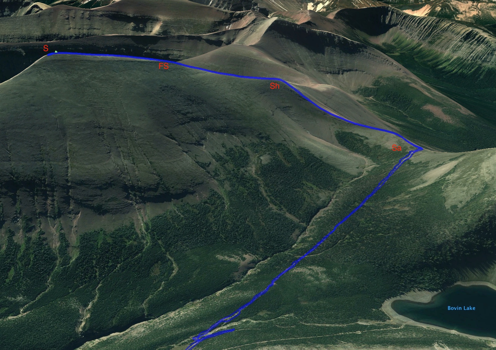 Though it lacks the dramatic, rocky profile of Victoria Peak, Loaf Mountain is actually the tallest peak within the Castle Wilderness with a summit elevation of 2640 m. There are multiple possible routes to the summit, but I decided to keep things simple. When I visited Bovin Lake last year, I noticed that there was a clearly visible trail that continued past the lake towards the saddle between Loaf Mountain and an un-named high point overlooking Bovin Lake. From the saddle, it looked like a straightforward walk up the ridge to the summit of Loaf Mountain.
