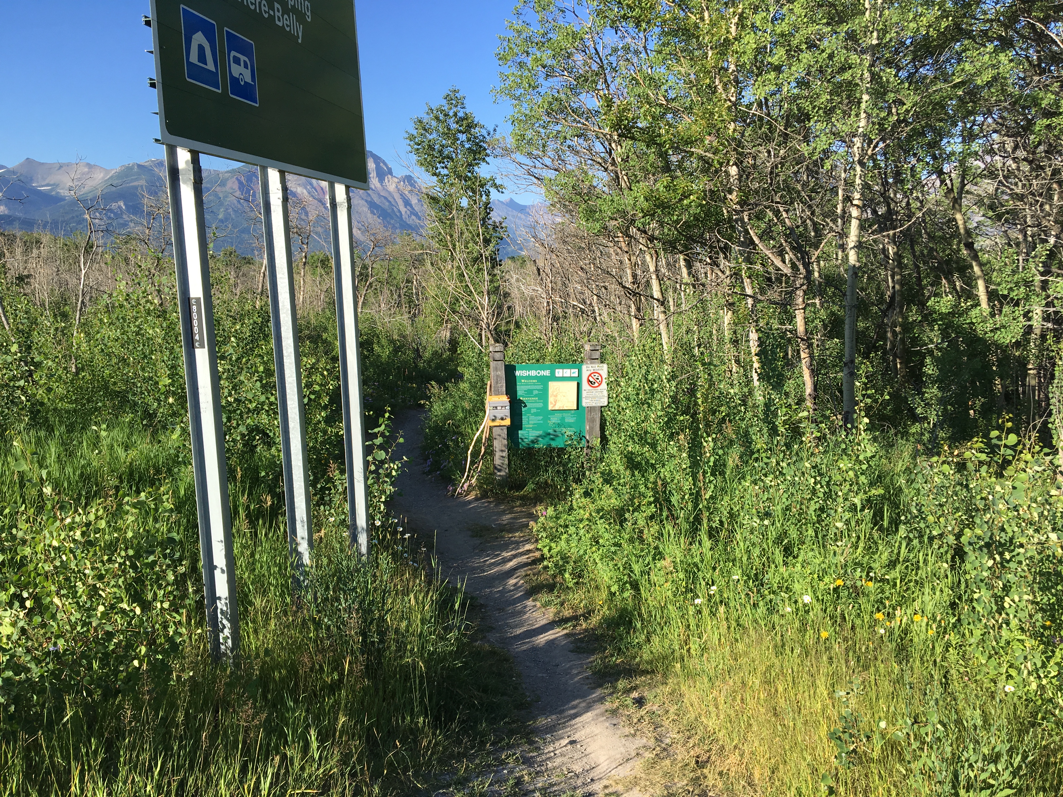 The Wishbone trail, which allows access to the Vimy Peak trail (then continues on to Crypt Landing) is accessed via a pull-off from Hwy 6. If approaching Waterton on Hwy 5 from Cardston, turn left onto Hwy 6 towards the Chief Mountain Border Crossing shortly before crossing the bridge over the Waterton River. The parking area is at 49.108915, -113.826465. The Wishbone is a fairly flat trail that is sometimes level but usually rutted. Bicycles are allowed as far as the Vimy Peak trailhead at 7km. The trail crosses Sofa creek after 5.5 km. There’s no bridge, but the water wasn’t deep and fording was easy. On the other hand, I found that riding a bike in a narrow rut is actually pretty hard! Given my total lack of on-trail mountain biking experience, I got going too fast during the return-trip. The front tire climbed its way out of the rut, the rear tire turned perpendicular, and I went flying. It was an avoidable crash, and I really should have been more cautious.