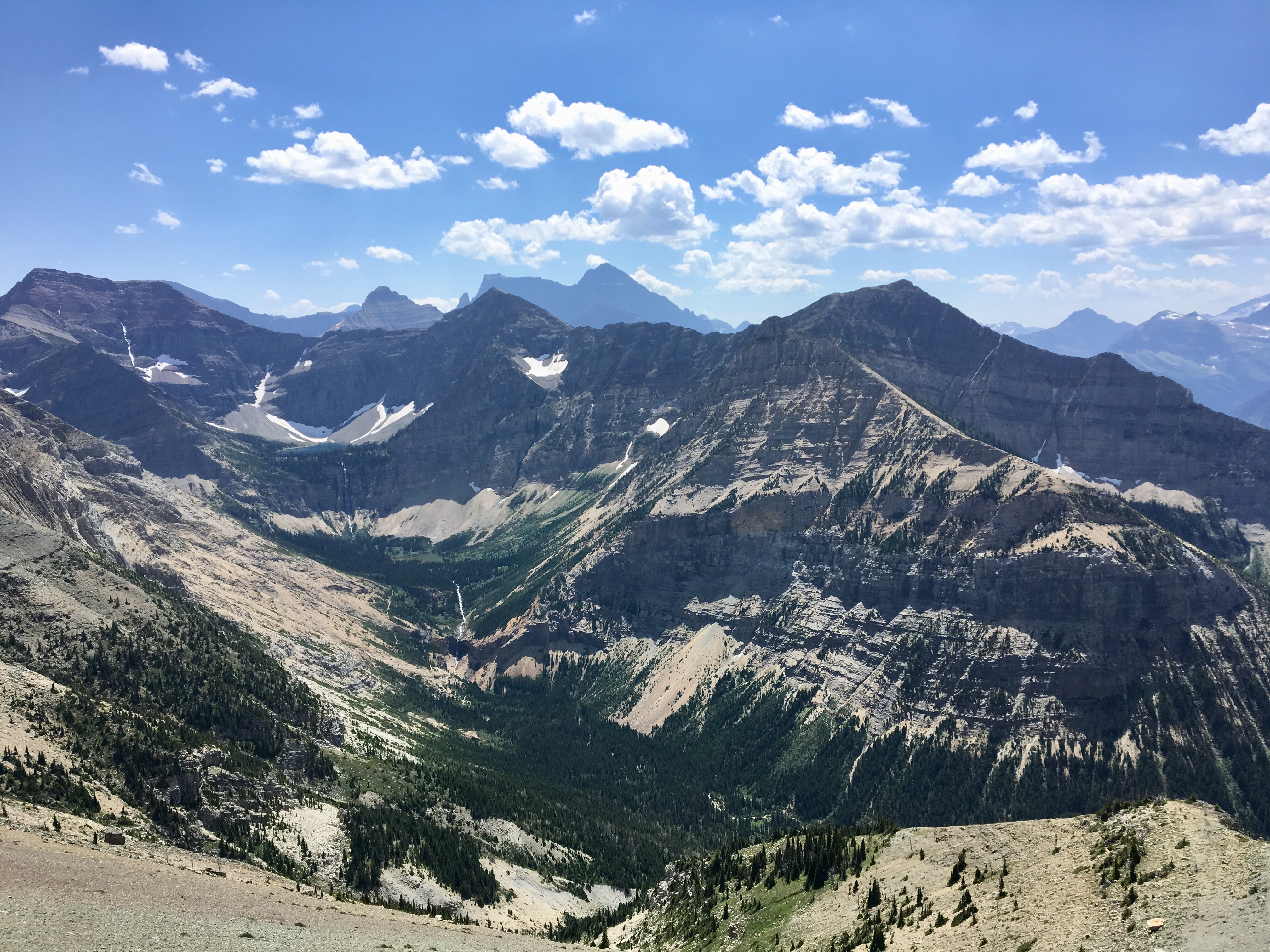 At the start of the Vimy Peak trail itself we all stashed our bikes in the bushes. It was a particularly hot day, so some of the party also stashed extra water to pick up on the return journey. We set off up the trail. There wasn’t much to see at first, with the trail passing through trees and thick underbrush. Here and there we found clearings which provided a view down towards the Waterton lakes and townsite. A distinctive rocky outcropping, called the Lion’s Head, was intermittently visible above and to the right of the trail. The trail would eventually loop around behind that outcropping and head up a drainage, paralleling a brook. The hiking in the drainage was less claustrophobic and the cool water of the brook was very refreshing to splash onto our skin. The trail crossed a waterfall, and a short distance above that the brook disappeared. It seems that the brook is fed by melt-water from Vimy Basin. The Basin contains no lake, just some snow piles. The melt-water doesn’t accumulate as a lake, but percolates through the rocks and eventually appears down in the drainage.