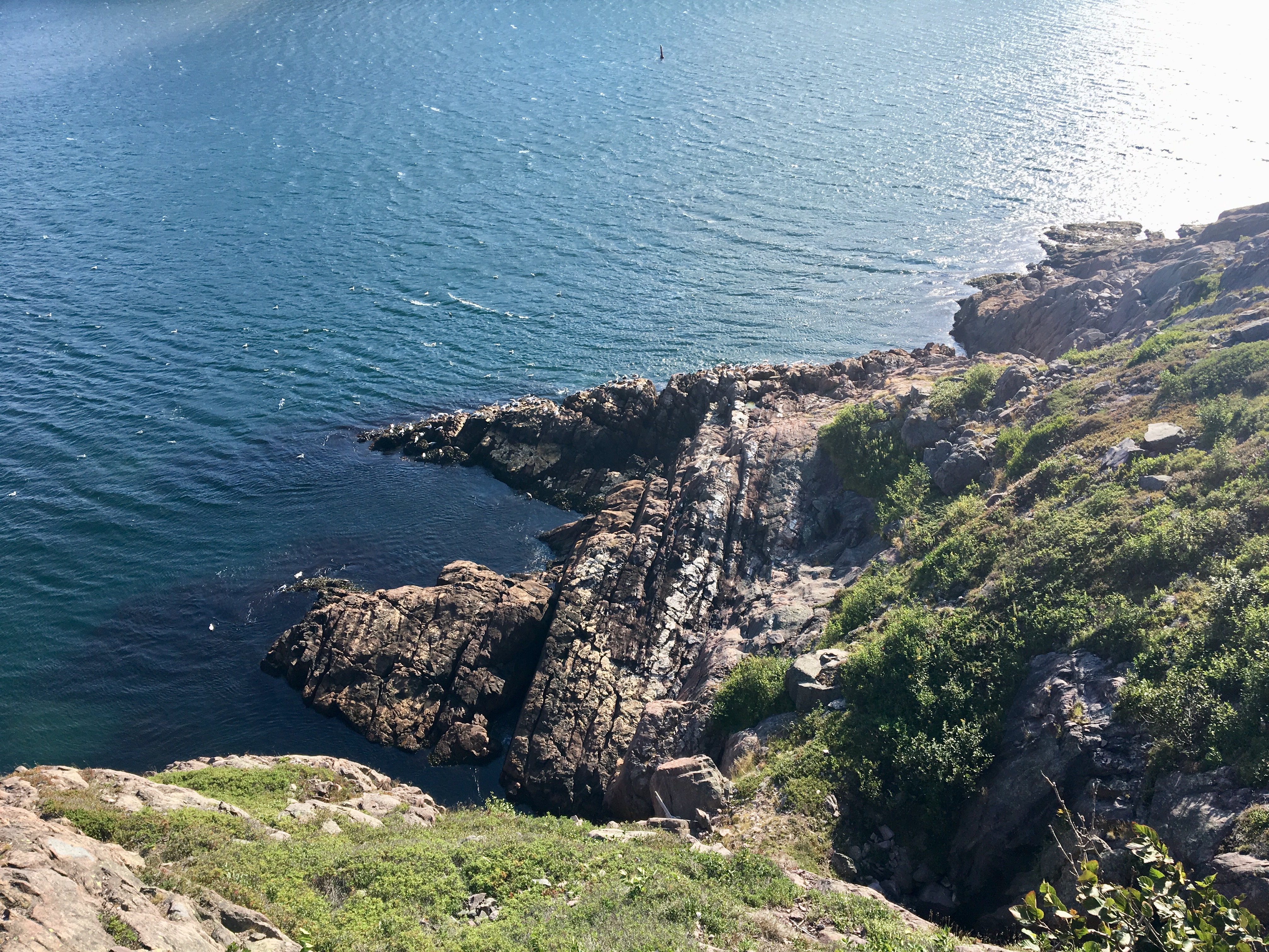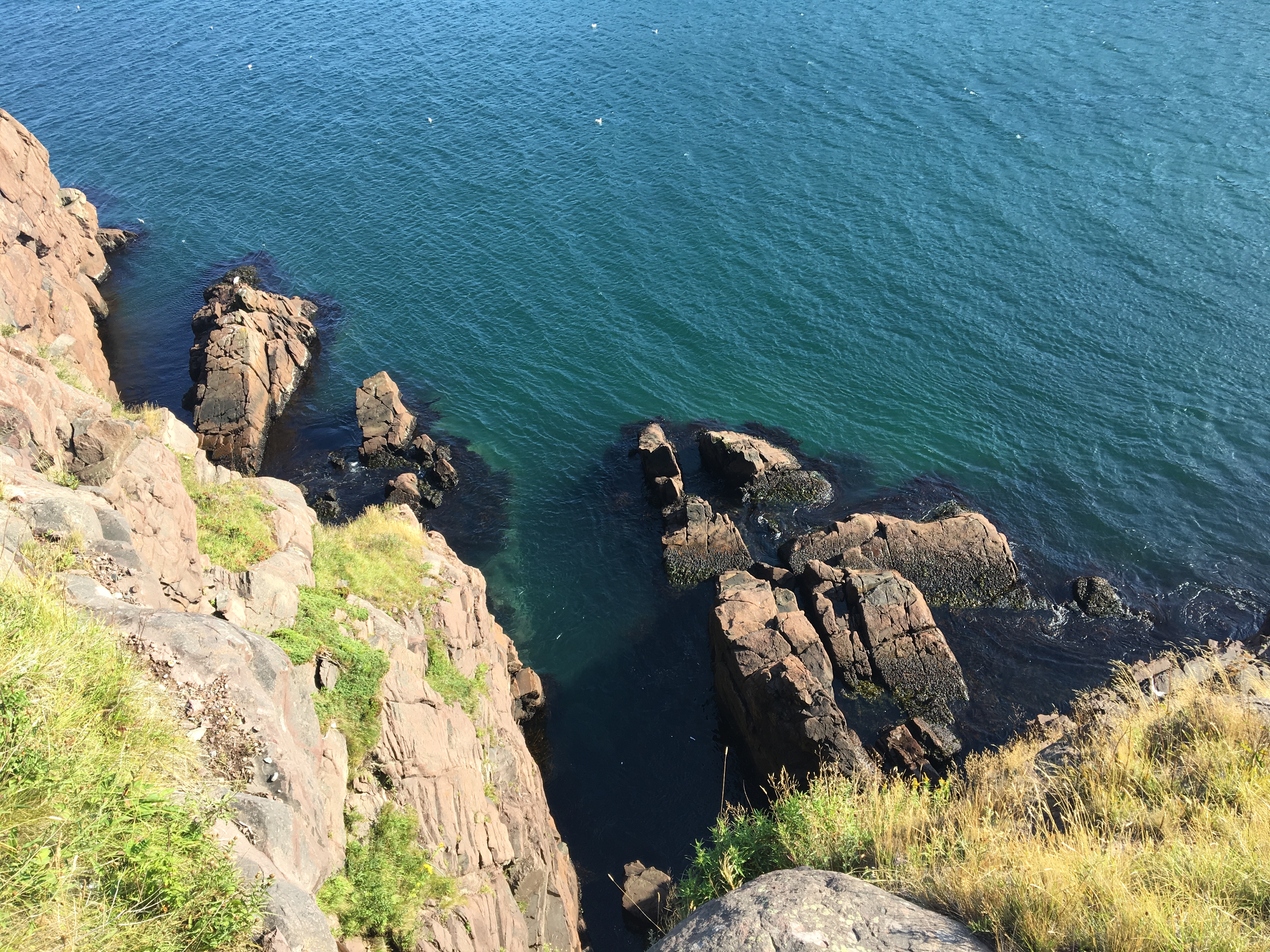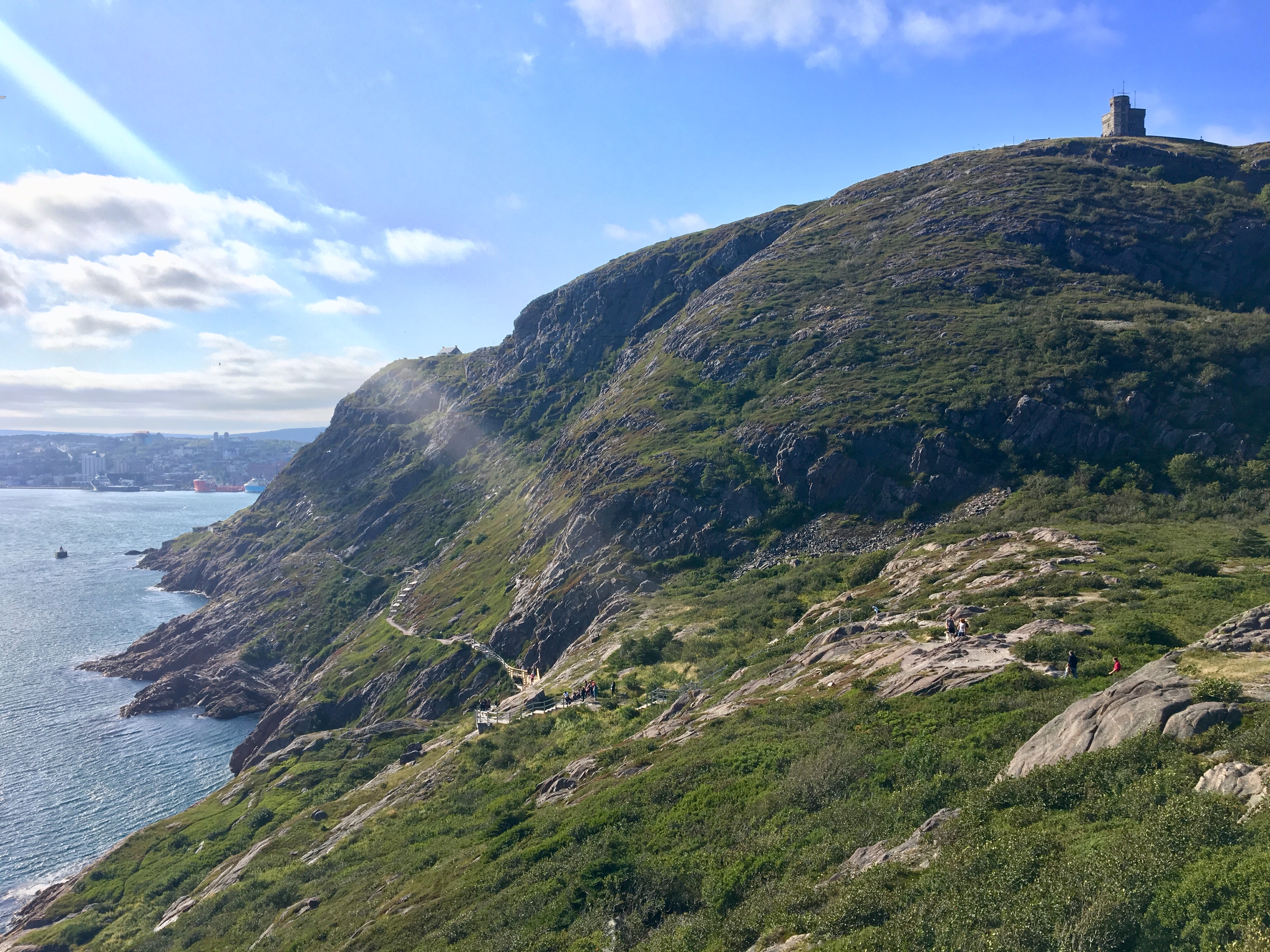 The trail featured views of the vast North Atlantic, fun bits of rock to climb over and around, even a narrow portion with a chain to grab on to, reminiscent of Waterton’s Crypt Lake hike. As the trail swung back towards the harbour there were interesting views across the narrows. The historic Fort Amherst Lighthouse was clearly visible, along with many picturesque buildings on Cahill Point. In the far distance I could see Cape Spear, faintly making out its famous lighthouse. There was some intriguing rock scenery up on the cliffs and down by the water. It’s easy to see why this is such a popular trail. I’m glad I didn’t miss it during my trip.