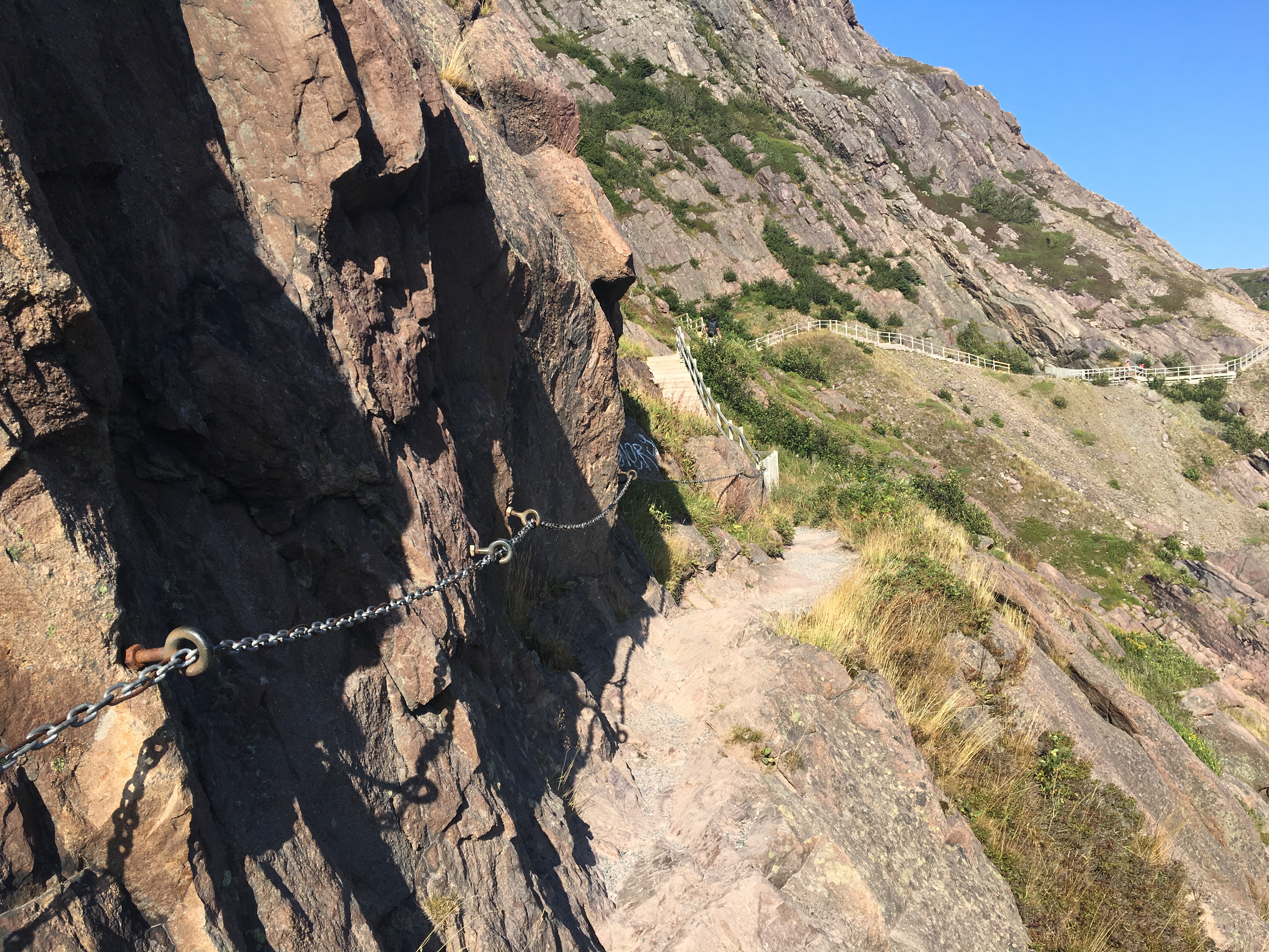 There had apparently been a recent closure of the trail for the purpose of upgrading some stairways and railings. Everything was very sturdy and easy to follow. Stairs led east and descended down from the trailhead. The route was visible ahead, winding north-to-south along the North Head of St. John’s Harbour, then swinging back to the west and out of sight as it traversed under the cliffs of Signal Hill.