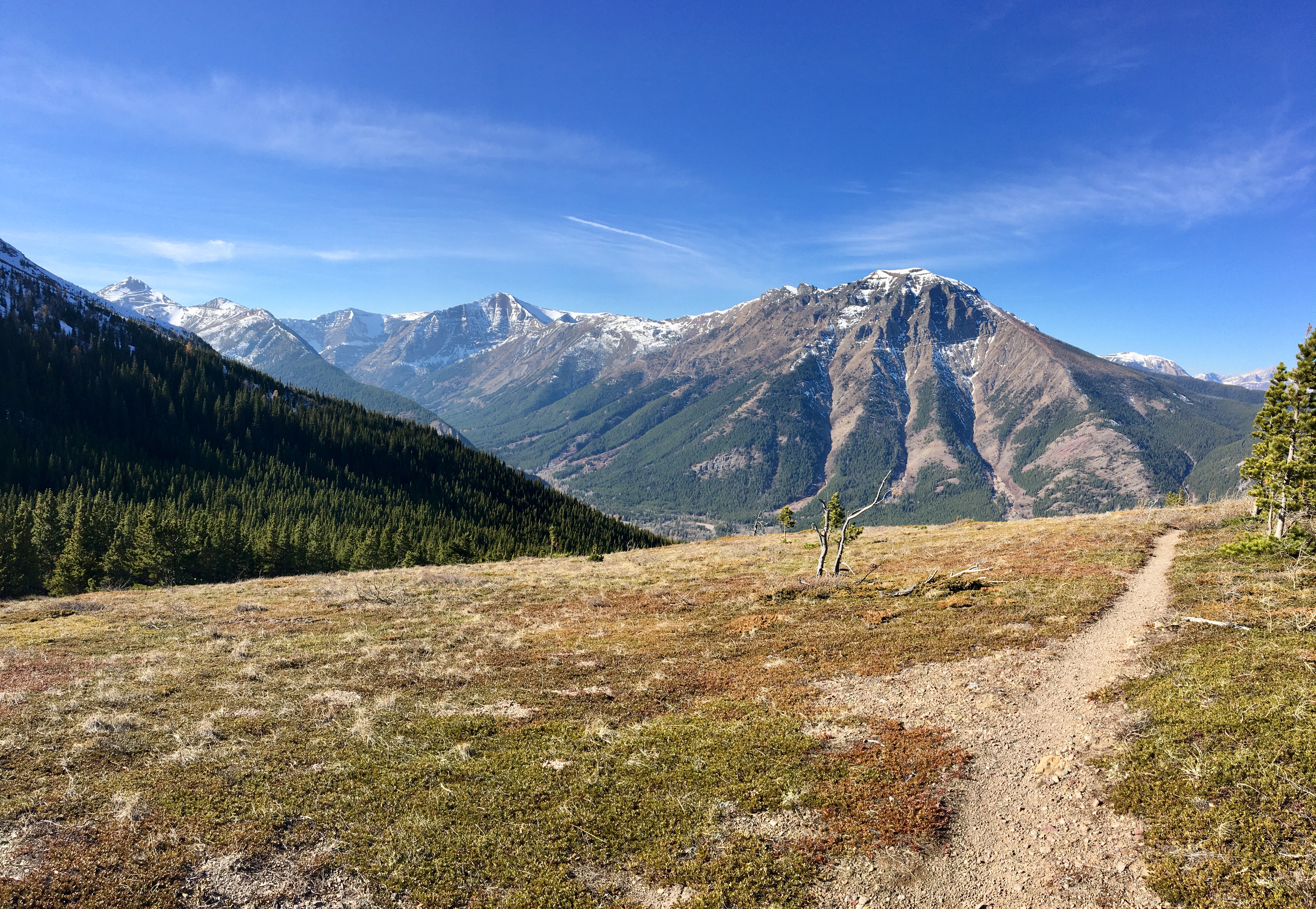 Eventually the trail levelled out, leaving the trees behind for a while and skirted around a bare high-point. I visited it on my way back down and there’s a cairn of stones on top. I haven’t been able to find a name for it, so I just called it Southfork Shoulder. It’s at 1884 m elevation, 49.345461N, 114.384211W. The views from that point were excellent, with Syncline Mountain, St. Eloi Mountain and Mount Haig directly across the valley, and Crowsnest Mountain and other peaks in the Crownest Pass visible in the distance. It would make for an outstanding picnic spot.