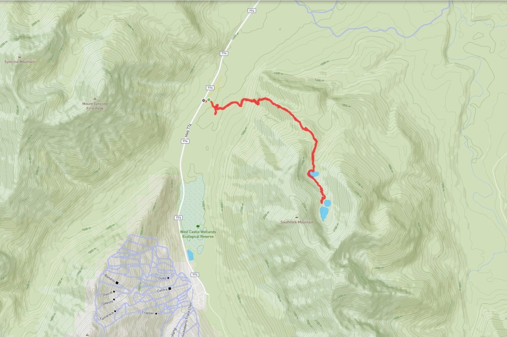 Access to the trail is from Highway 774, about 22 km south of Beaver Mines. A currently un-signed pull-out leads to some rough dirt roads. There used to be a small blue sign with a number on it there, but now it’s on the ground. This may be because the highway is now completely paved, all the way to the ski resort! This must have just happened in the last few months. New signage may eventually appear. Interestingly, the highway pull-out for the trail head is searchable on Google Maps. If you search “Southfork Lakes Trail Head” it’ll properly locate the site. Amusingly, when I found it on Google Maps the location was classified as a “Gym”. I sent a correction notice to Google and they’ve updated the information.