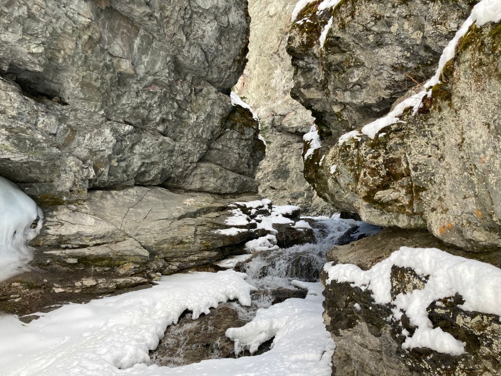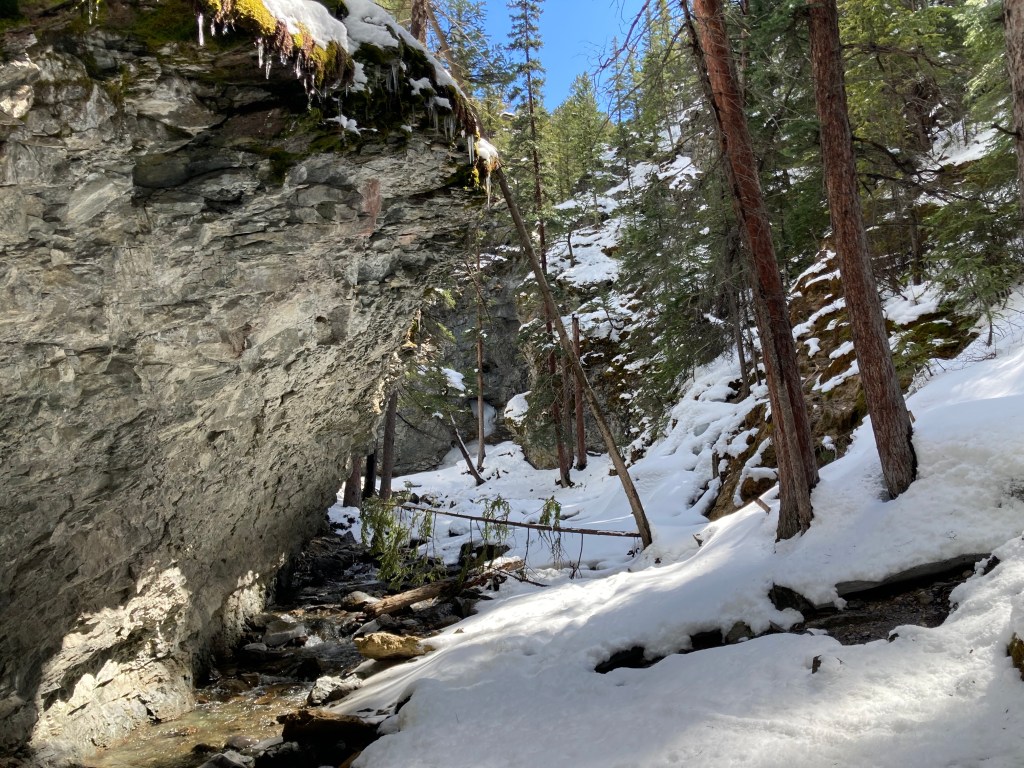 Star Creek Falls is a picturesque waterfall accessible by a short trail. There’s a satisfying loop route – which I suspected during my first visit with my daughter, and confirmed during a 2nd visit on a snowy spring day. The trip is featured in Nugara’s 2021 Popular Day Hikes: The Castle and Crowsnest. His description doesn’t include the loop route, likely because the bridges making the loop possible are relatively new. There’s also the option of following Star Creek up the canyon to the foot of the waterfall itself. This is a trickier path to follow and not for little kids, but it’s popular enough that someone has fixed a chain in place to help hikers along their way.