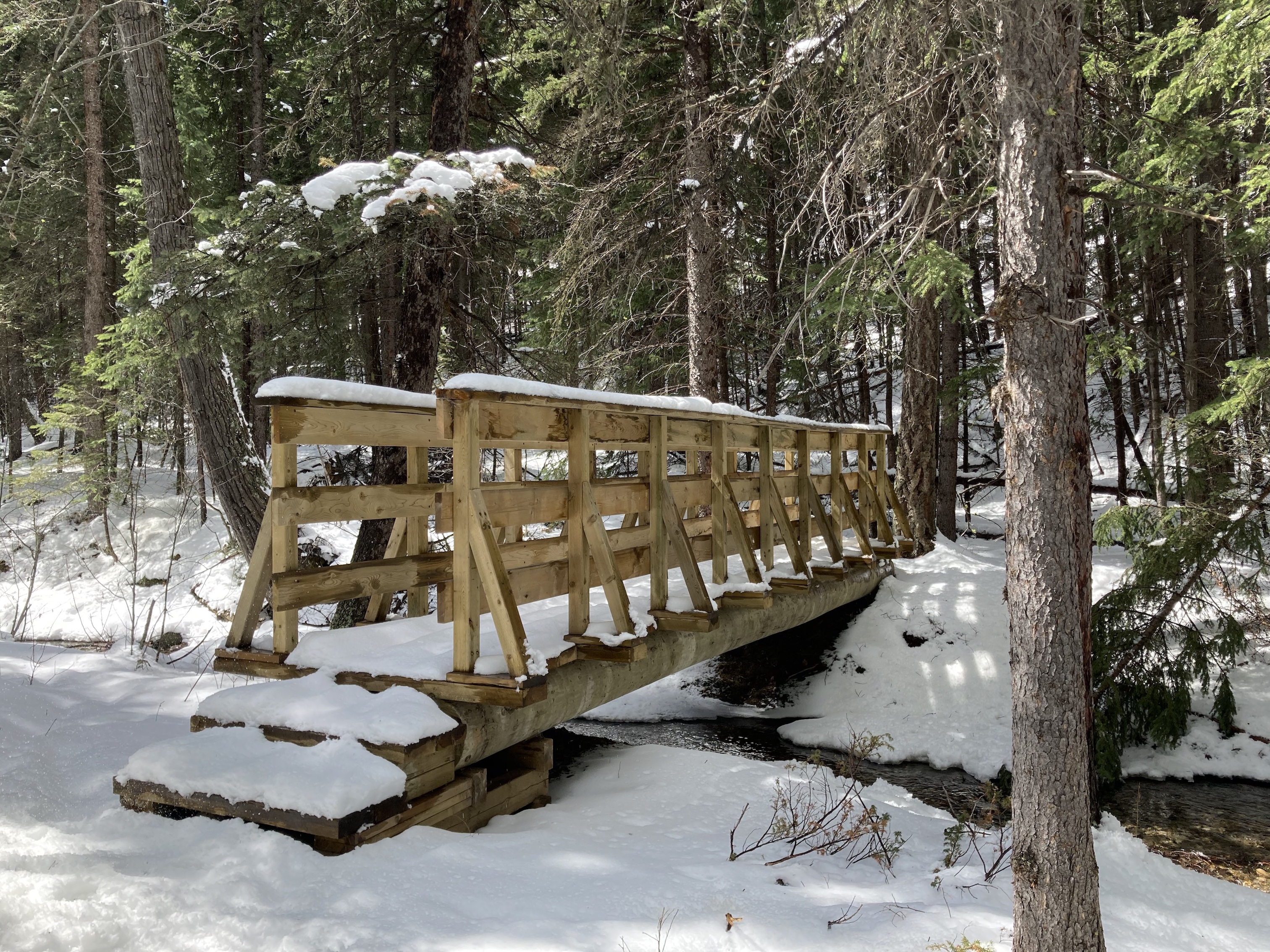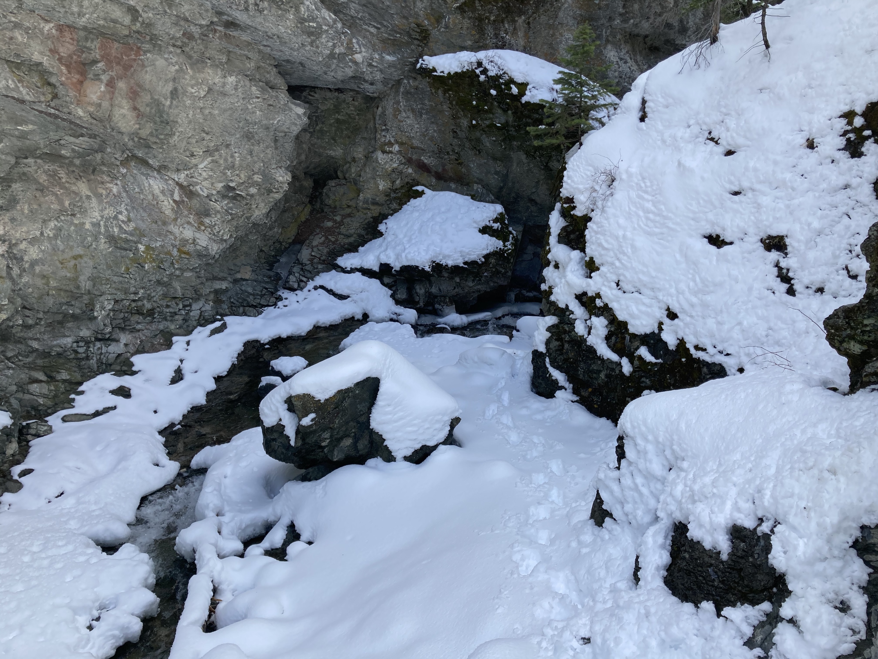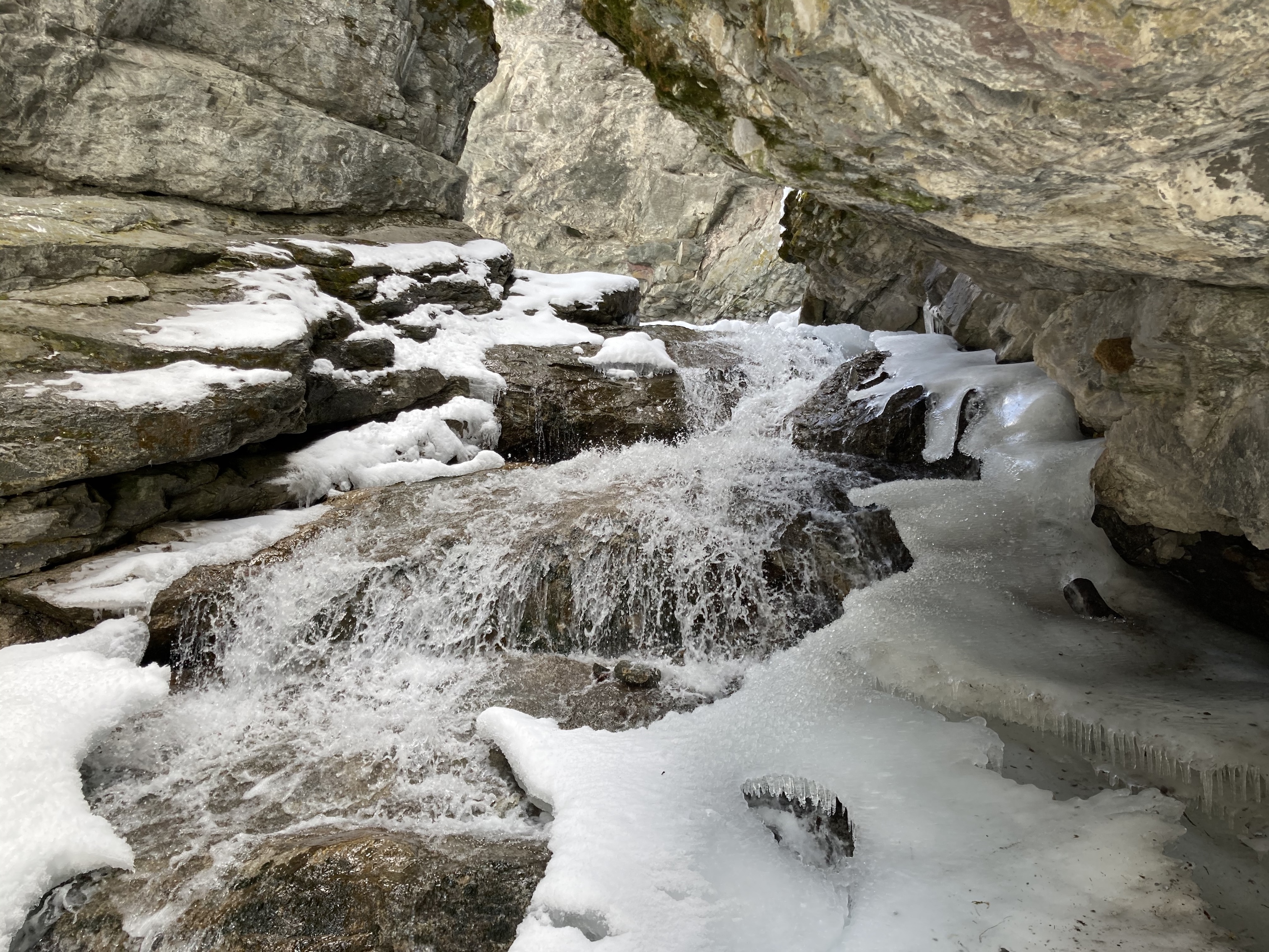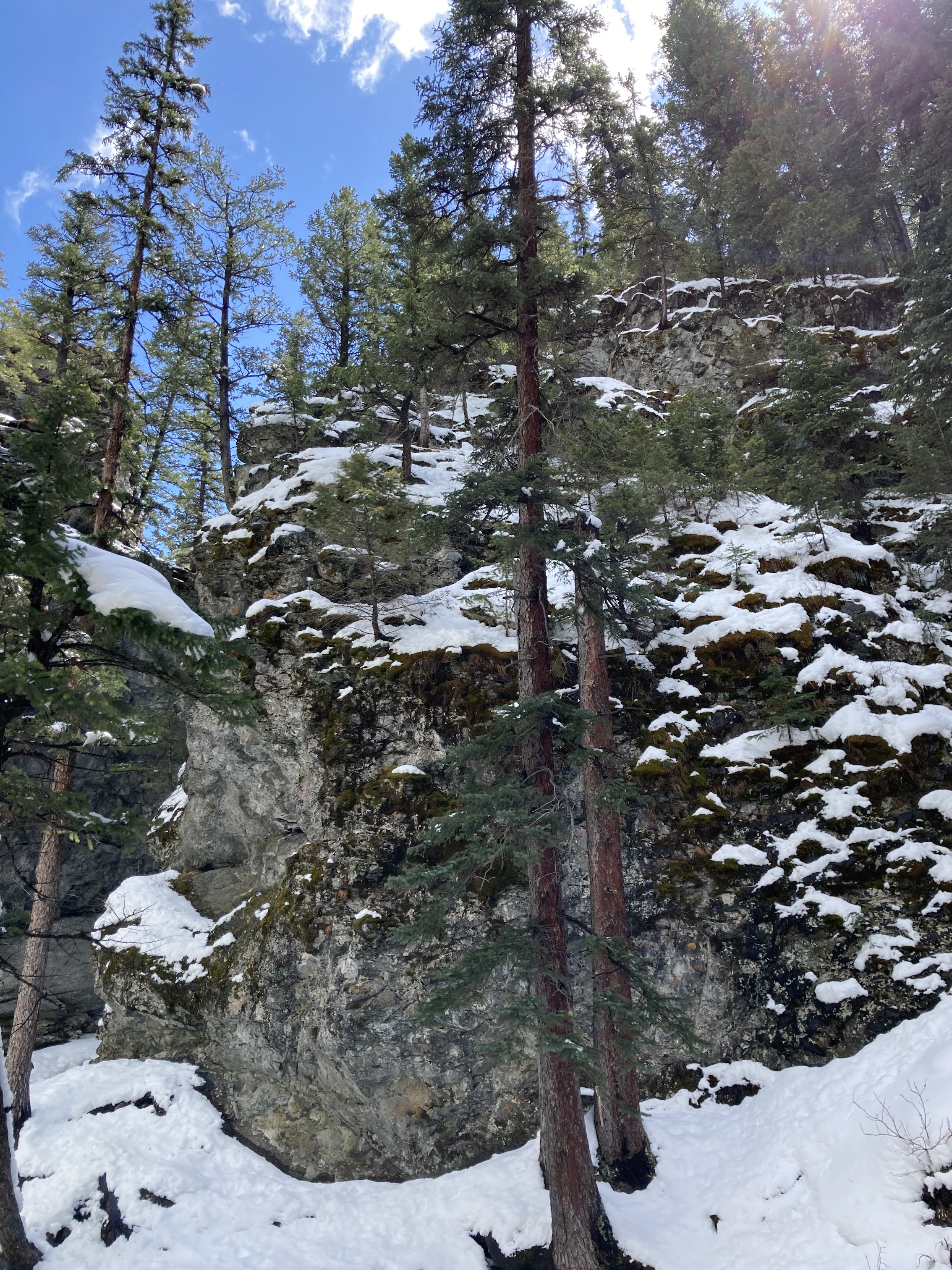 Star Creek Falls is a picturesque waterfall accessible by a short trail. There’s a satisfying loop route – which I suspected during my first visit with my daughter, and confirmed during a 2nd visit on a snowy spring day. The trip is featured in Nugara’s 2021 Popular Day Hikes: The Castle and Crowsnest. His description doesn’t include the loop route, likely because the bridges making the loop possible are relatively new. There’s also the option of following Star Creek up the canyon to the foot of the waterfall itself. This is a trickier path to follow and not for little kids, but it’s popular enough that someone has fixed a chain in place to help hikers along their way.