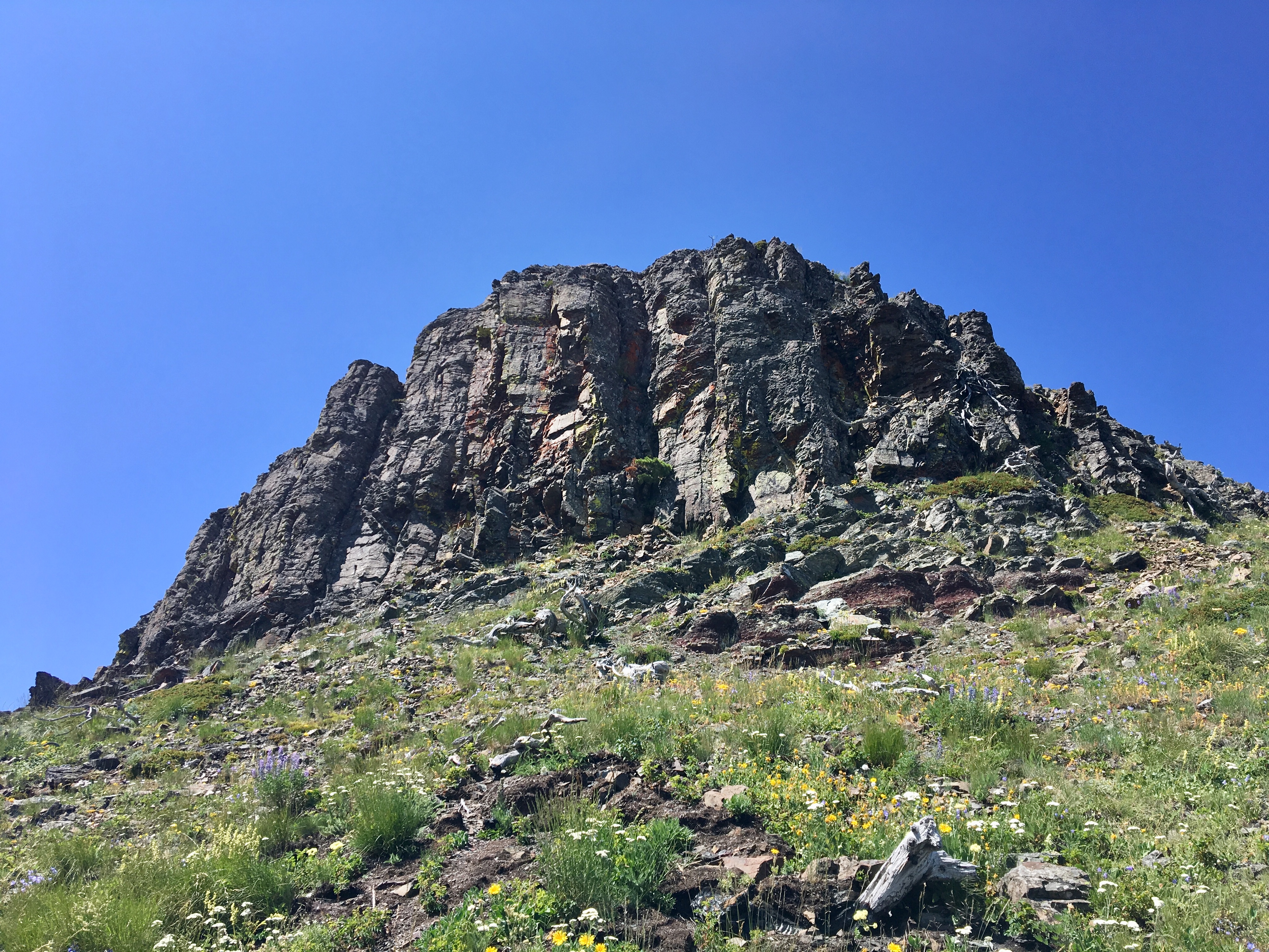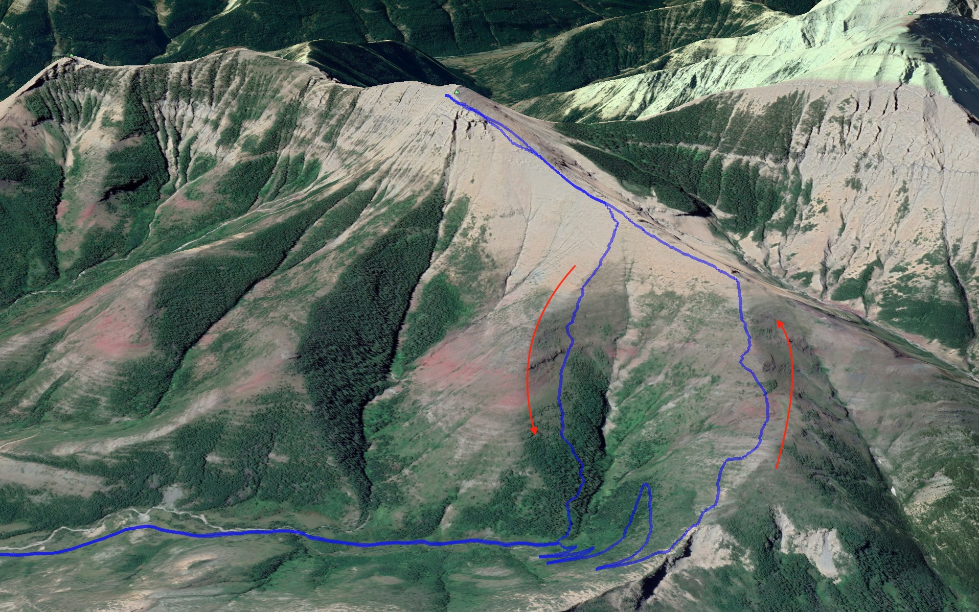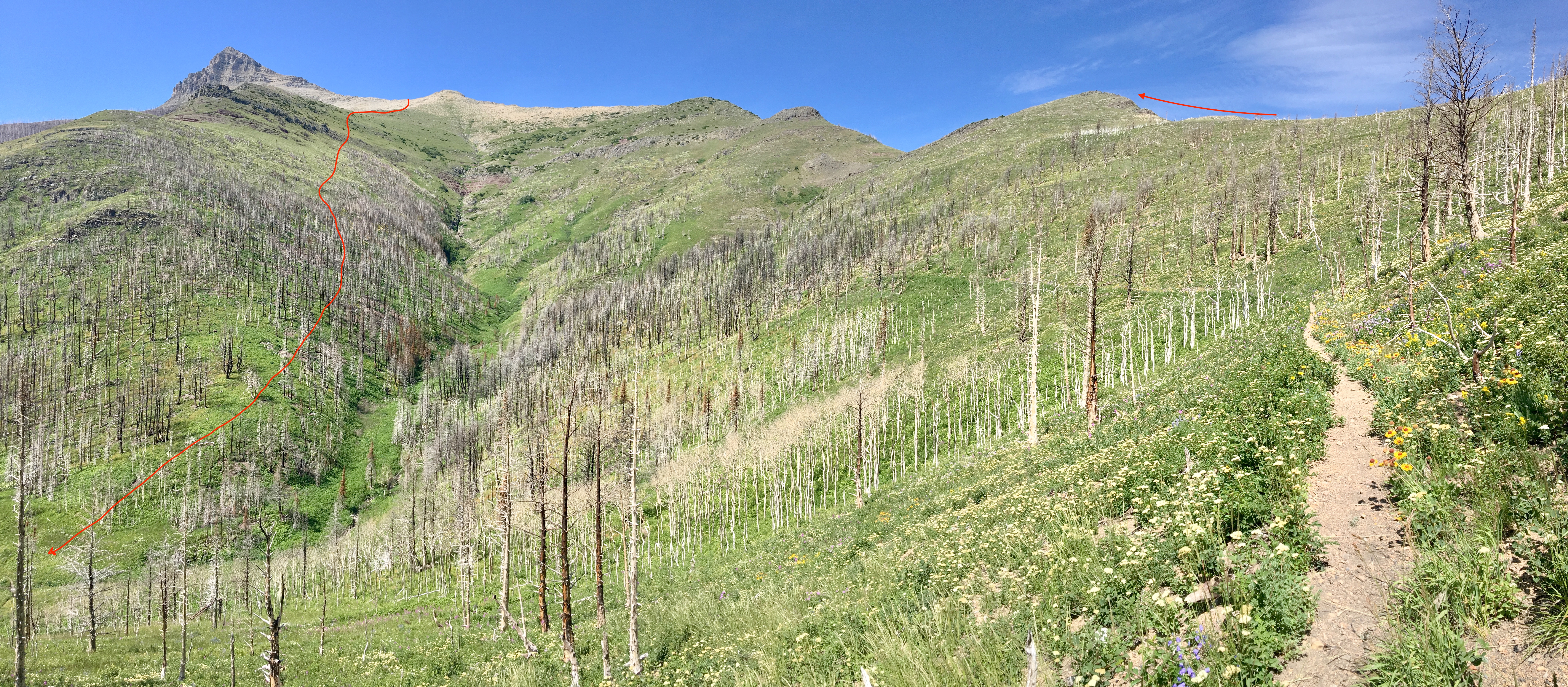 Looking down the descent route. The only thing to keep in mind is that there’s a low cliff band to avoid on the immediate left of the ridge in the mid-ground. I stayed on the ridge, then dipped left to pass through the green area between the burned trees and the dark rocks.