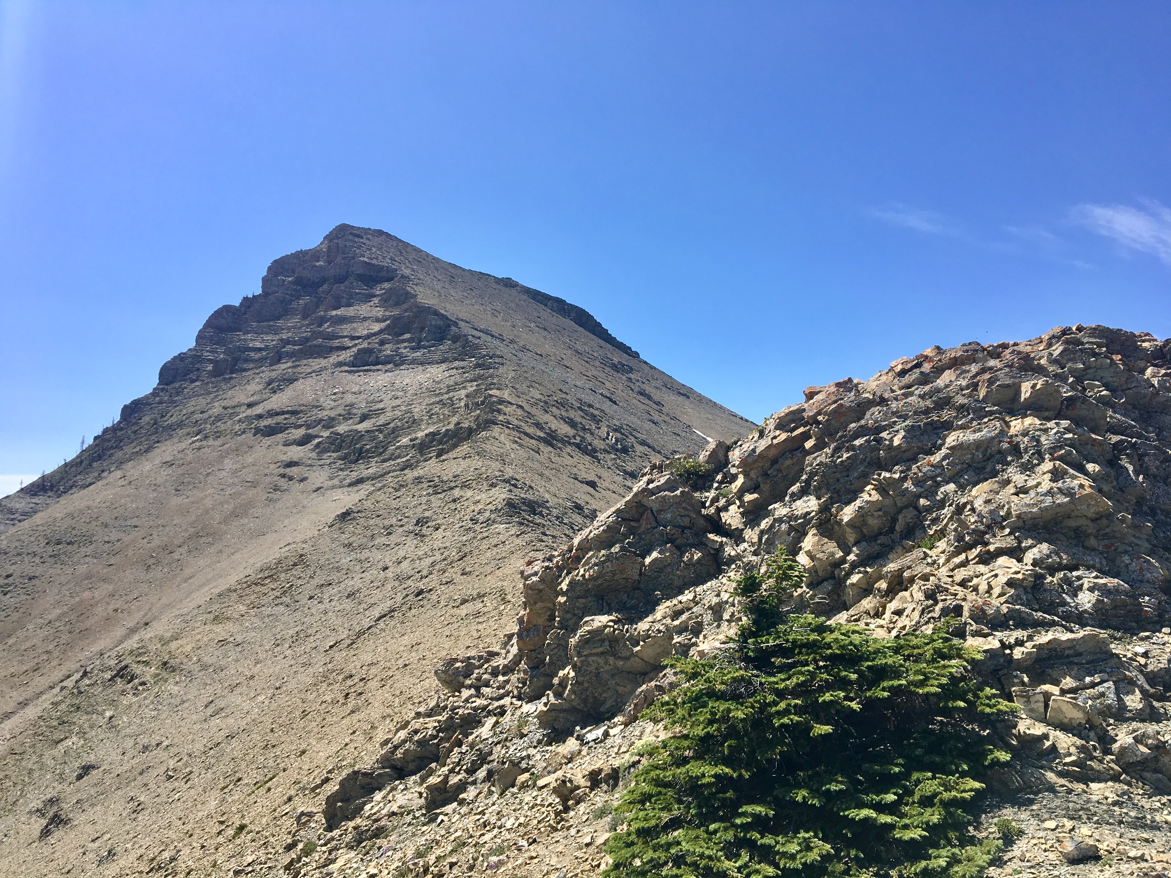 Close to the summit, with Mount Galwey’s peak to the left. It was a calm day, so I wasn’t too worried about walking along the ridge. It’s a sheer drop to the left, though. If it was a typical windy Waterton day I would have stayed well to the right.