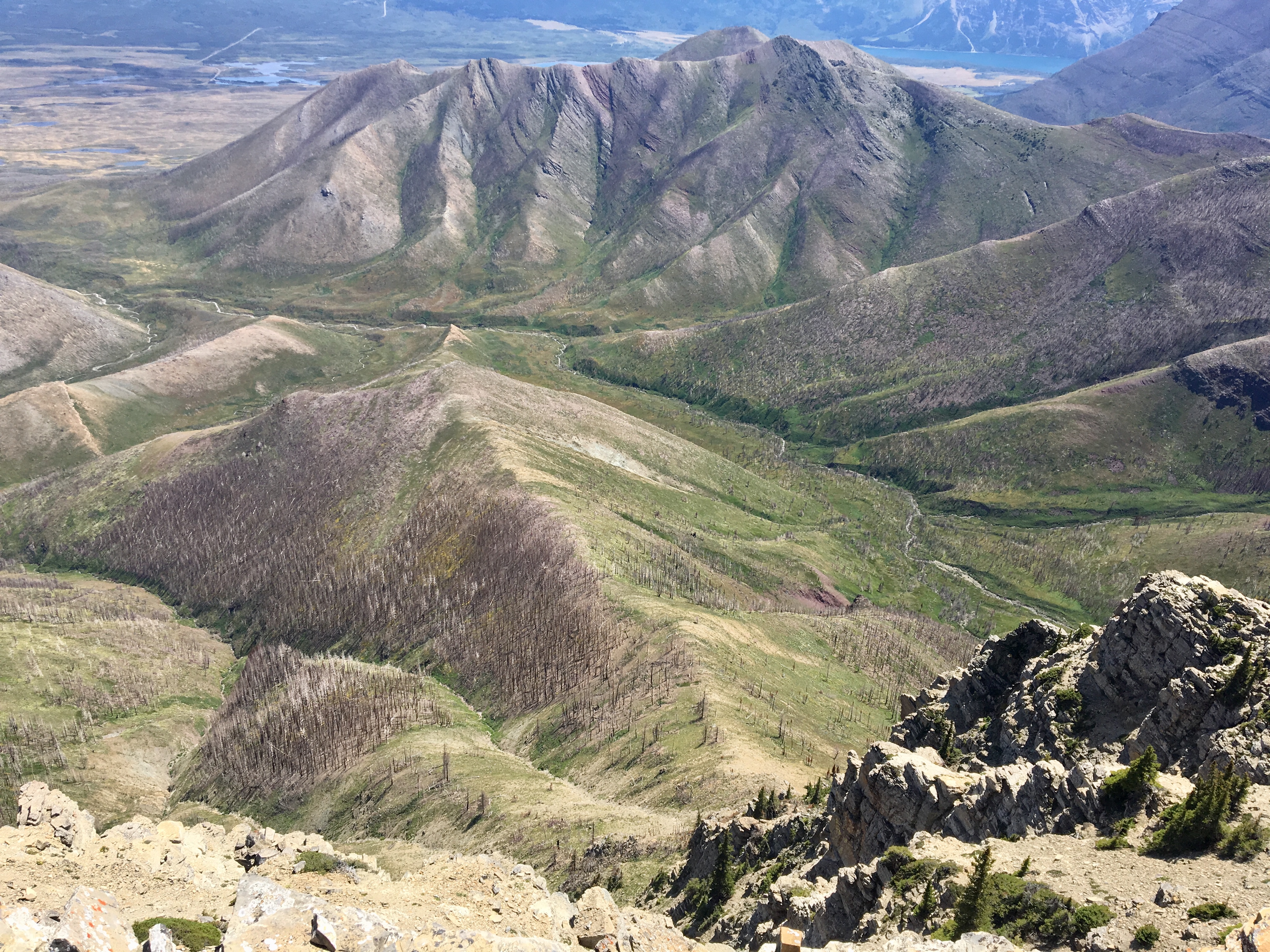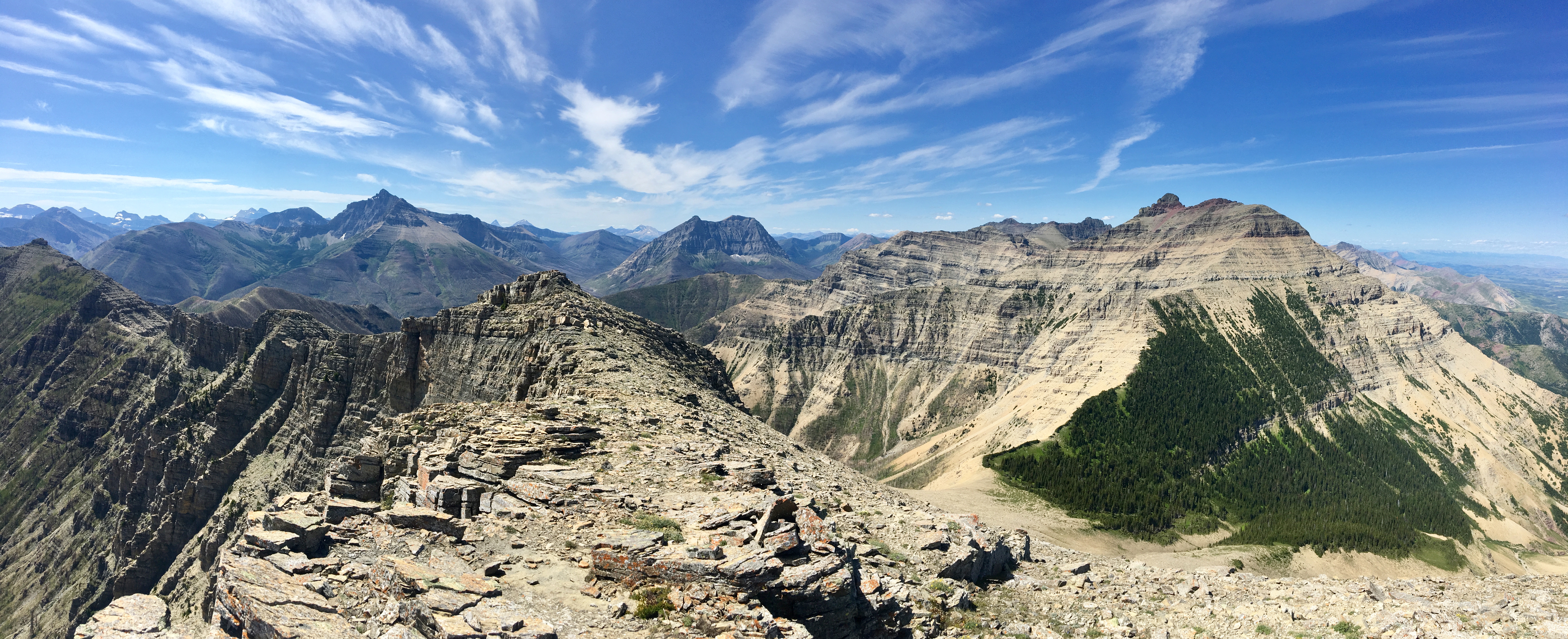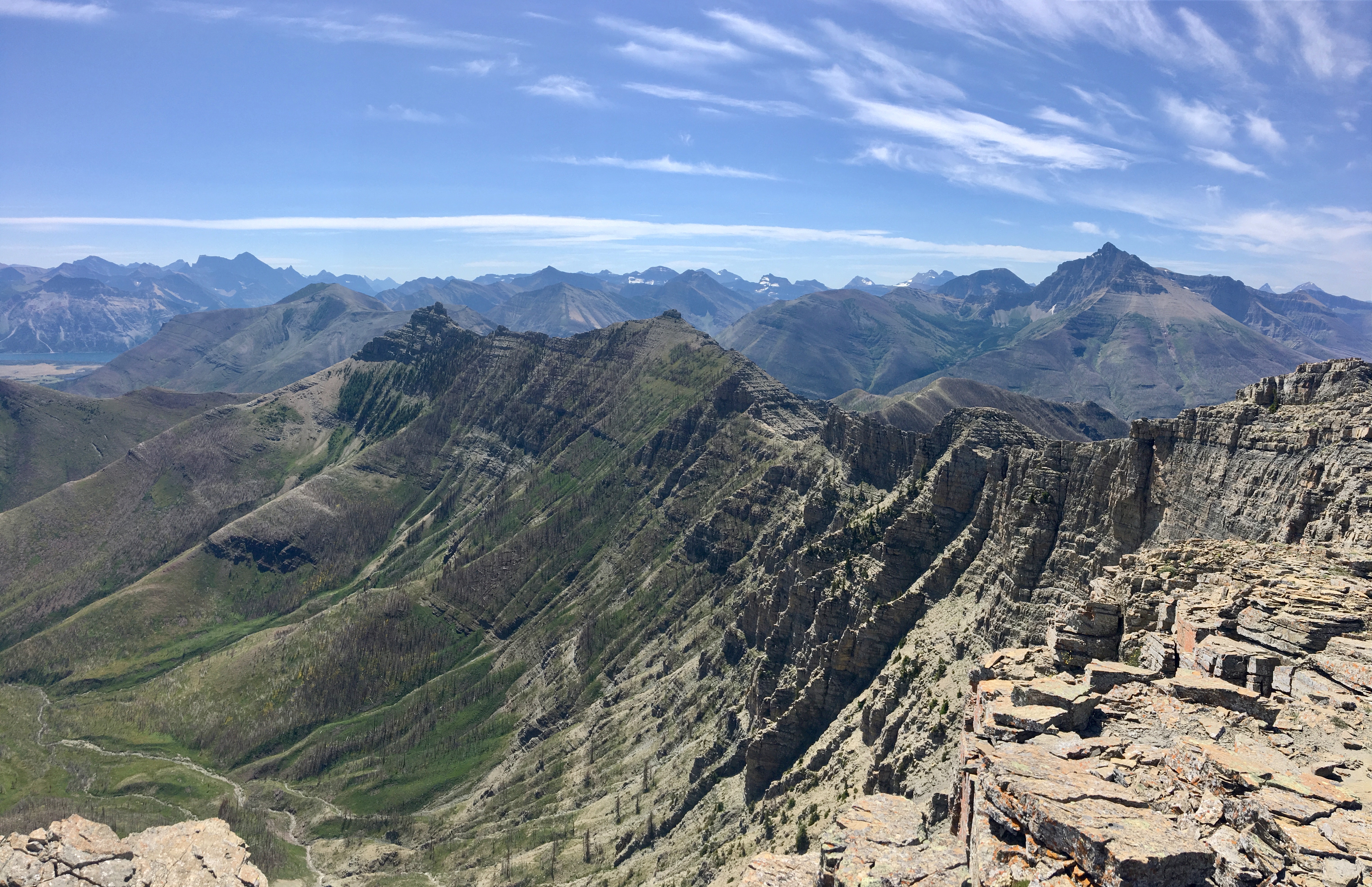 Looking south to the ridge connecting Rogan Peak to Mount Galwey. Mount Blakiston is in the background on the right. Glacier National Park’s Mount Cleveland is in the far background, top-left.