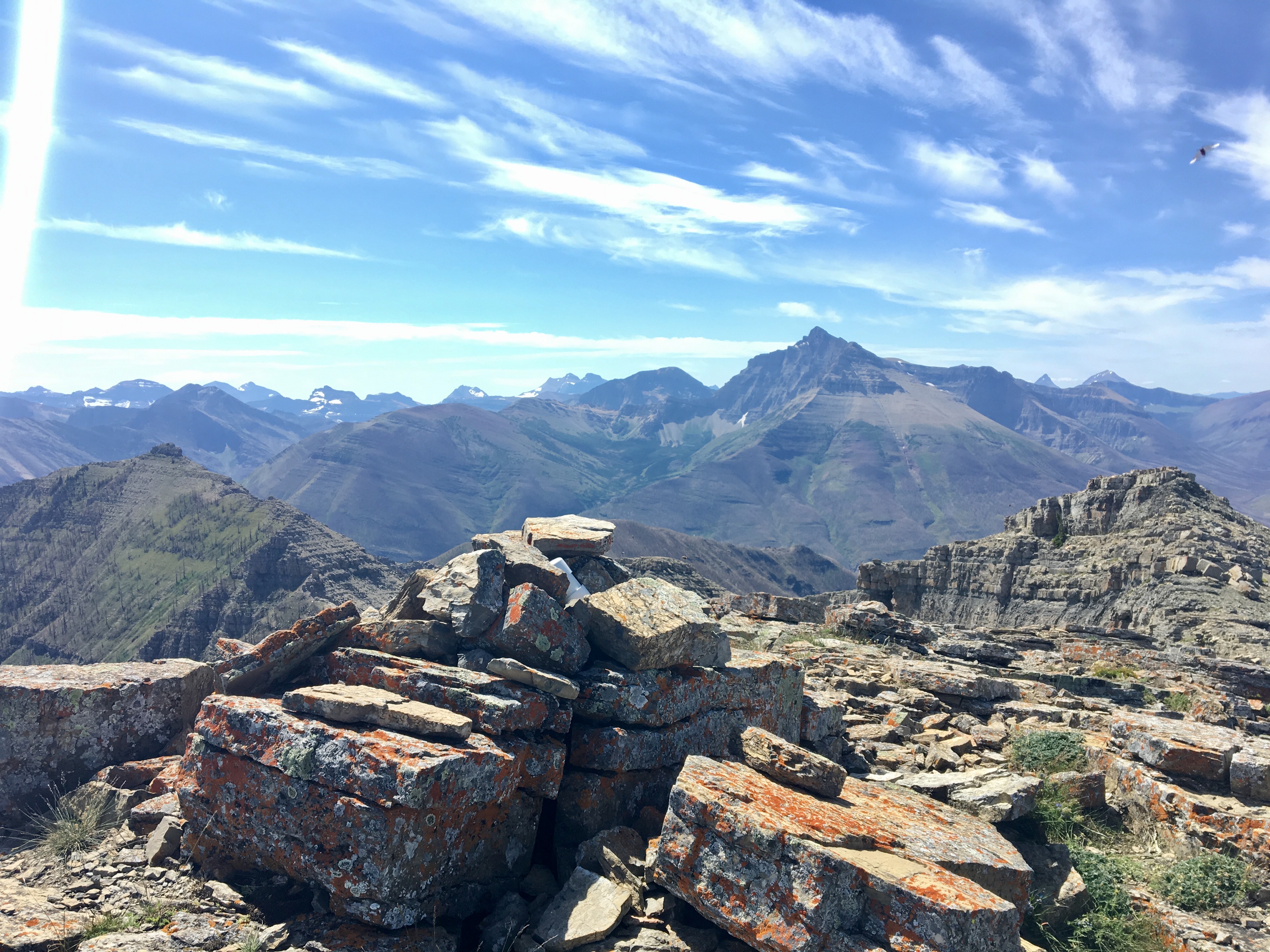 The summit cairn of Rogan Peak. Mount Blakiston, Waterton’s tallest peak, is in the background.