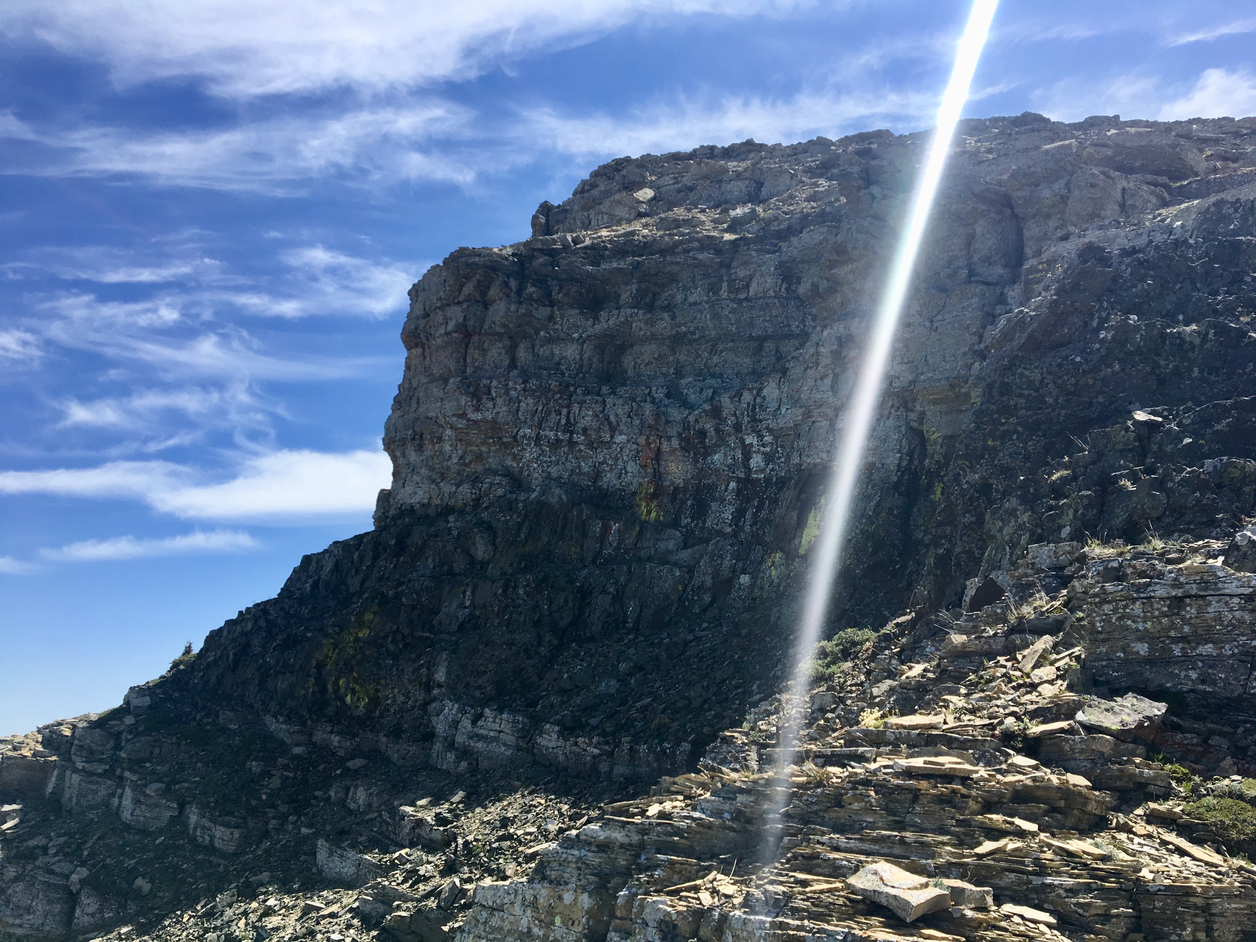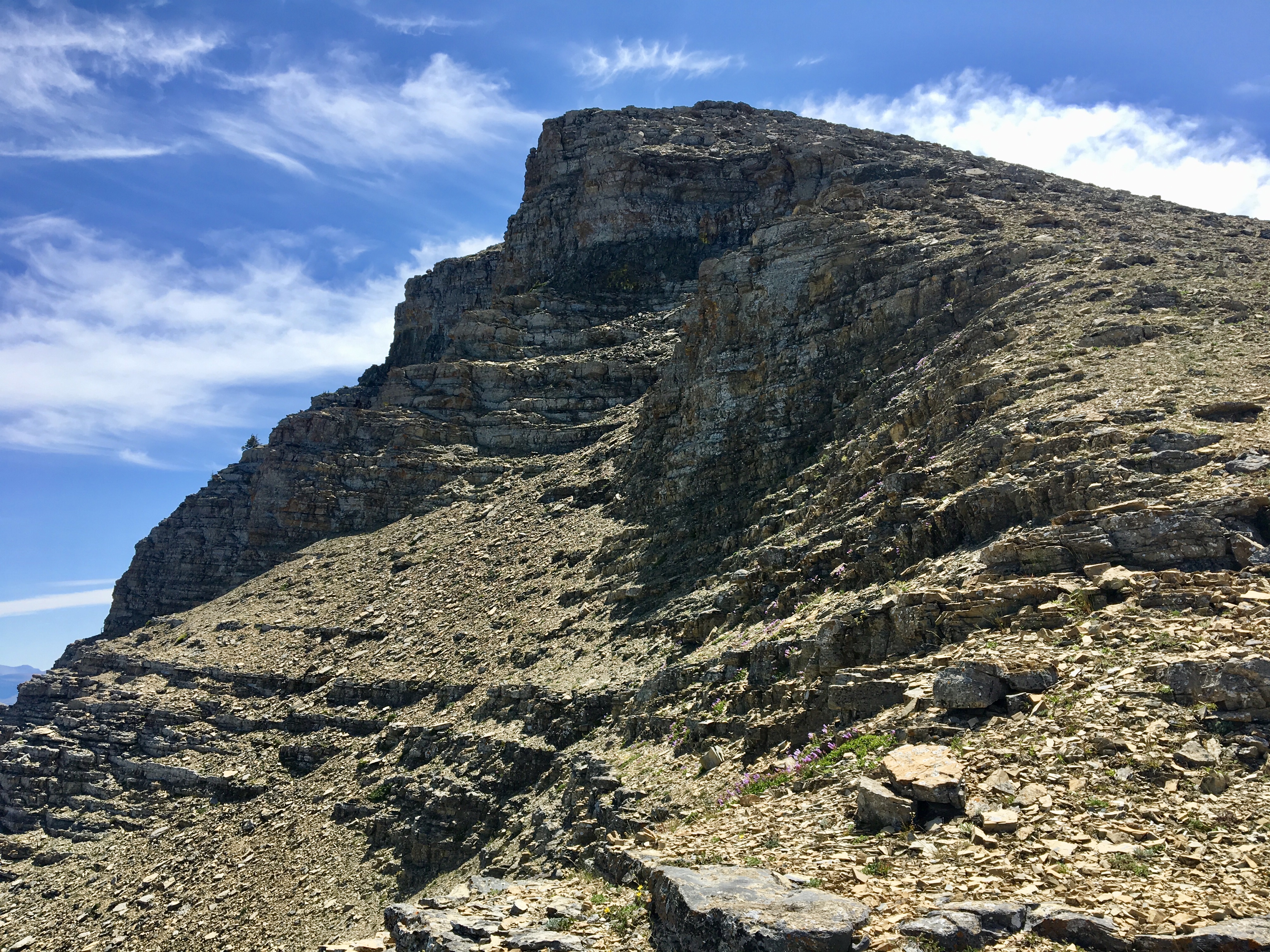 Nearing the summit. A dark stratum of rock is visible just under the summit. I think this is part of the Purcell Sill, an igneous intrusion that is seen as a dark strip across many of the mountains in Waterton and Glacier.