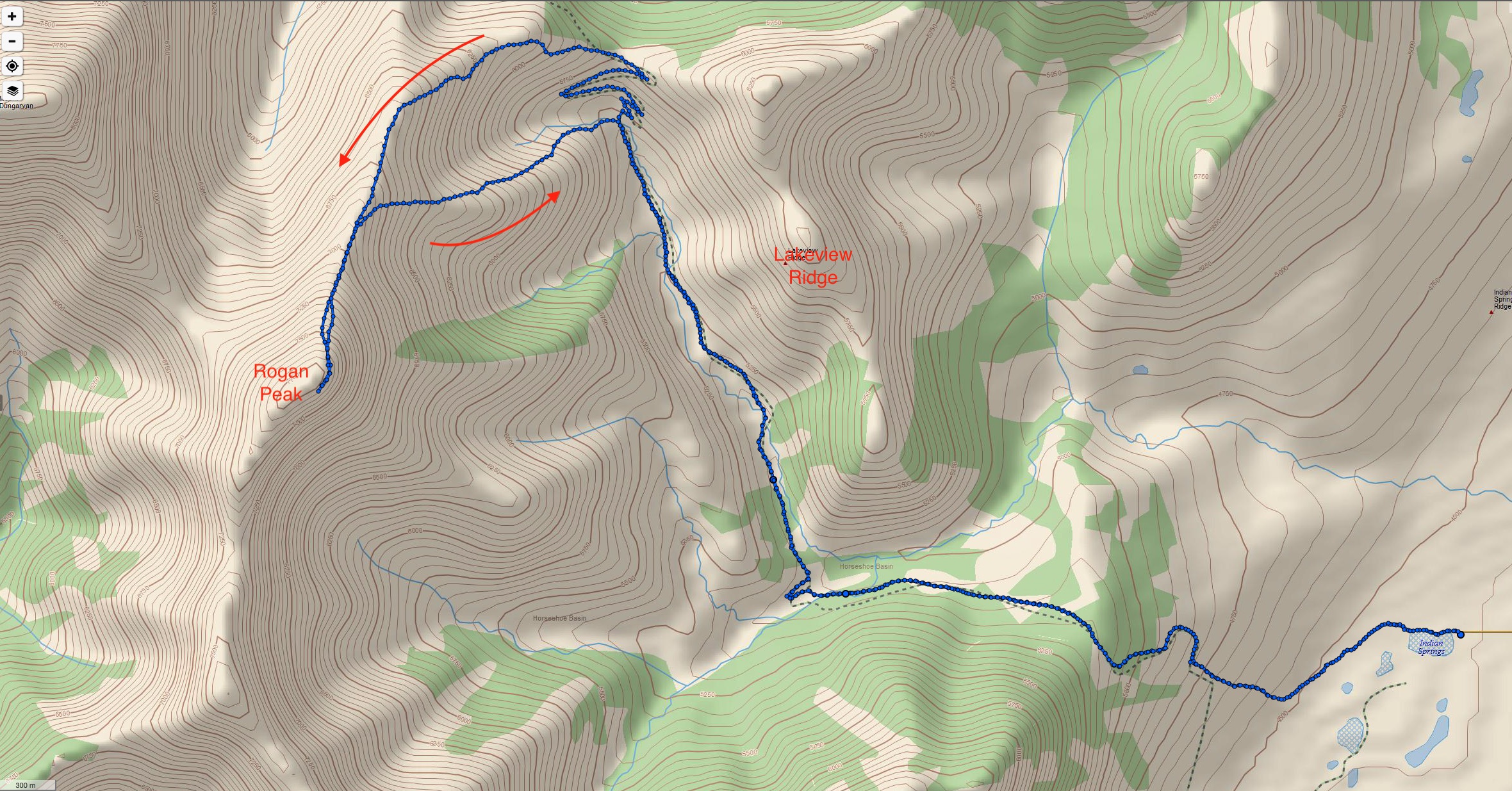 Getting to Rogan Peak involves following the Horseshoe Basin trail clockwise, eventually reaching the switchbacked ascent of the col between Lakeview Ridge and Rogan Peak. This is about 6.5 km of easy hiking with some elevation gain getting up into Horseshoe Basin. From the base of the switchbacks, Nugara points out that there’s a rounded spur that climbs due west and up to the ridge line from that spot. It didn’t look like a good way to ascend, but I kept it in mind for my descent. Instead, I stuck to the switchbacks and climbed to the col. From the top of the col, I turned left and followed the ridge all the way up to the summit. No route-finding was involved. The few rocky bands that are encountered on the ridge can be scrambled over, either head-on or at easier spots that are found after traversing slightly left.