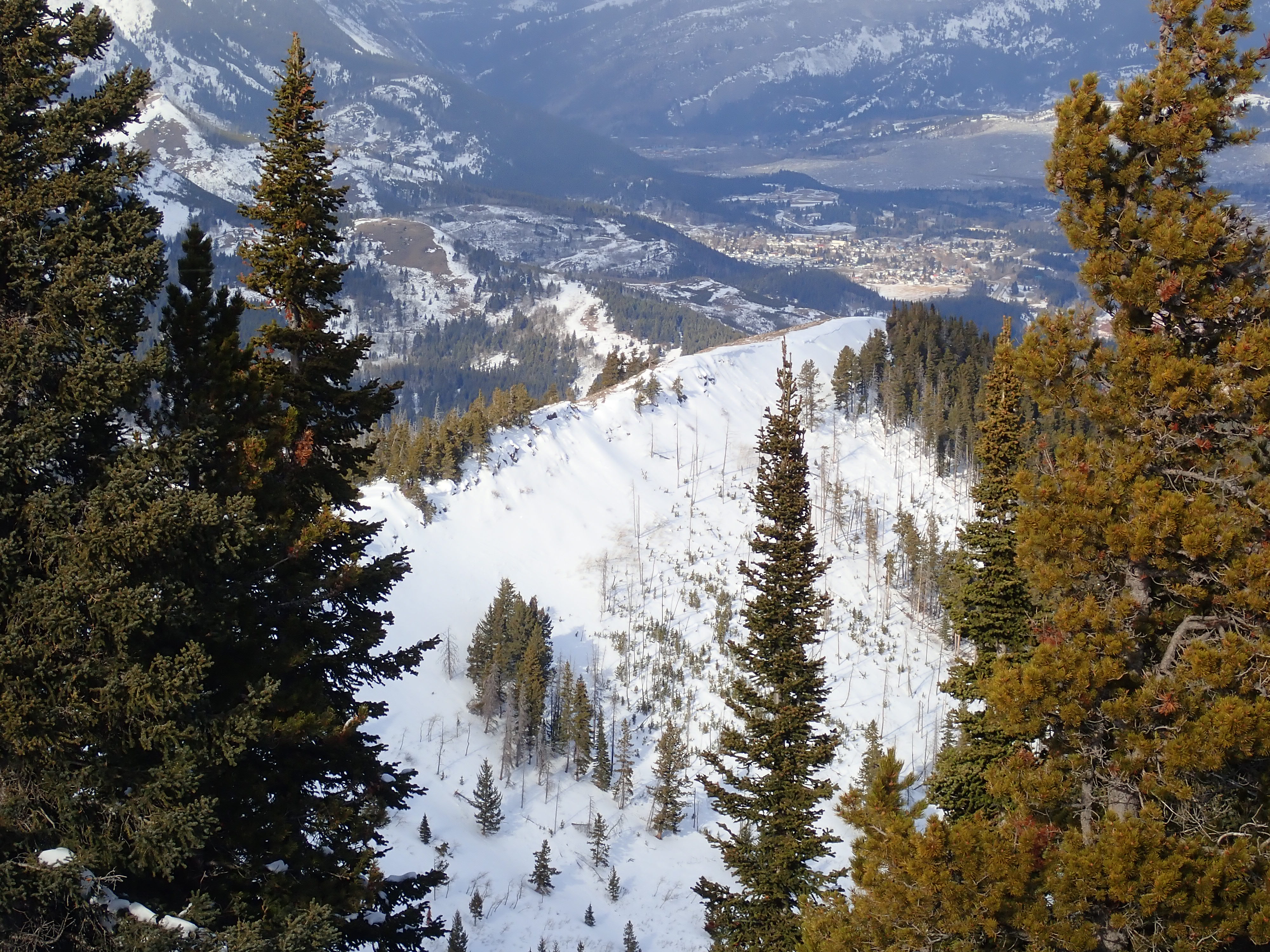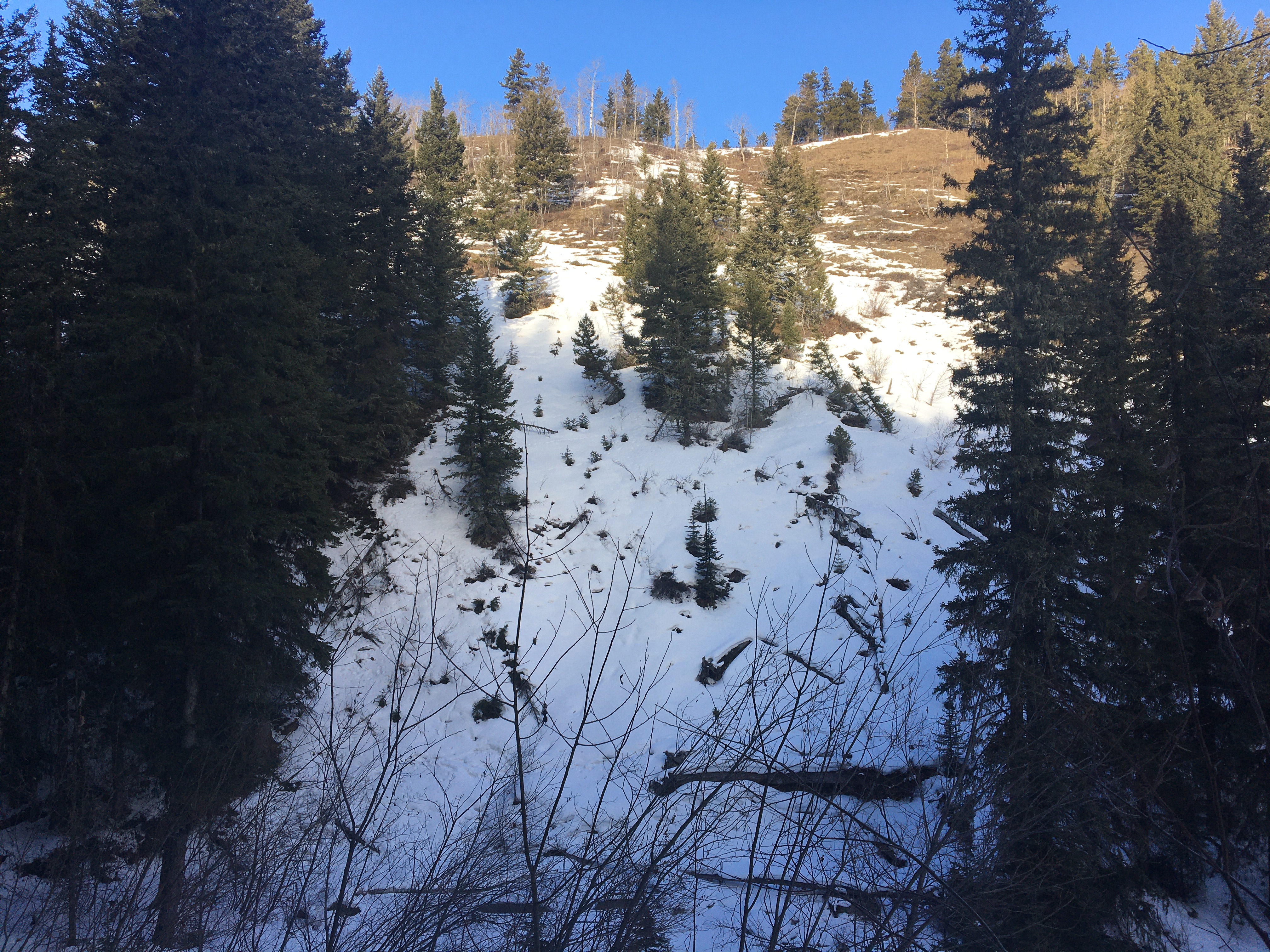In any event, I found my way through the trees, navigating around a snow-choked gully and eventually made it to the ridge. The gully was a pretty clear hazard, and there was even some whumph-ing as I climbed around, staying up on one edge of it.