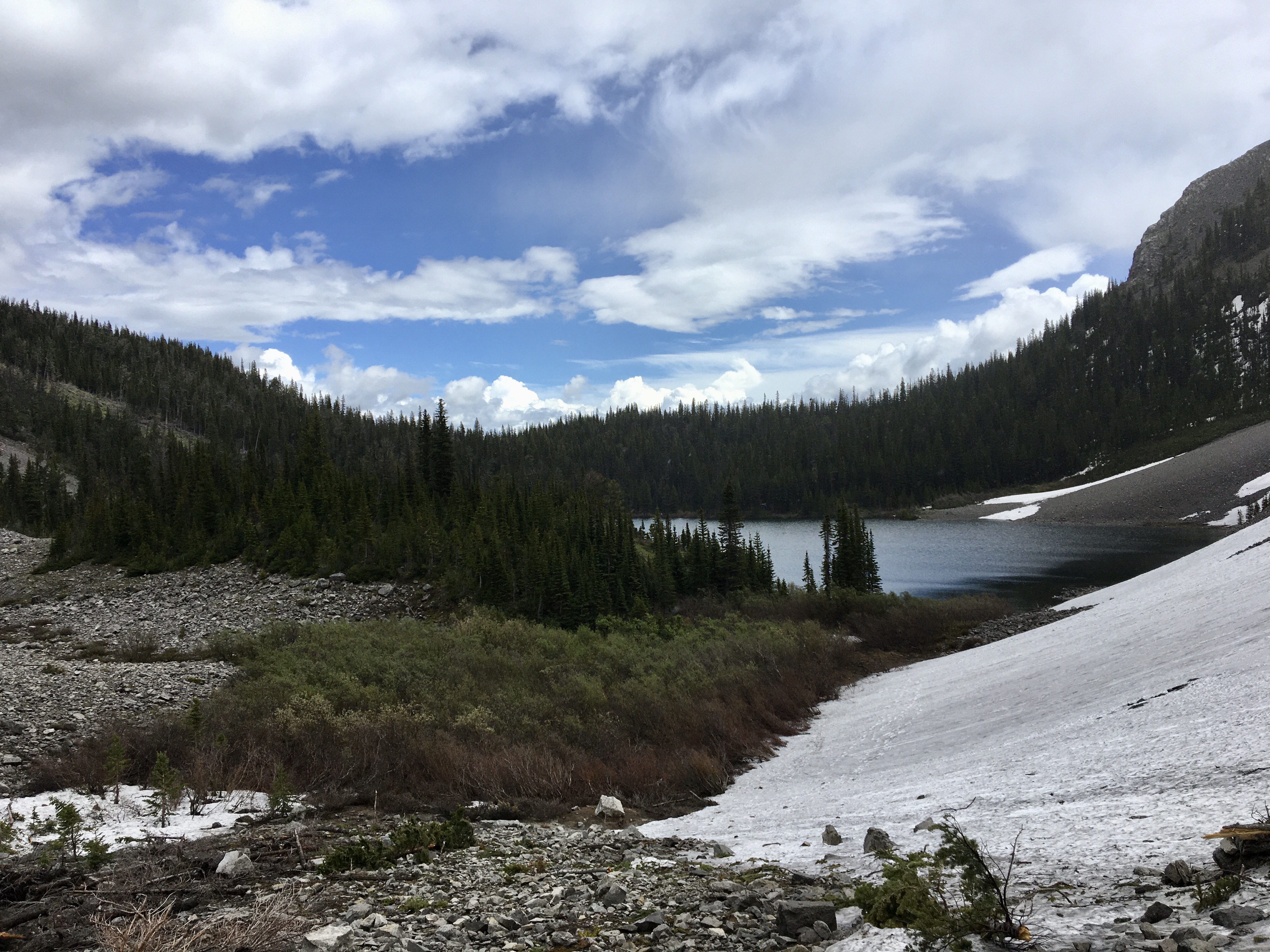 About 2 years ago I paid my first visit to Window Mountain Lake in the Crowsnest Pass. At the time, I had a look across the lake to the start of the Mount Ward scrambling route. It was May, so there was still quite a lot of snow on the slopes. My legs were tired from biking in on the Atlas Road, so even without the snow I didn’t think I could manage the ascent and I left it for another time. Two years later, on the first day of summer, I decided to return to the lake and take a shot at summiting Mount Ward.