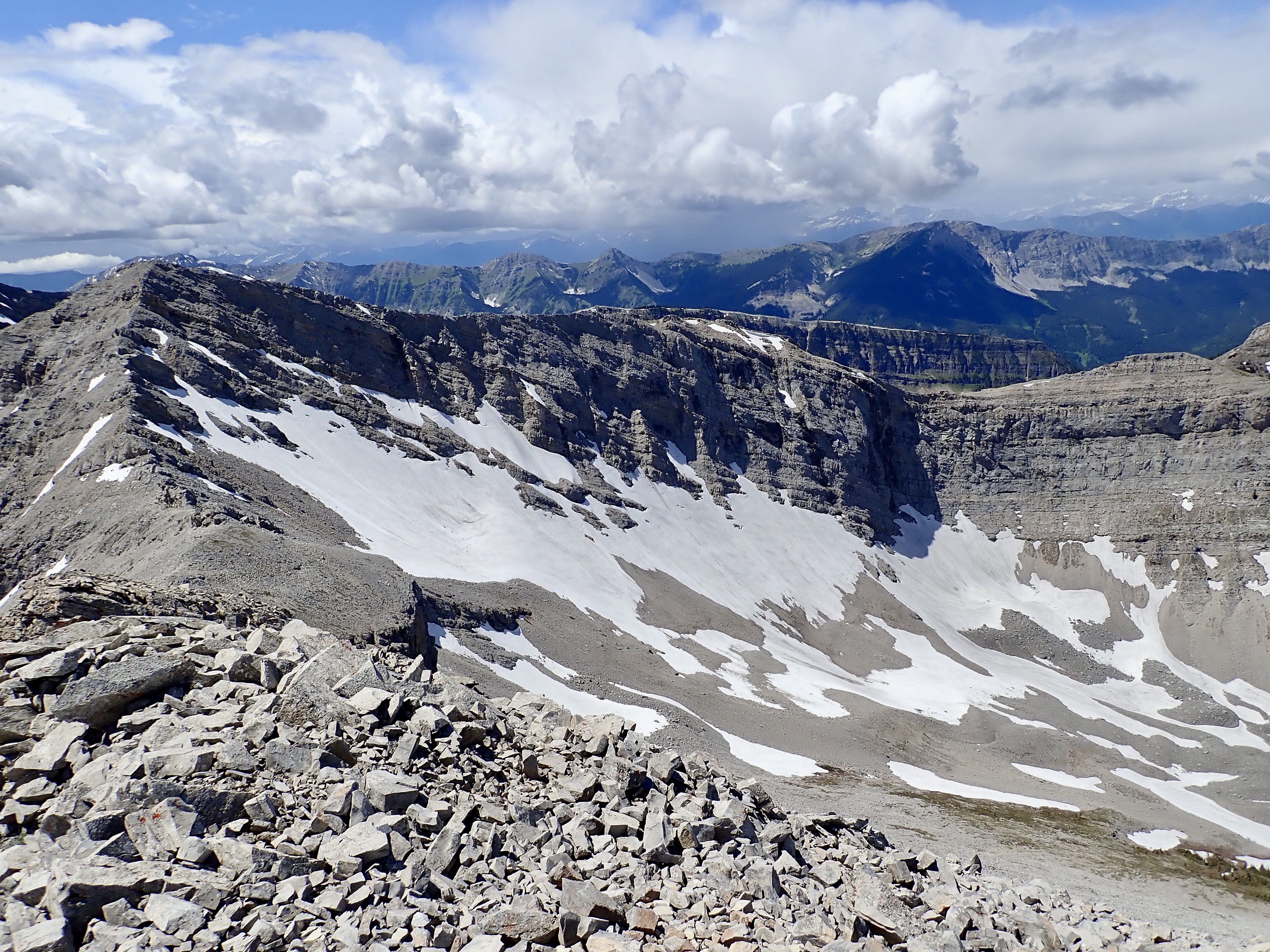 Once on the col I was treated to an amazing view looking south across an adjacent valley. Directly across the valley was the rock window of Window Mountain. Crowsnest Mountain and Seven Sisters were clearly visible in the distance. Allison Peak was to the south west.