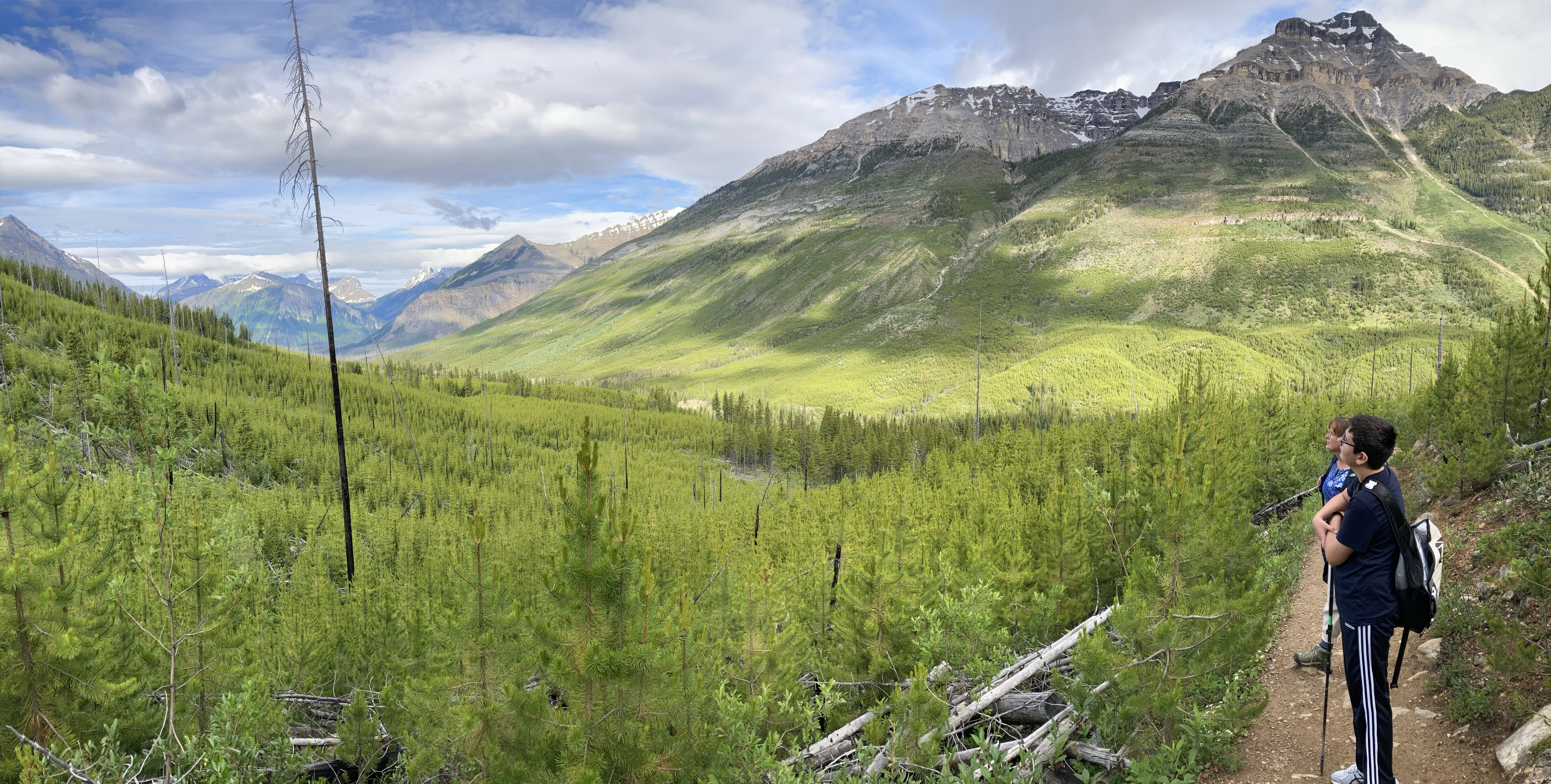 Access is via Hwy 93. A turn-off about 3.4 km southbound from the Alberta/BC border leads to a parking lot with an information kiosk and pit toilet facilities. Click here for the Google Map. The trail starts off by crossing a sturdy bridge over a broad creek before gently switch-backing up towards the deeply carved hanging valley below the Stanley Glacier. The region has experienced some major fires over the years, which has resulted in a refreshingly open feeling while hiking up the first part of the trail. Rather than being hemmed in by an old, tall forest, the trail is surrounded by short young trees. The air moves freely and the views are largely uninterrupted.