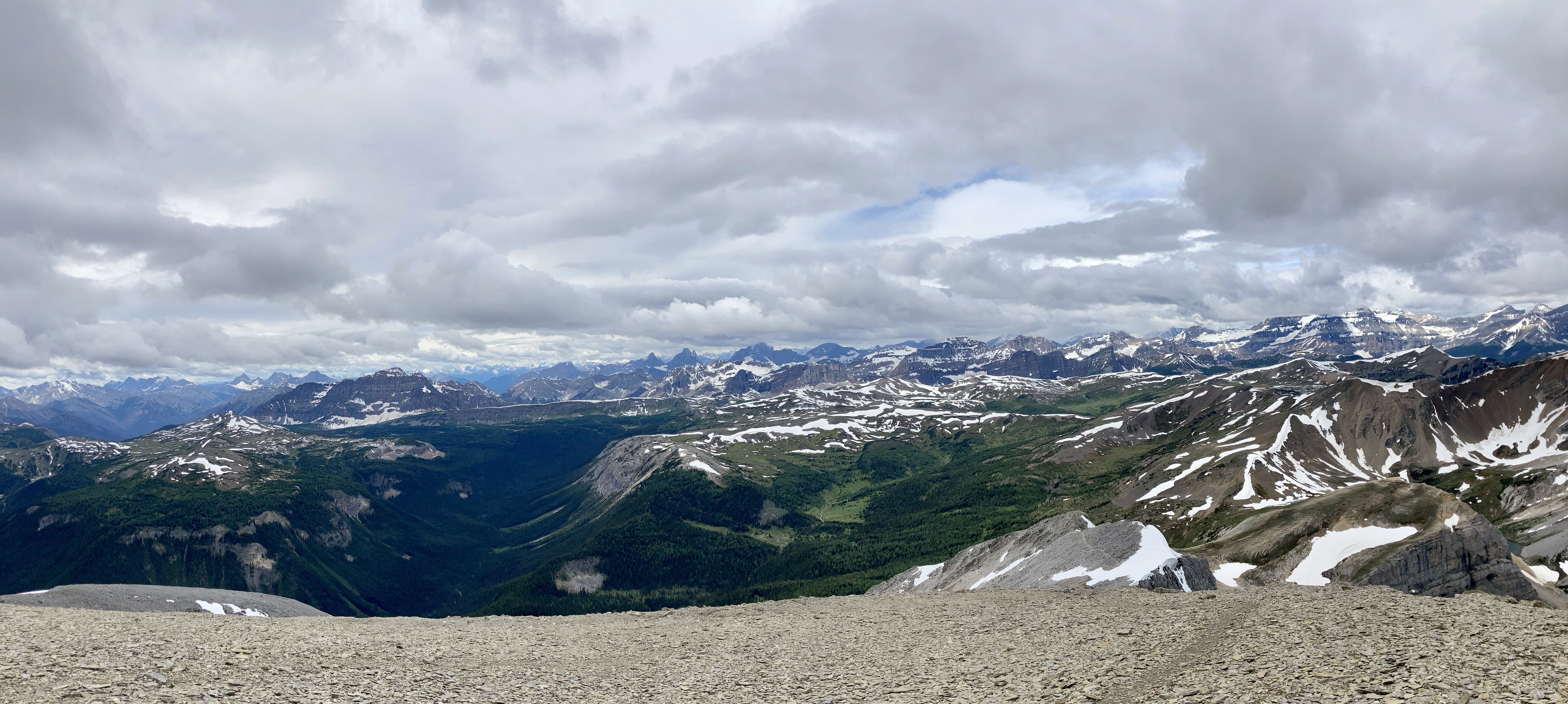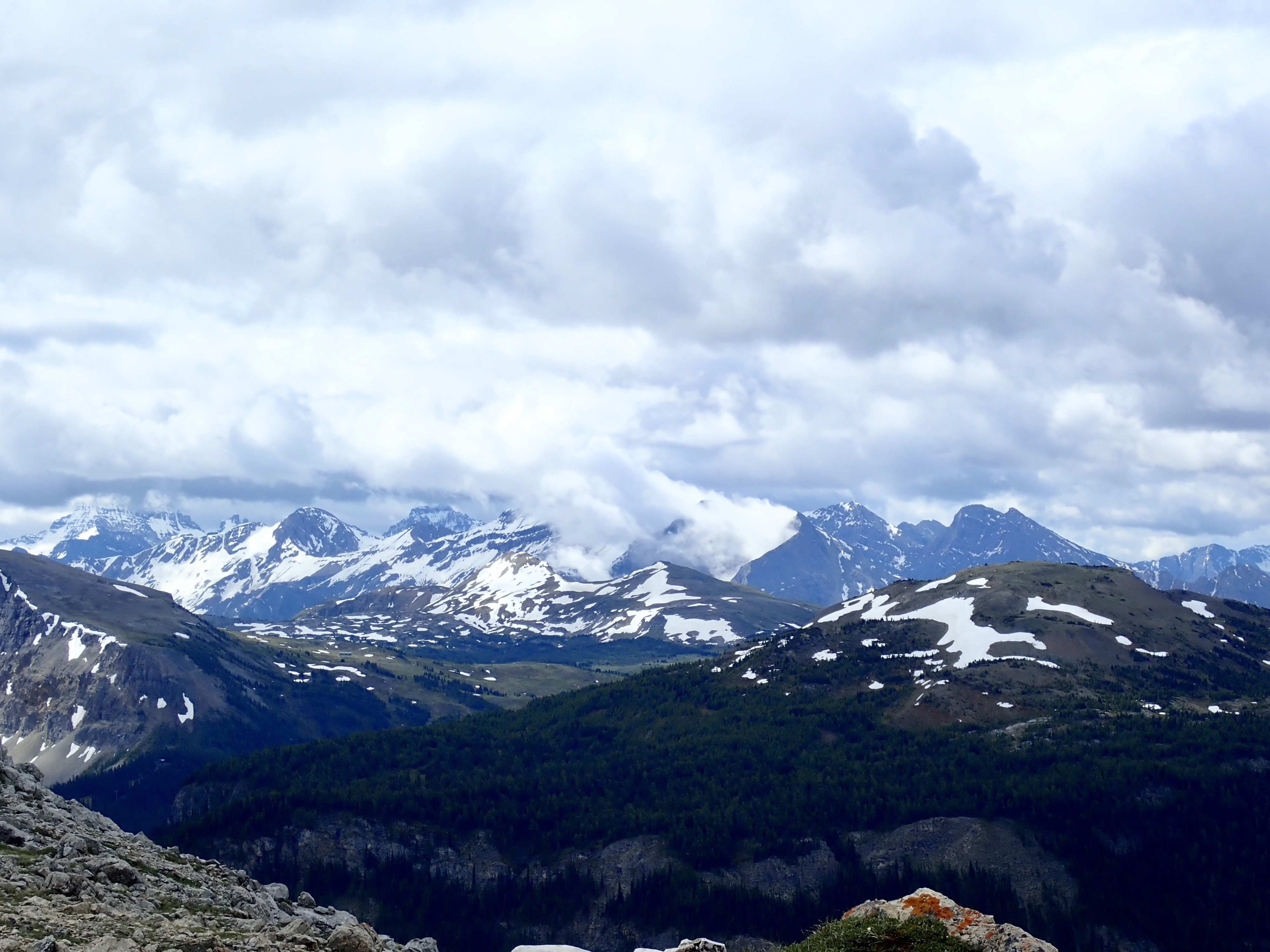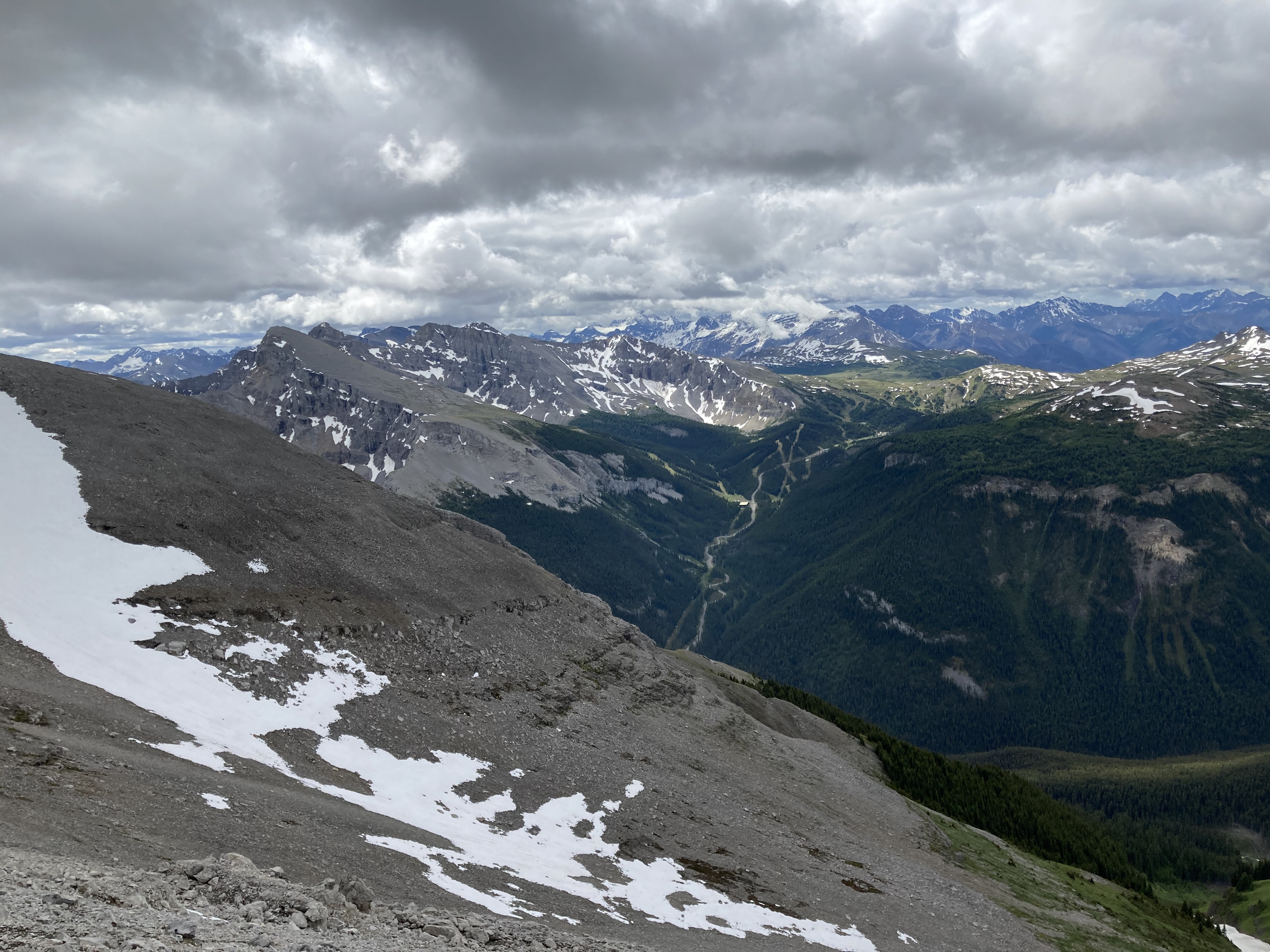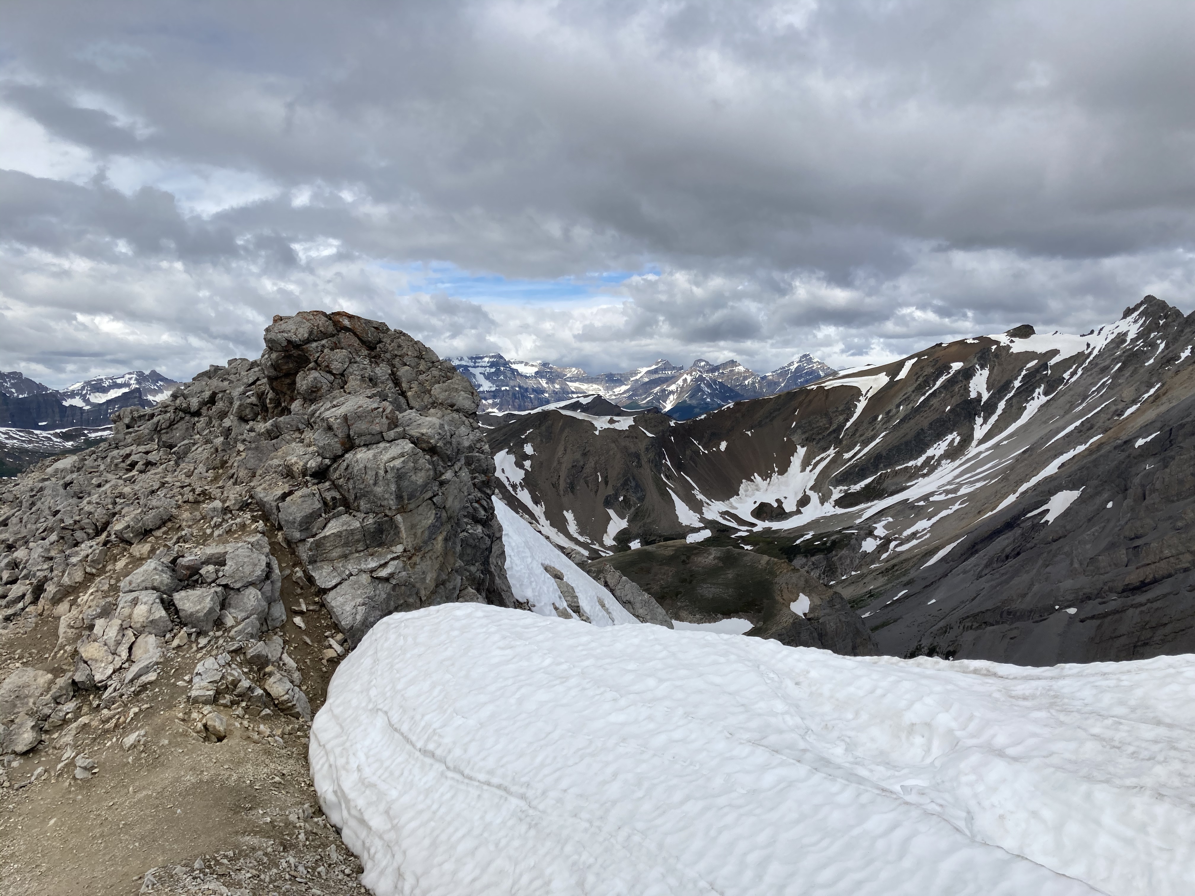 Route overview, looking east. Harvey Lake in Harvey Pass is bottom-centre.Mount Bourgeau as seen from my hotel.Early morning starts are the best.A little further along the trail, looking back.The second creek crossing, below a cascade descending from Lake Bourgeau’s basin. The flow was pretty brisk, and the water was actually fairly deep. Hiking poles were very handy here.Nearly to the lake. Mount Bourgeau’s cliffs are straight ahead. The way to Harvey Pass is the notch on the right.Lake Bourgeau.One of the many little waterfalls among the cliffs.Lots of marmots can be seen in the rocks around the lake.Past the lake now, climbing to the next hanging valley.A look back down toward the lake, and Mount Bougeau’s summit.After the initial climb, the trail goes past this little lake and you can see it continuing up the low headwall beyond.At the top of the headwall, looking southeast where the trail continues up to Harvey Pass. Several little streams trickled around in this meadow from little ponds and tarns.Looking north from the same spot. A little creek was running down from yet another distinct level of the valley. There wasn’t any standing water up there, just rocky ground with runoff going under it.Looking back at the meadow from where the trail starts the final ascent to Harvey Pass.Harvey Lake and Harvey Pass. Mount Assiniboine in the distance. The natural framing of the scenery is uncanny. I took this shot as I descended. When I was ascending, the clouds obscured Assiniboine and I was completely oblivious that it was out there.Telephoto shot of Mount Assiniboine.Harvey Pass panorama.Telephoto shot of a peak in the distance. The wind was blowing right to left, and clouds were being generated along the ridge, drifting continuously away and obscuring Mount Assiniboine (the bottom part of which is visible to the left).From Harvey Pass to the summit, the way is obvious. There’s a boot-beaten trail that’s visible the whole way up. Aside from a couple of rubbly areas it’s just a steep hike. It was roughly 50 minutes from here to the summit, moving briskly.Some cornices along the way. Looking to the right during the climb – buildings and ski runs of the Sunshine Village ski area are visible.This mountain adventure is brought to you by Superior Propane.The summit marker. The deceptively inviting snow beyond it is a giant cornice.I traversed over a bit and looked back. See? Cornice.A short distance left of the summit marker, I found a rocky perch that allowed a view all the way back down to the lake, the trail, the meadow and the pass.A narrower view. The big peaks in the distance are part of the continental divide. The Stanley Glacier trail, where I’d been the day before, would be on the opposite slopes.Telephoto view of the trail ascending to the first little lake and beyond.Black Brett and Mount Brett.Summit panorama looking west.The northeast spur of Mount Bourgeau. Rain is falling in the valley beyond. The Banff townsite is in the distance.Looking east across the Bow Valley.The clouds very stubbornly wouldn’t move off Assiniboine while I was on the summit, but I could get a good feel for the smaller peaks surrounding the 3618 m monster.Another panorama looking west as I descended.Yet another panorama on the descent. The clouds thinned somewhat. Assiniboine is mostly visible in the far background on the left. The bigger peak in the background at centre-right is (I think) The Monarch. Sunshine Village is across the valley.Great snow and rock scenery.The clouds shifted again. Time for another panorama.Almost back down to the pass, peeking over the edge at the trail ascending to the 2nd set of lakes.A last look at the summit at day’s end. There’s a speck visible against the white sky almost dead centre (click and you get a full-res image you can zoom in on) – a gentleman who I passed on my way down. I had quite lovely solitude, which is unusual for this trail. The crowds are about 45 minutes behind him.