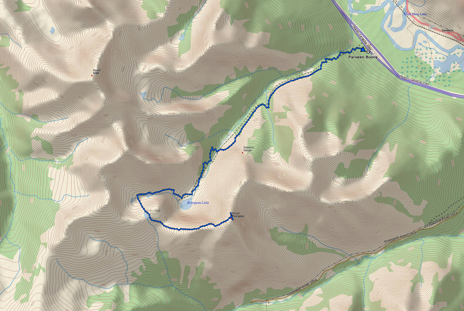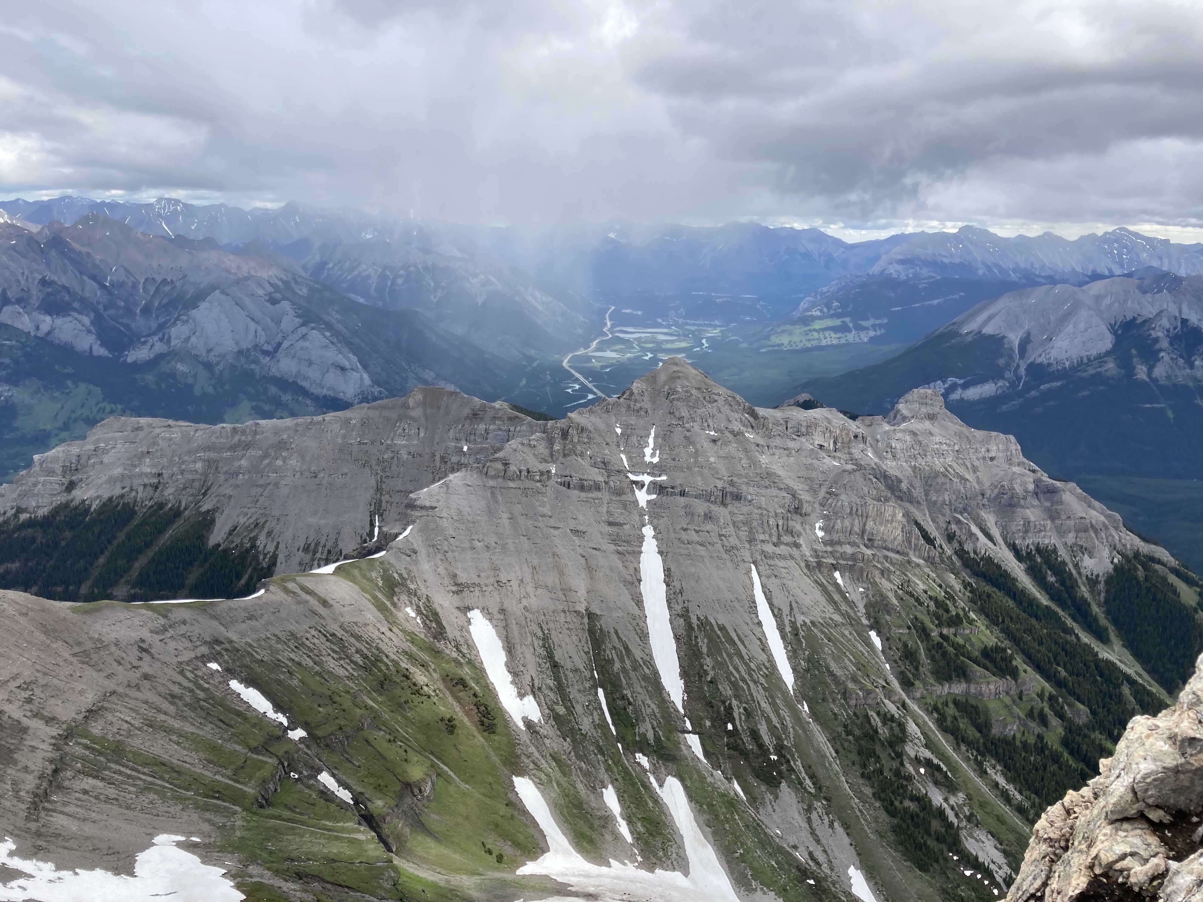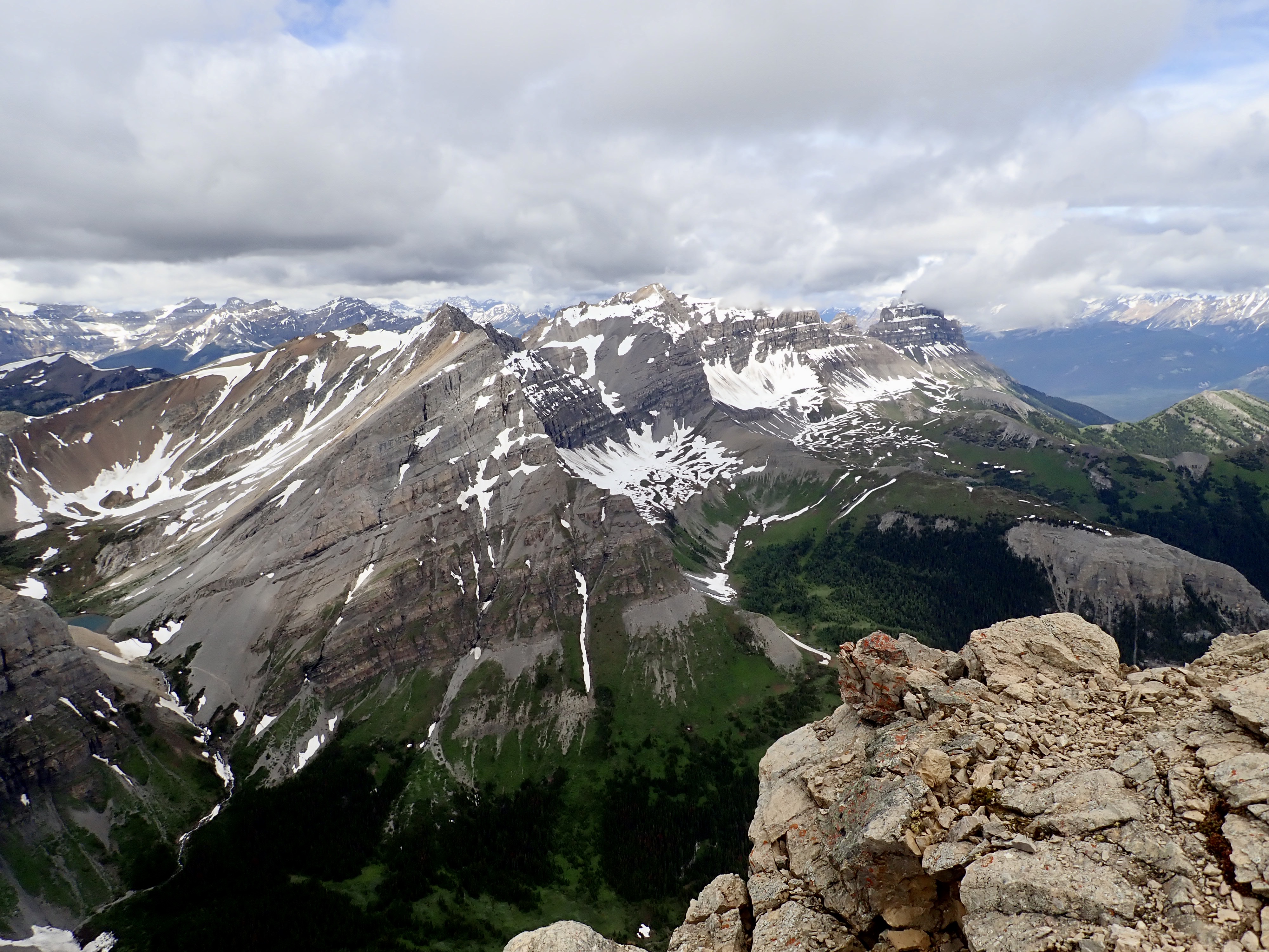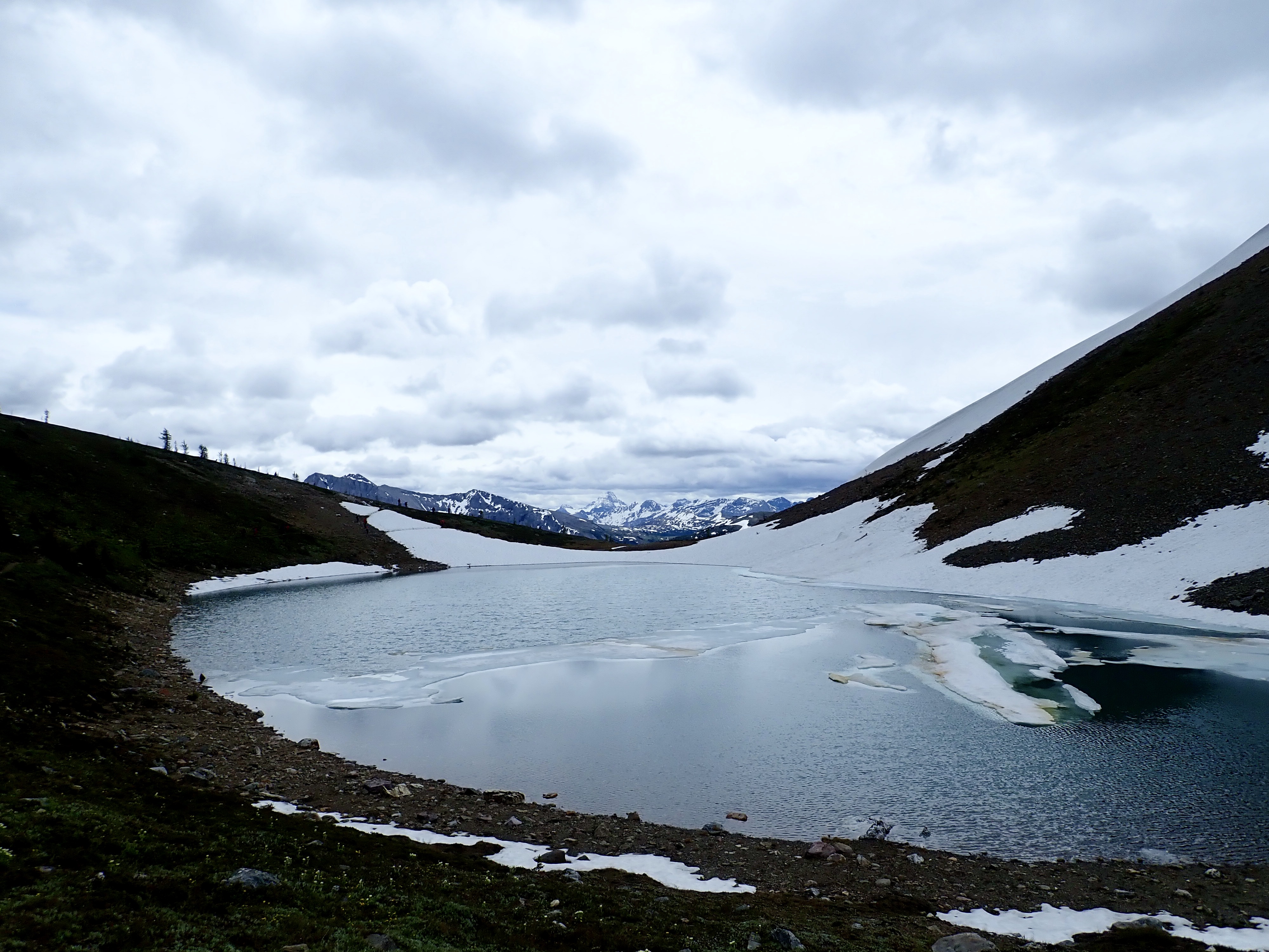 Route overview, looking east. Harvey Lake in Harvey Pass is bottom-centre.Mount Bourgeau as seen from my hotel.Early morning starts are the best.A little further along the trail, looking back.The second creek crossing, below a cascade descending from Lake Bourgeau’s basin. The flow was pretty brisk, and the water was actually fairly deep. Hiking poles were very handy here.Nearly to the lake. Mount Bourgeau’s cliffs are straight ahead. The way to Harvey Pass is the notch on the right.Lake Bourgeau.One of the many little waterfalls among the cliffs.Lots of marmots can be seen in the rocks around the lake.Past the lake now, climbing to the next hanging valley.A look back down toward the lake, and Mount Bougeau’s summit.After the initial climb, the trail goes past this little lake and you can see it continuing up the low headwall beyond.At the top of the headwall, looking southeast where the trail continues up to Harvey Pass. Several little streams trickled around in this meadow from little ponds and tarns.Looking north from the same spot. A little creek was running down from yet another distinct level of the valley. There wasn’t any standing water up there, just rocky ground with runoff going under it.Looking back at the meadow from where the trail starts the final ascent to Harvey Pass.Harvey Lake and Harvey Pass. Mount Assiniboine in the distance. The natural framing of the scenery is uncanny. I took this shot as I descended. When I was ascending, the clouds obscured Assiniboine and I was completely oblivious that it was out there.Telephoto shot of Mount Assiniboine.Harvey Pass panorama.Telephoto shot of a peak in the distance. The wind was blowing right to left, and clouds were being generated along the ridge, drifting continuously away and obscuring Mount Assiniboine (the bottom part of which is visible to the left).From Harvey Pass to the summit, the way is obvious. There’s a boot-beaten trail that’s visible the whole way up. Aside from a couple of rubbly areas it’s just a steep hike. It was roughly 50 minutes from here to the summit, moving briskly.Some cornices along the way. Looking to the right during the climb – buildings and ski runs of the Sunshine Village ski area are visible.This mountain adventure is brought to you by Superior Propane.The summit marker. The deceptively inviting snow beyond it is a giant cornice.I traversed over a bit and looked back. See? Cornice.A short distance left of the summit marker, I found a rocky perch that allowed a view all the way back down to the lake, the trail, the meadow and the pass.A narrower view. The big peaks in the distance are part of the continental divide. The Stanley Glacier trail, where I’d been the day before, would be on the opposite slopes.Telephoto view of the trail ascending to the first little lake and beyond.Black Brett and Mount Brett.Summit panorama looking west.The northeast spur of Mount Bourgeau. Rain is falling in the valley beyond. The Banff townsite is in the distance.Looking east across the Bow Valley.The clouds very stubbornly wouldn’t move off Assiniboine while I was on the summit, but I could get a good feel for the smaller peaks surrounding the 3618 m monster.Another panorama looking west as I descended.Yet another panorama on the descent. The clouds thinned somewhat. Assiniboine is mostly visible in the far background on the left. The bigger peak in the background at centre-right is (I think) The Monarch. Sunshine Village is across the valley.Great snow and rock scenery.The clouds shifted again. Time for another panorama.Almost back down to the pass, peeking over the edge at the trail ascending to the 2nd set of lakes.A last look at the summit at day’s end. There’s a speck visible against the white sky almost dead centre (click and you get a full-res image you can zoom in on) – a gentleman who I passed on my way down. I had quite lovely solitude, which is unusual for this trail. The crowds are about 45 minutes behind him.