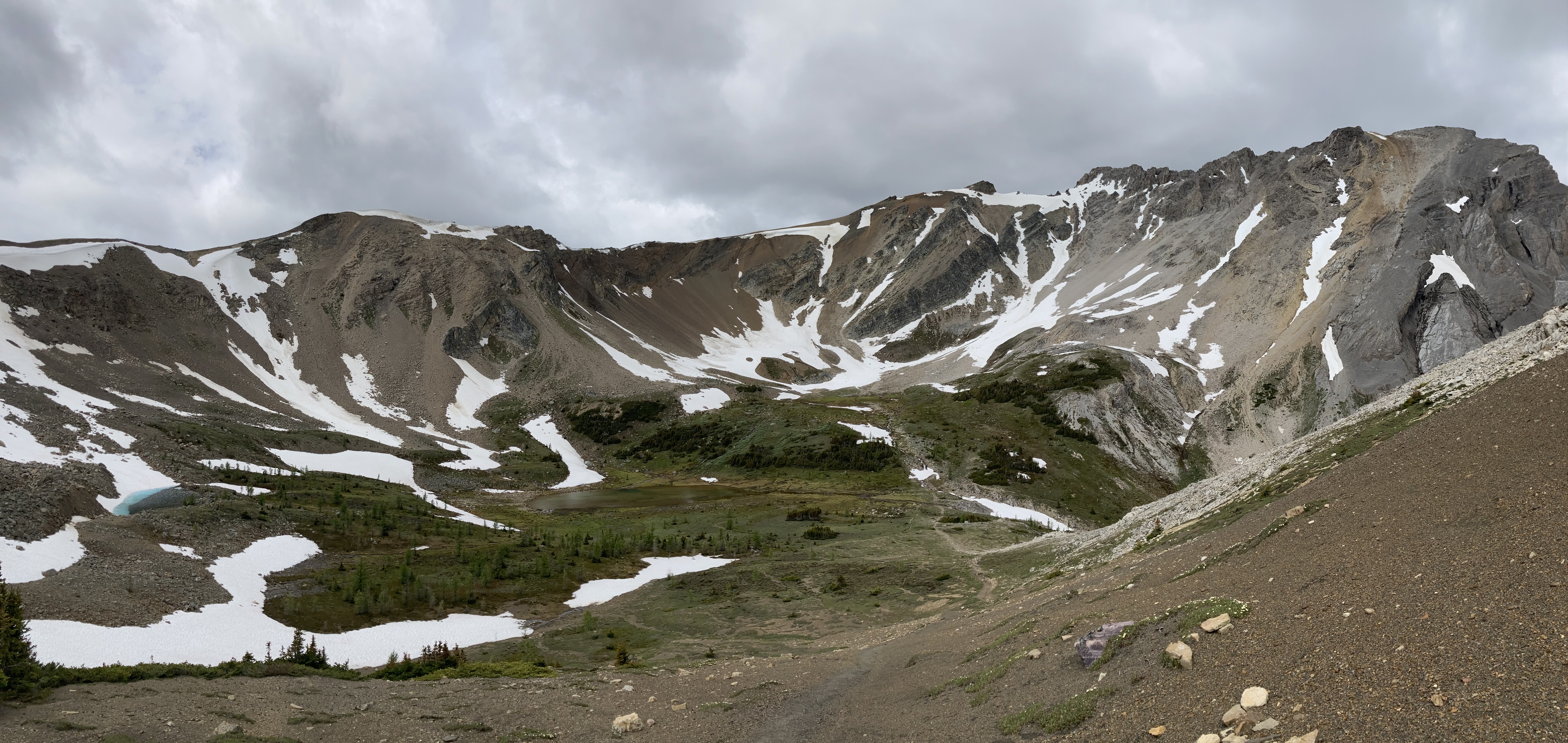 The trail carries on around the north side of the lake, then begins a climb west to yet another hanging valley. The route goes past small cascades draining from a collection of tarns in the upper valley. Finally, the trail swings southeast and climbs steeply again to Harvey Lake, and Harvey Pass beyond. The first glimpses of the views beyond the pass will hopefully make it clear that the trip is worth the effort. On a clear day, Mount Assiniboine will be visible in the distance straight ahead. I didn’t visit on a clear day, so I didn’t realize this amazing natural framing until I looked over my should on the way back down. The clouds had moved during my descent and unveiled the “Canadian Matterhorn”.
