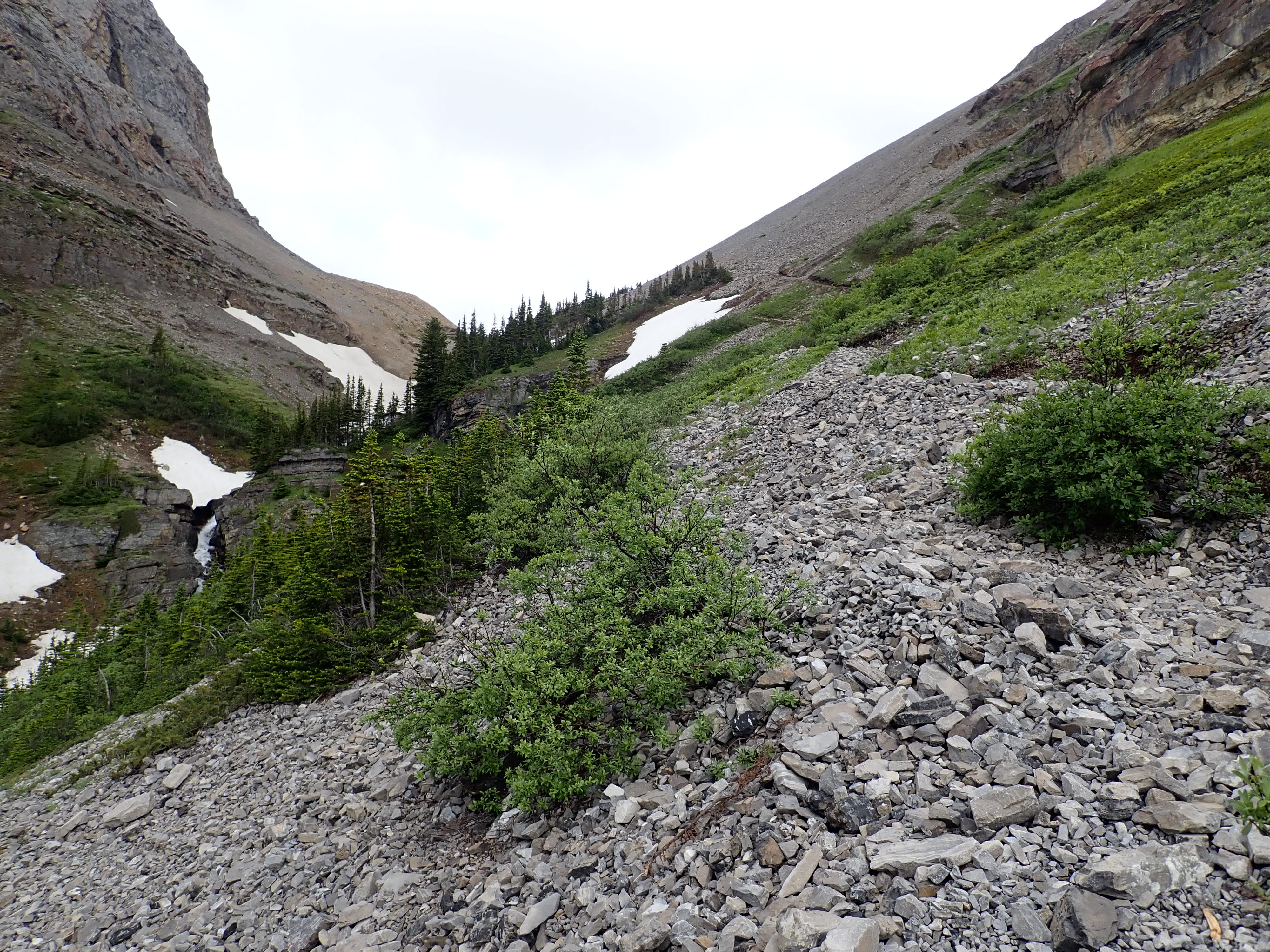 Mount Bourgeau is apparently one of the most popular peaks in the Banff area – a 2906 meter summit accessible from a well-marked trail and requiring no scrambling, just legs that can handle the vertical. The trail is the Bourgeau Lake/Harvey Pass trail, which is just a short distance west of Banff. The lake is beautiful, but the approach is lack-lustre. Even moving at a pretty brisk pace, it involves almost 2 hours hiking along a mostly wooded trail. On that basis, the Copelands in Don’t Waste Your Time in the Canadian Rockies5thed. strongly encourage hikers to carry on to Harvey Pass – and I can confirm they’re giving good advice. Beyond the lake, things get steeper, but far more scenic.