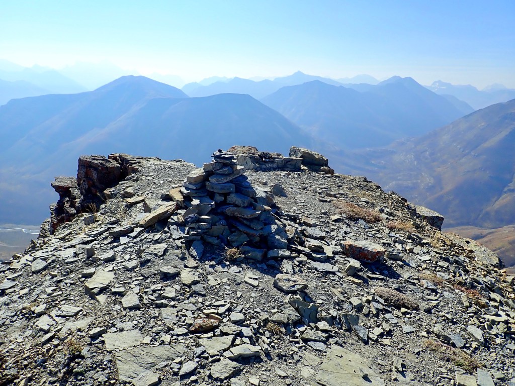 A small cairn greeted me at the summit. I didn’t see a register, though I didn’t dig under the rocks. The day was hazy, subduing the views pretty dramatically. Mount Crandell, Ruby Ridge, Mount Blakiston, and Anderson Peak were visible to the west across the valley, with the peaks beyond silhouetted in the haze. Bellevue Hill is to the south. Galwey’s unofficial north summit, “Rogan Peak”, and Mount Dungarvan are north. East is Lakeview Ridge and the prairies. The evidence of the destruction wrought by the 2017 fires was all around. I peered down across the valley at the Crandell Campground, which is still closed 3 years after the fire. Nearby Crandell Lake would probably have looked quite picturesque, but the haze ruined the view. I enjoyed having the peak to myself for a time, then descended along the same route.