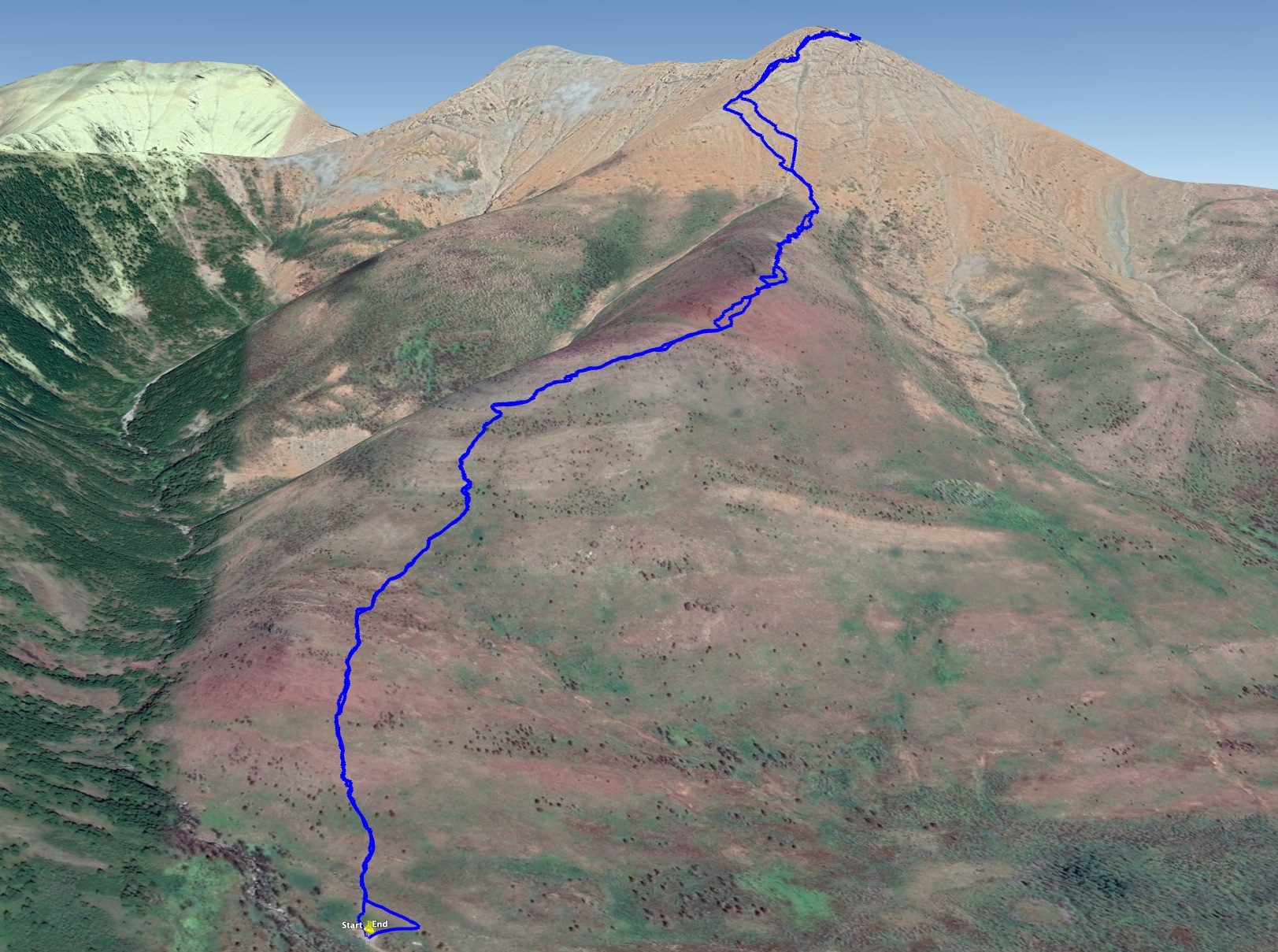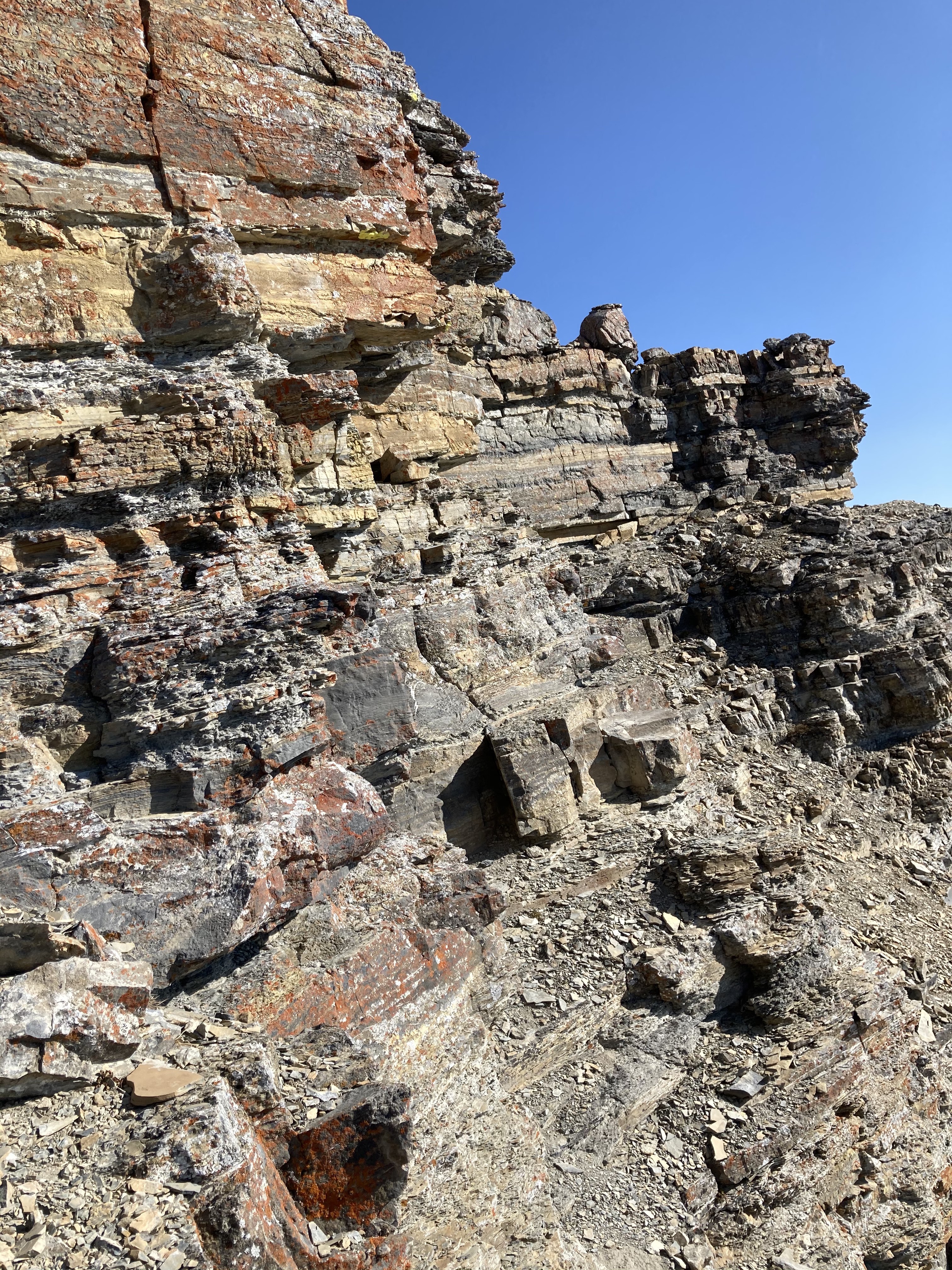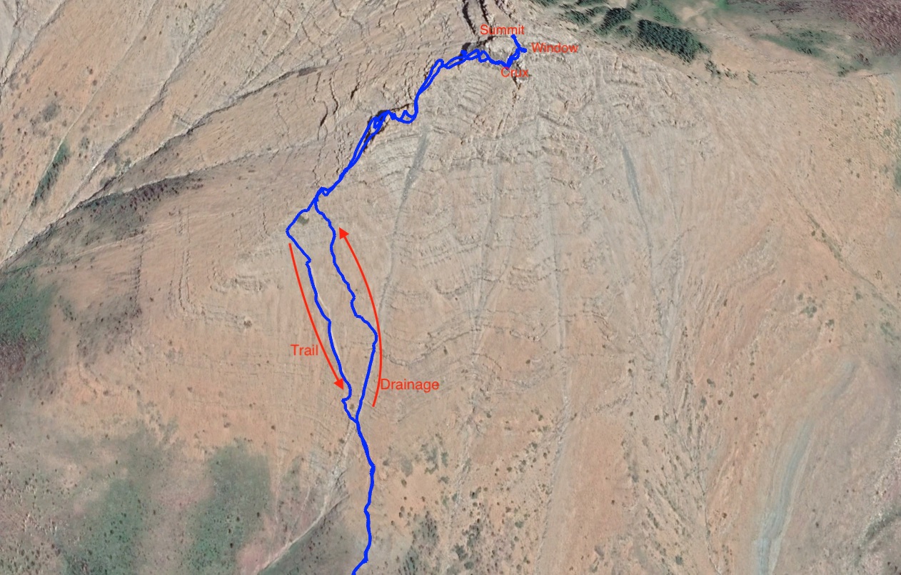 The initial portion of the ascent involves following a very obvious trail along the top of this spur. Eventually, I reached the connection between the spur and the main mass of the mountain. Here, the trail diagonally ascends left across a scree field on the southwest face, eventually gaining the western ridge. It crosses a drainage of blue-grey rock, which I decided to ascend for a while for a bit of fun before leaving it and traversing back to the obvious trail.
