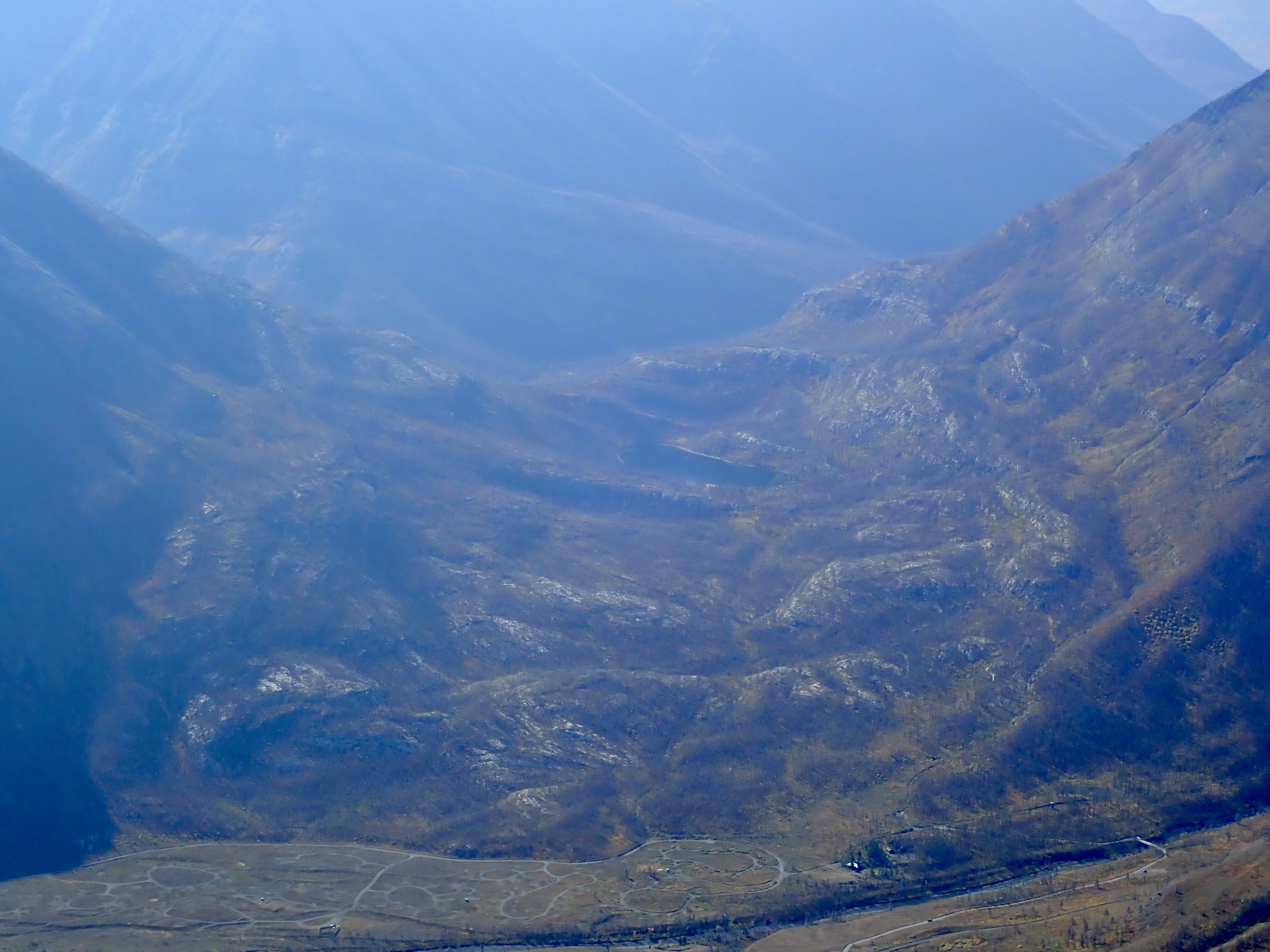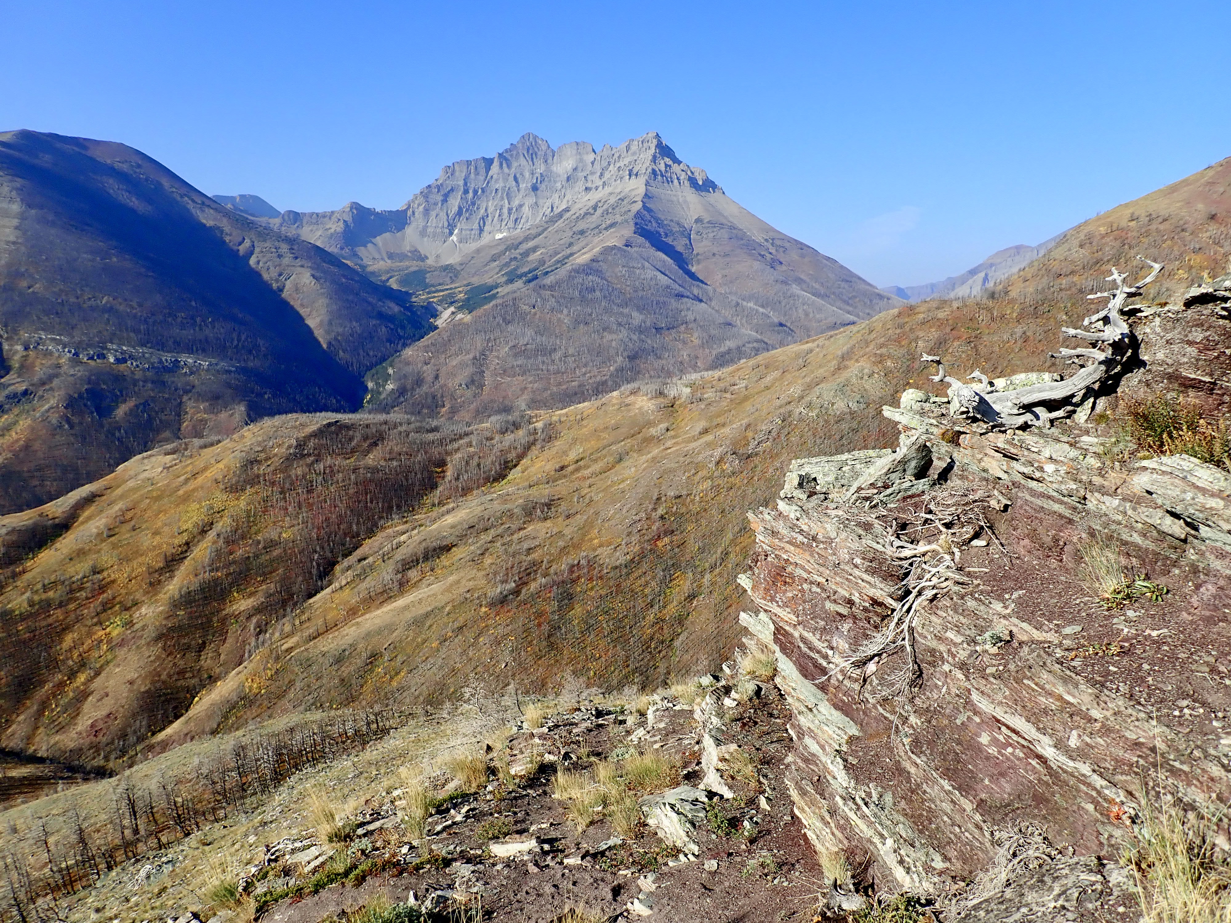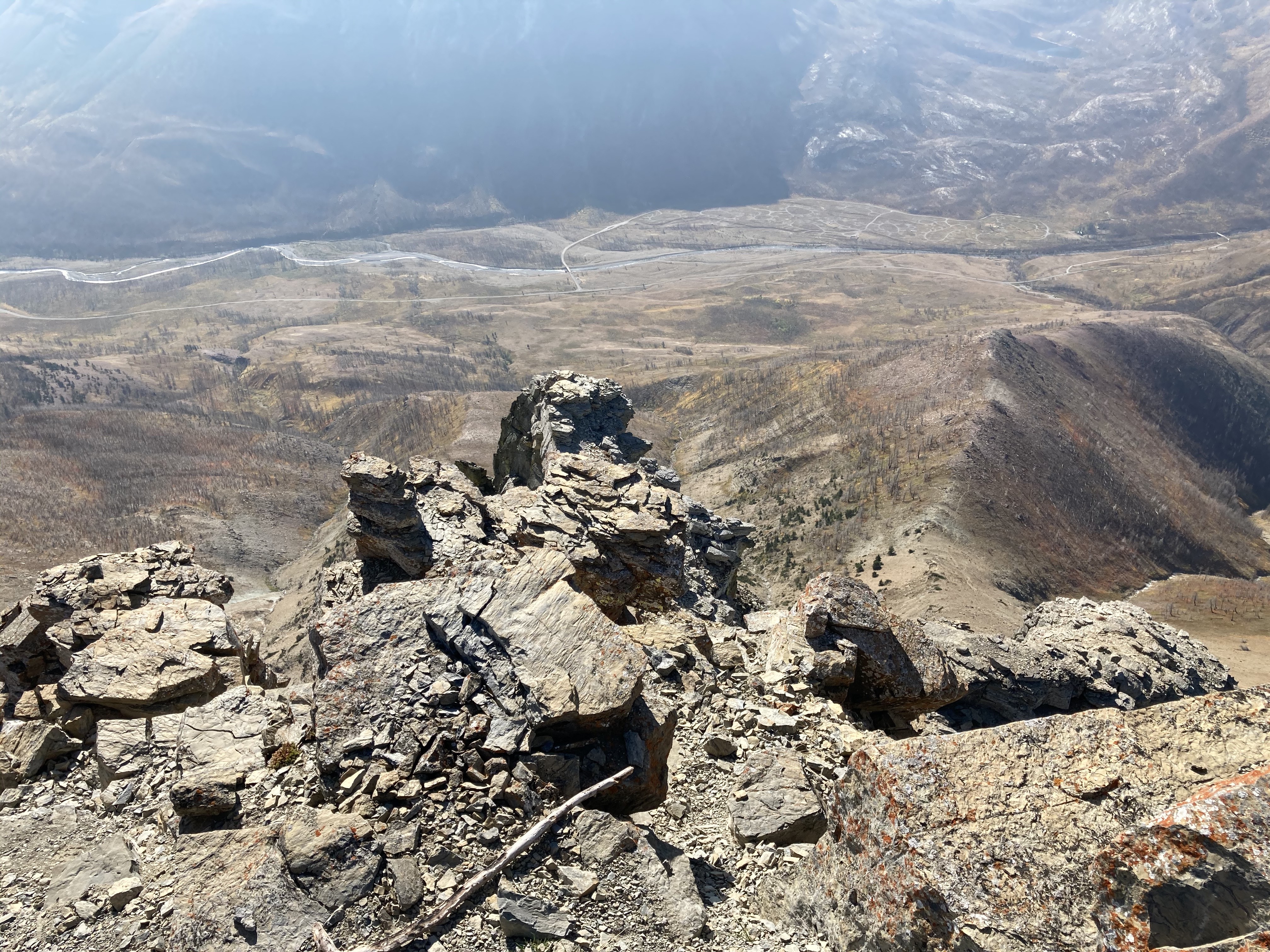 A small cairn greeted me at the summit. I didn’t see a register, though I didn’t dig under the rocks. The day was hazy, subduing the views pretty dramatically. Mount Crandell, Ruby Ridge, Mount Blakiston, and Anderson Peak were visible to the west across the valley, with the peaks beyond silhouetted in the haze. Bellevue Hill is to the south. Galwey’s unofficial north summit, “Rogan Peak”, and Mount Dungarvan are north. East is Lakeview Ridge and the prairies. The evidence of the destruction wrought by the 2017 fires was all around. I peered down across the valley at the Crandell Campground, which is still closed 3 years after the fire. Nearby Crandell Lake would probably have looked quite picturesque, but the haze ruined the view. I enjoyed having the peak to myself for a time, then descended along the same route.