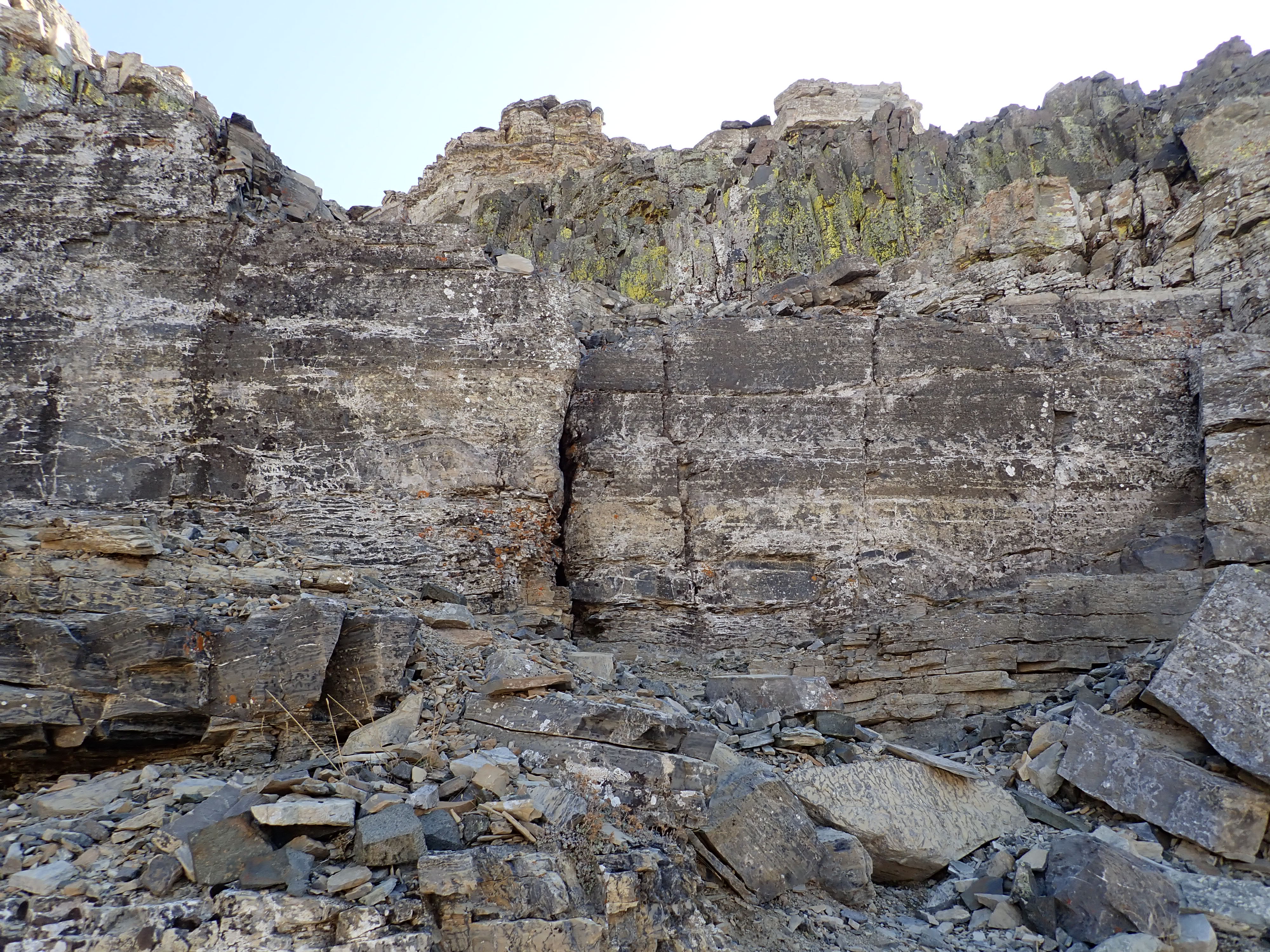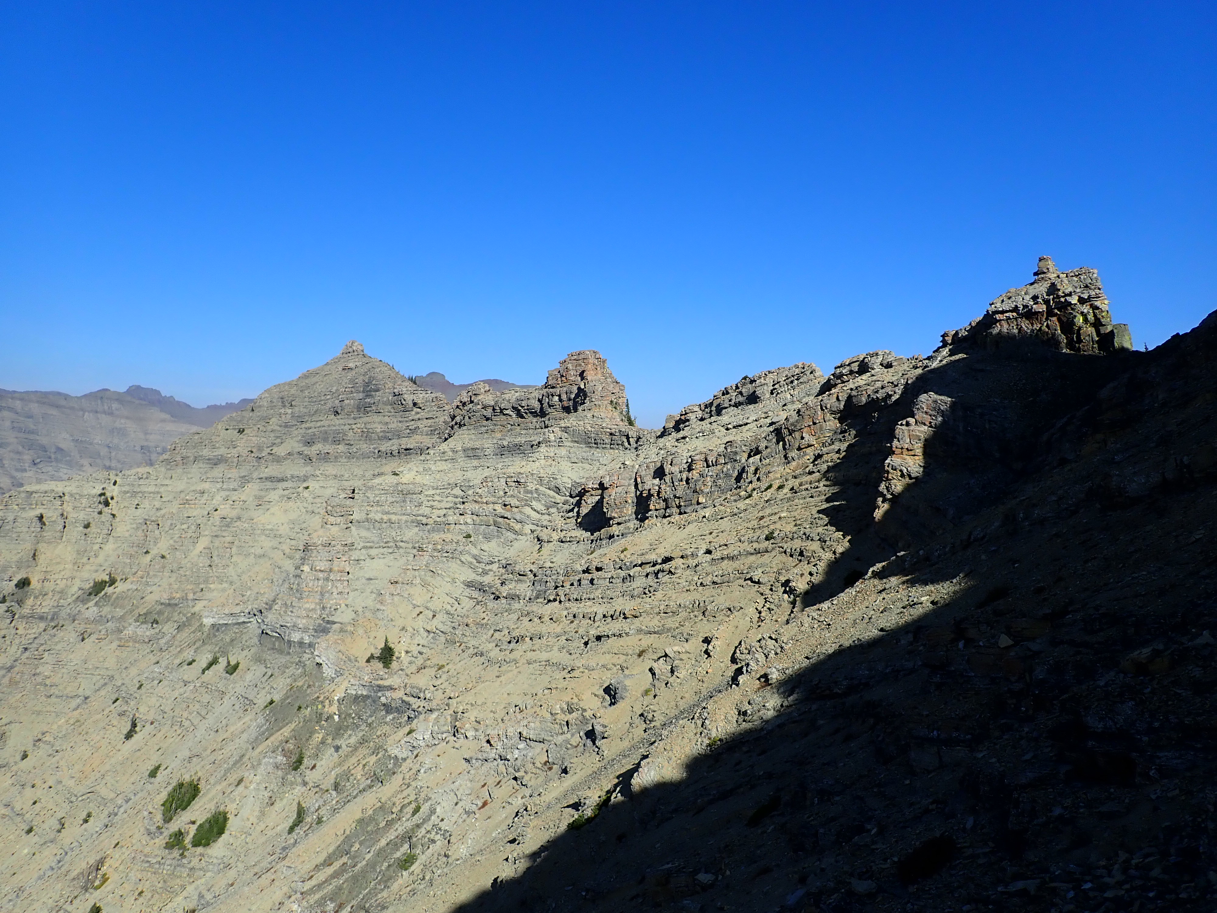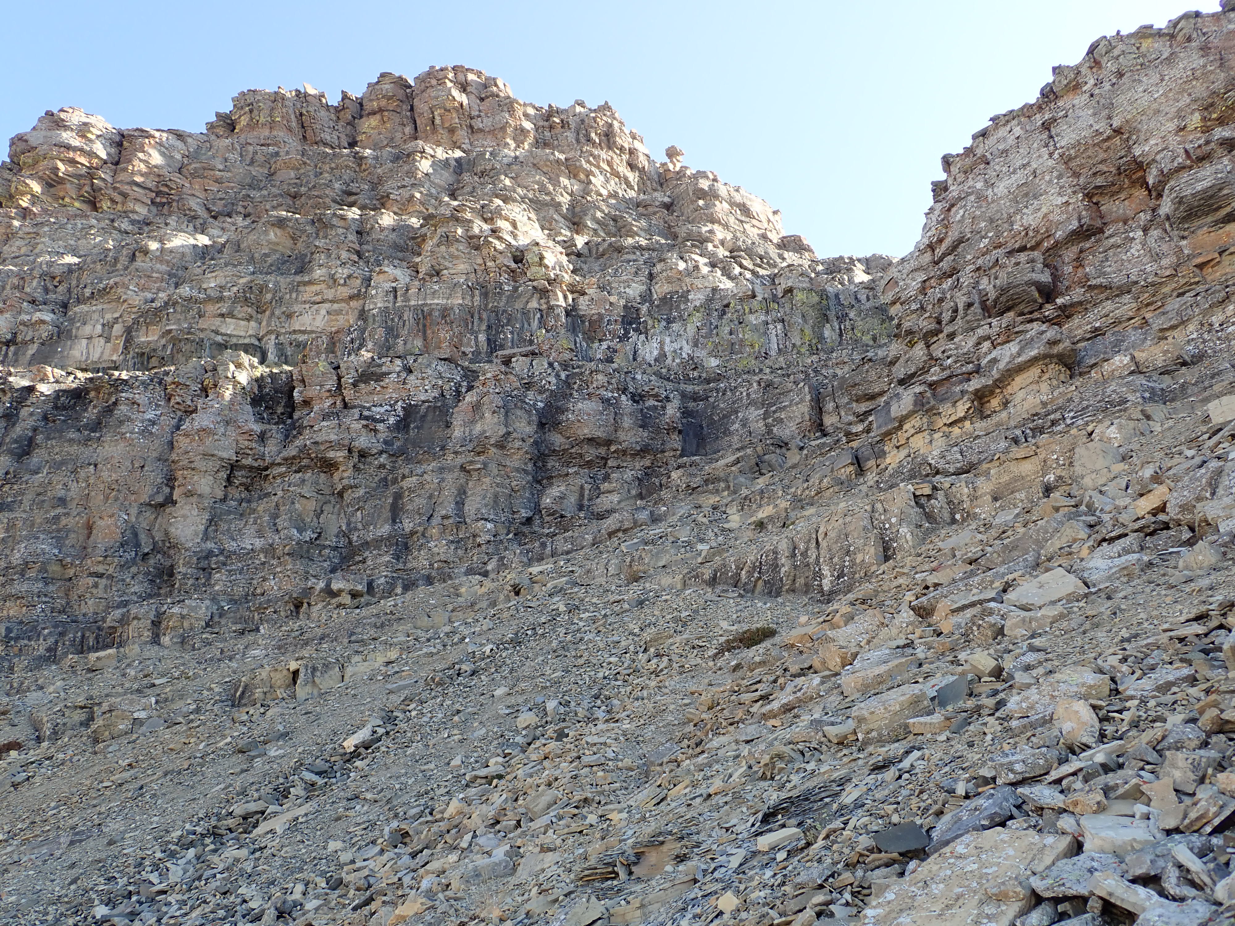 The route then passes over the ridge, and continues along the northern side. I saw cairns here and there marking a route, and I found that there was still something of a visible path in many places. On this side of the ridge, the route continues along the ridge for a short distance, then traverses below steeper rock to a pale rock gully. I ascended here, reached the top, and peered over the edge at the sheer drop to the south. Then I headed left, and was able to pick out the rock “mushroom” described by Kane in the distance. I headed generally in that direction. Eventually I encountered the distinctive black rock of the Purcell sill, and ascended via an obvious weakness. This made for some fun scrambling. There’s 7-8 foot wall to overcome at one point. Since there’s no exposure beneath it, I took the opportunity to attack it more or less head-on just to see if I could. A short distance beyond, I reached the crux.