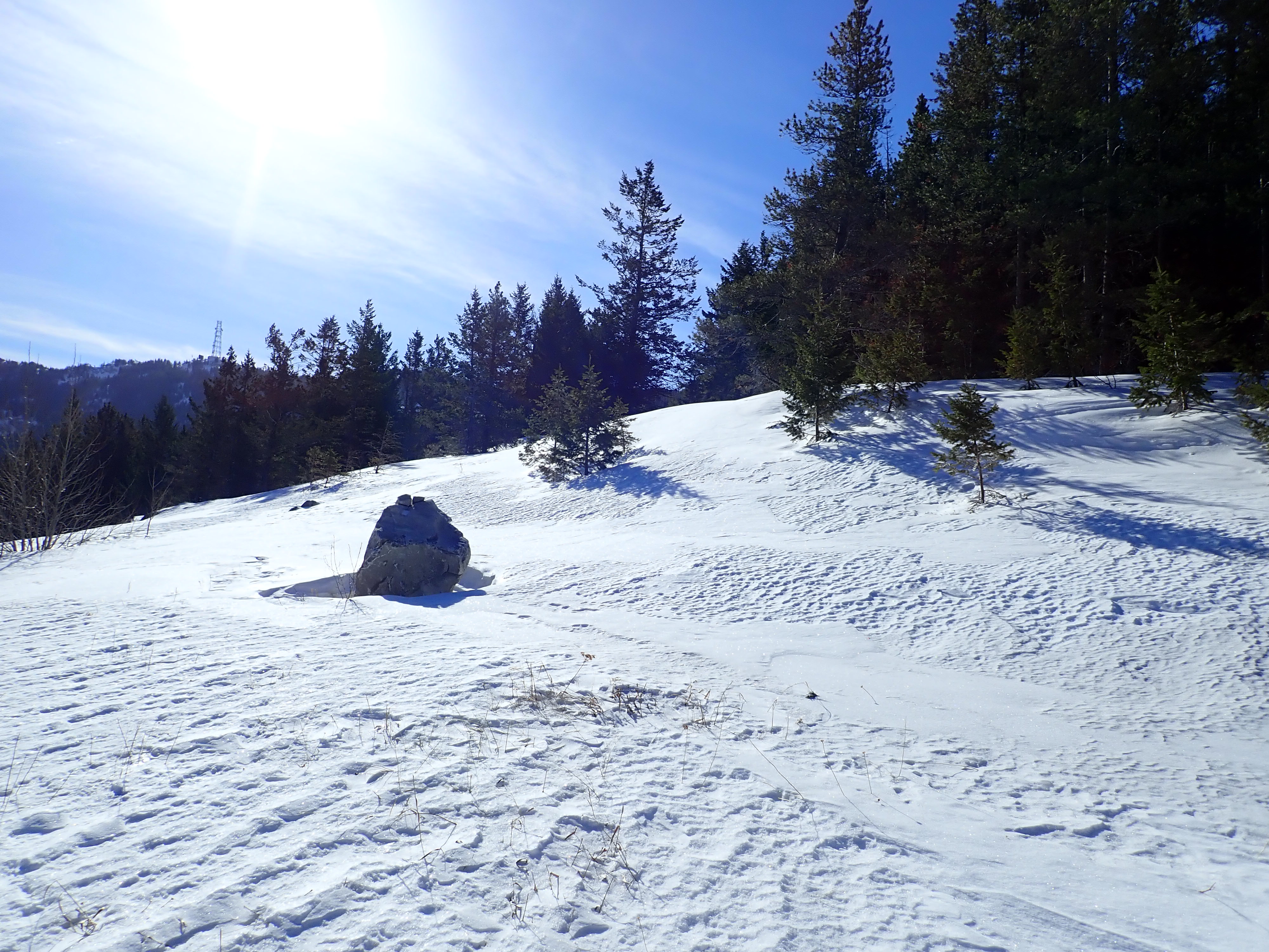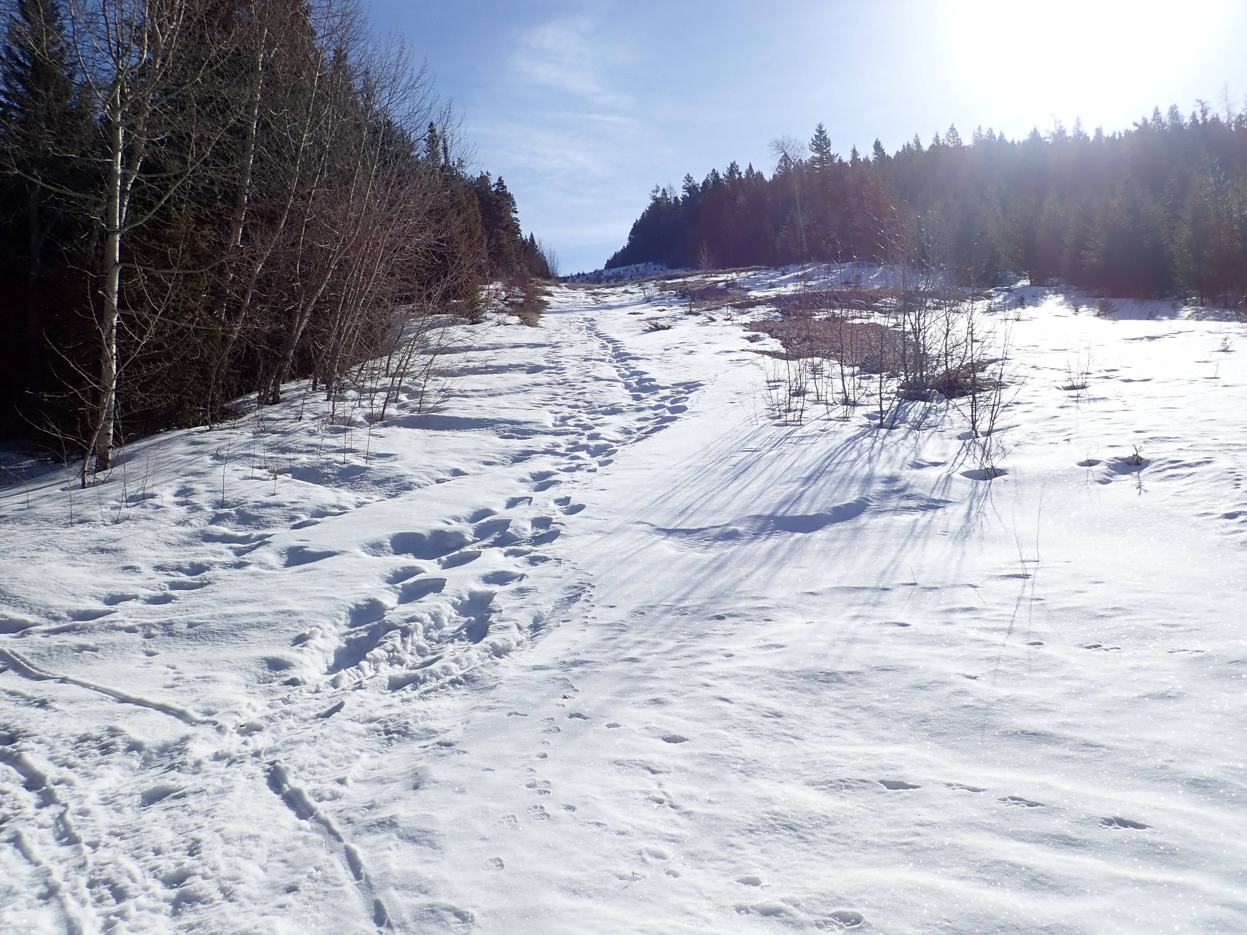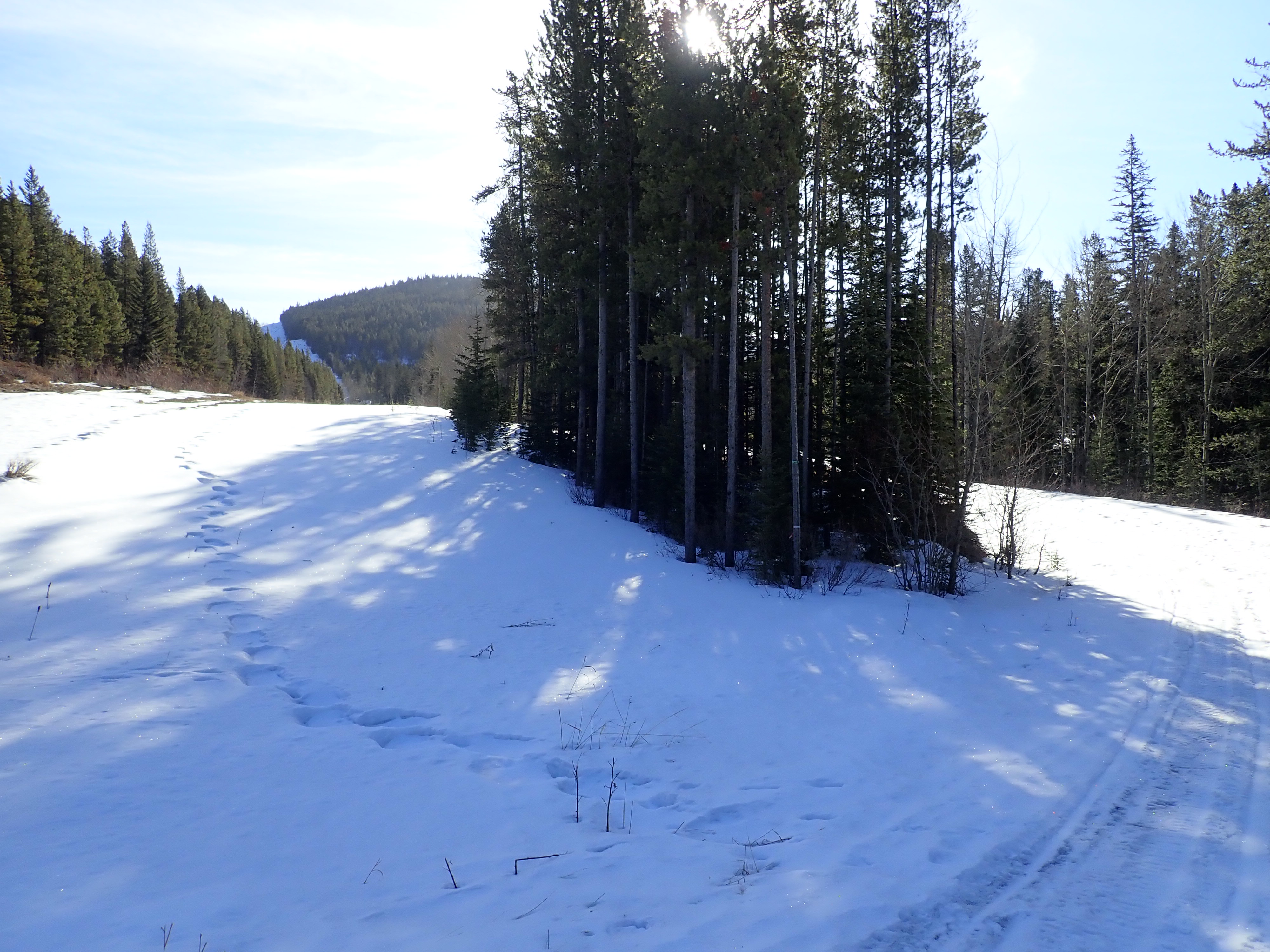 The route starts from the Crowsnest Provincial Park parking area off Hwy 3, just to the west of the Alberta/BC border. There’s a big parking area with some toilet facilities and picnic tables, but it’s closed in the winter. I pulled off the road and parked in the pull-out area outside the locked gate. Click here and Google Maps will drop a pin on the spot. When I was heading to Mount Tecumseh I had my bike with me, so I got onto the old Phillips Pass road where it departed from the western end of the parking lot. Since I was on foot this time, I just followed a path north through the trees from the parking area and got myself onto the road. I followed it eastward until it reached the base of the northwestern toe of Crowsnest Ridge. A very clear and wide cutline proceeded straight up the slope at that point, while the road deviated north to hook around the ridge and stay in the valley.