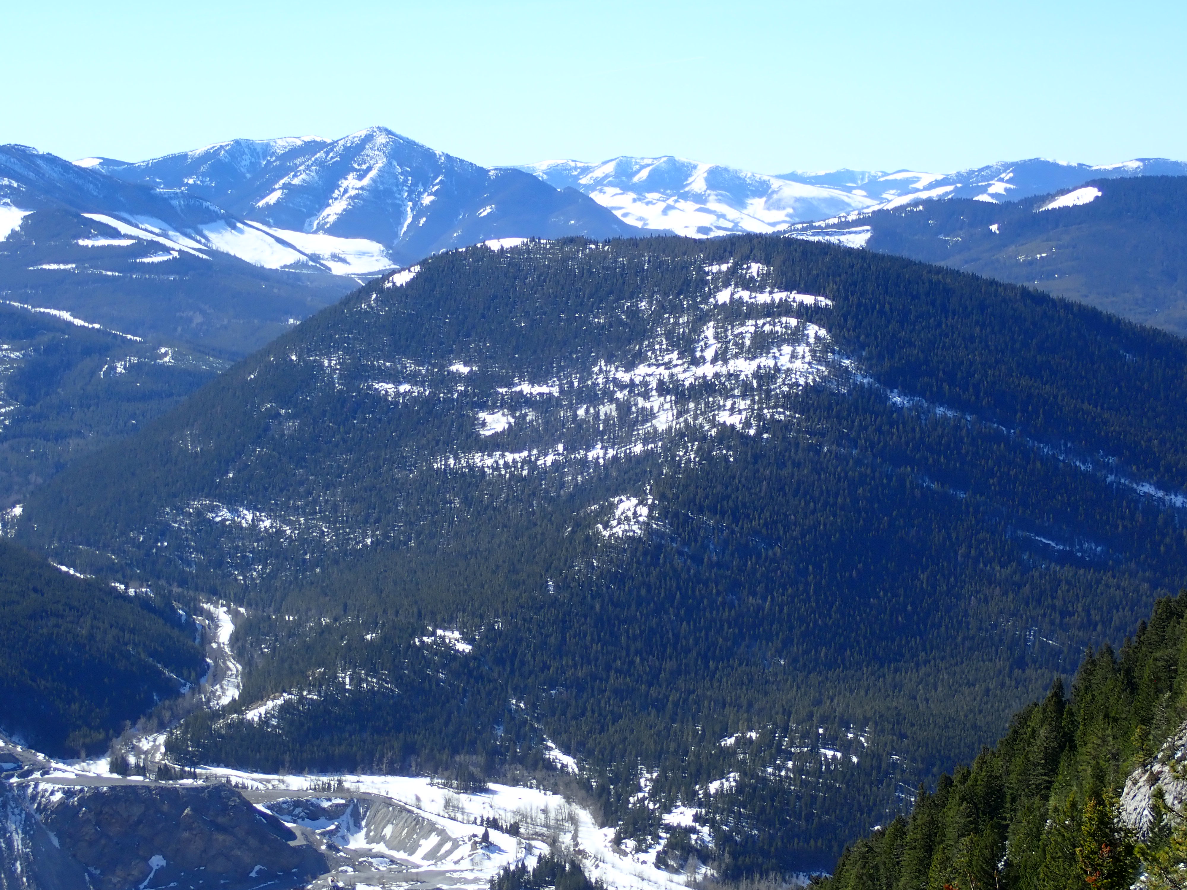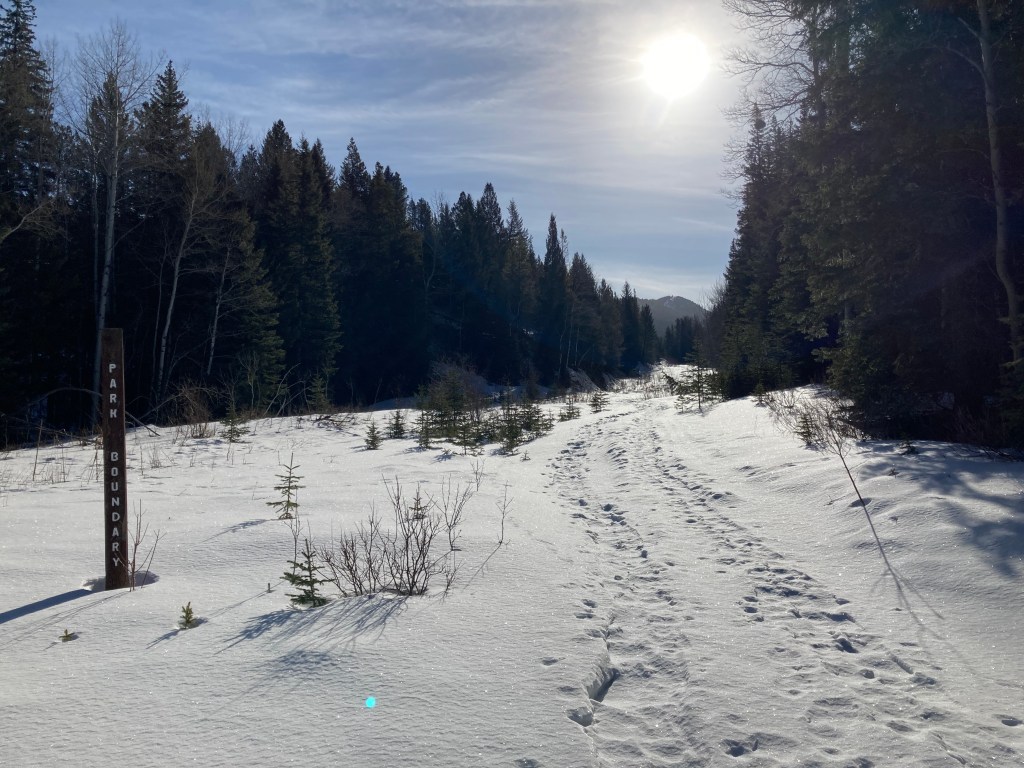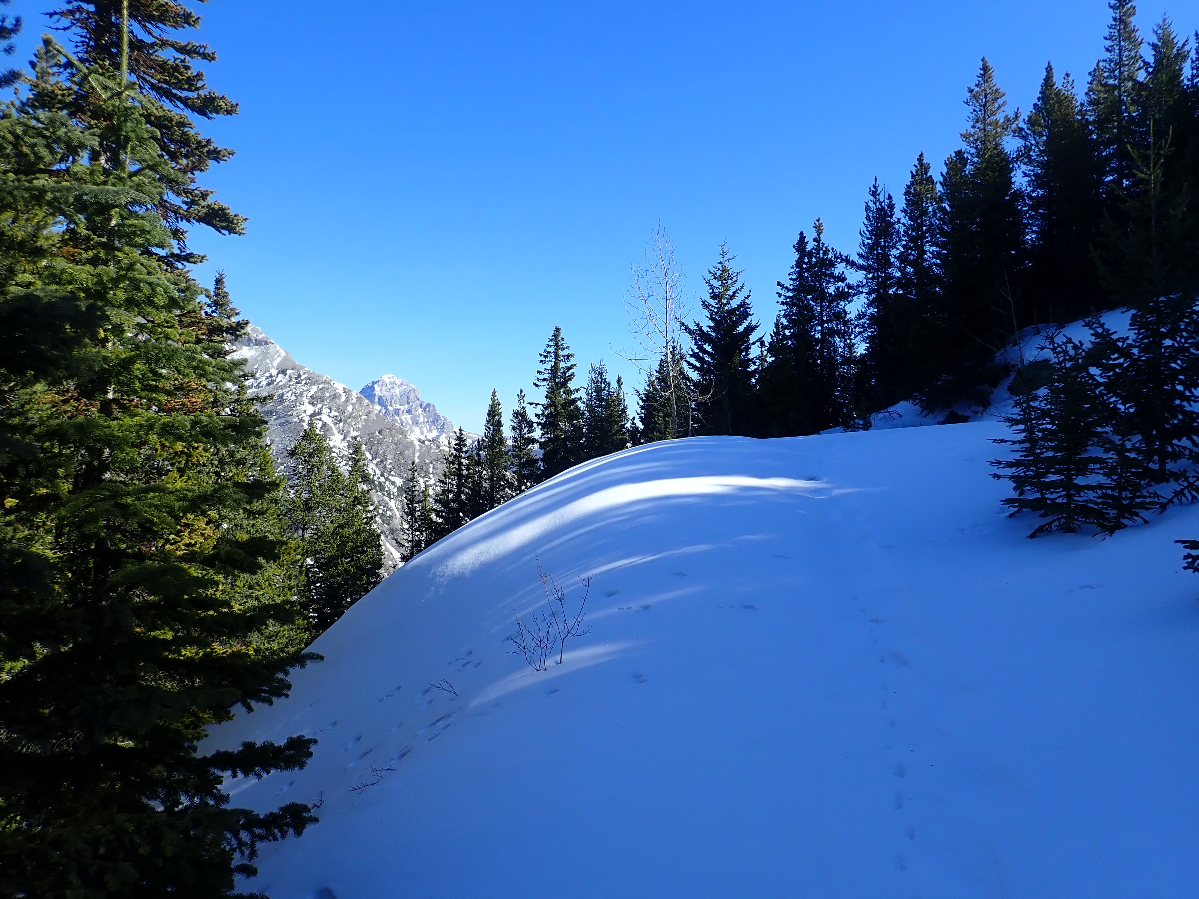 The route starts from the Crowsnest Provincial Park parking area off Hwy 3, just to the west of the Alberta/BC border. There’s a big parking area with some toilet facilities and picnic tables, but it’s closed in the winter. I pulled off the road and parked in the pull-out area outside the locked gate. Click here and Google Maps will drop a pin on the spot. When I was heading to Mount Tecumseh I had my bike with me, so I got onto the old Phillips Pass road where it departed from the western end of the parking lot. Since I was on foot this time, I just followed a path north through the trees from the parking area and got myself onto the road. I followed it eastward until it reached the base of the northwestern toe of Crowsnest Ridge. A very clear and wide cutline proceeded straight up the slope at that point, while the road deviated north to hook around the ridge and stay in the valley.
