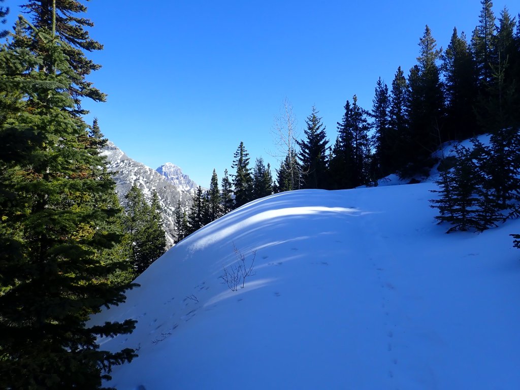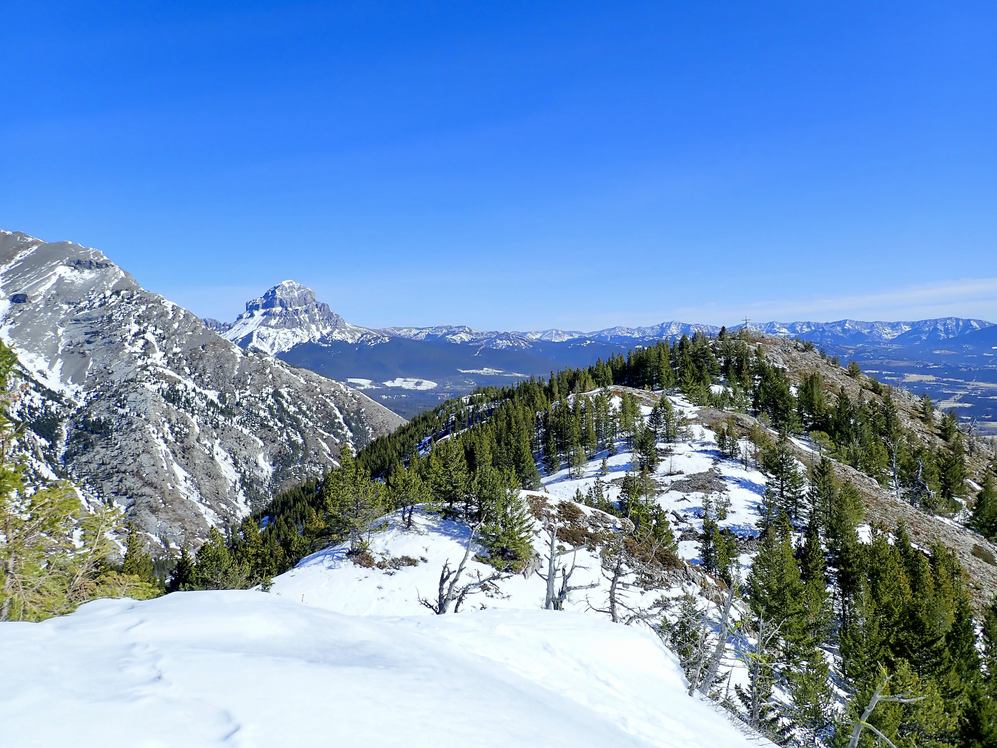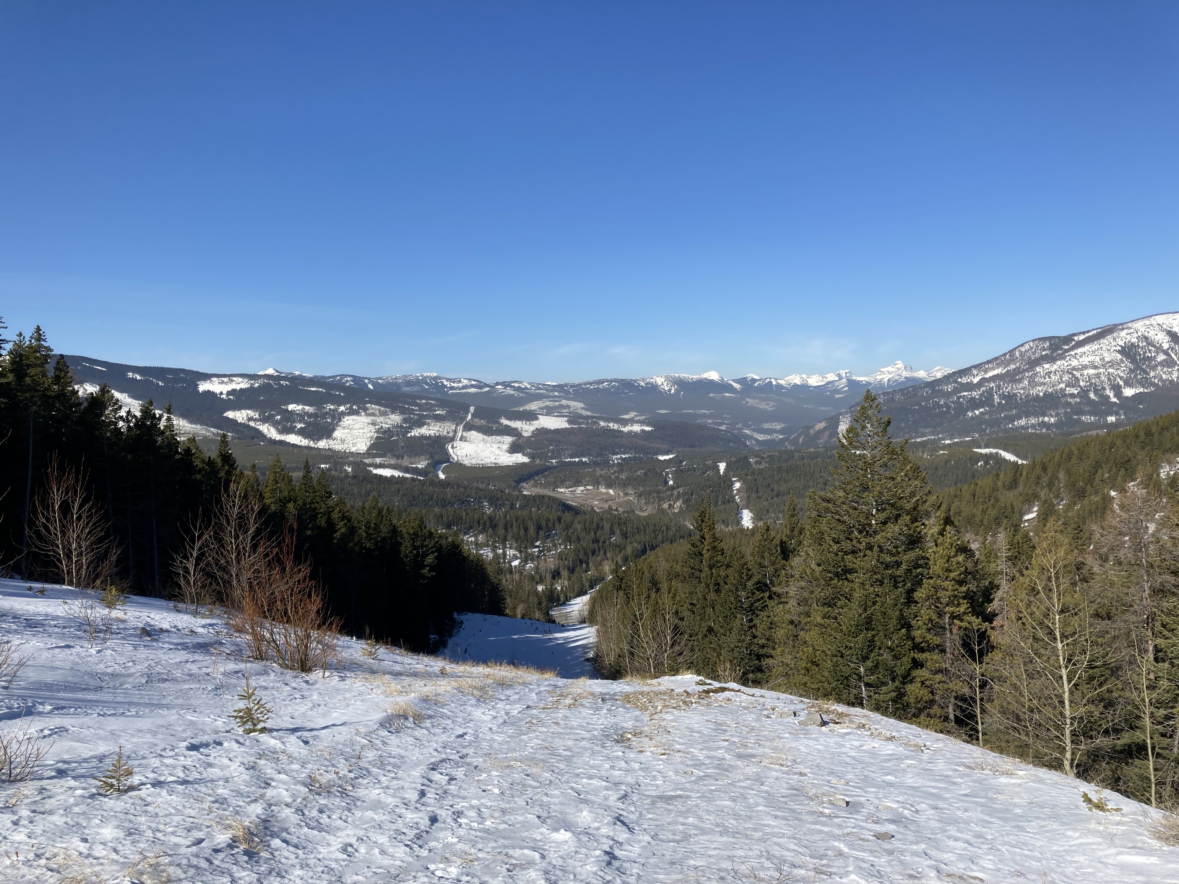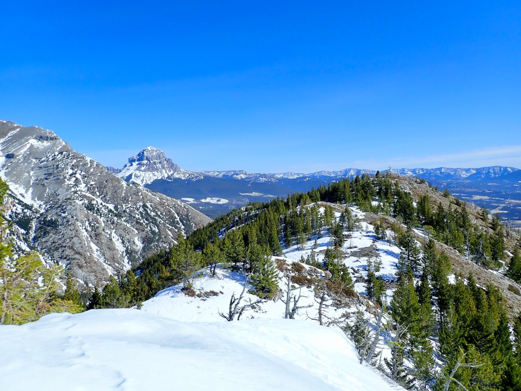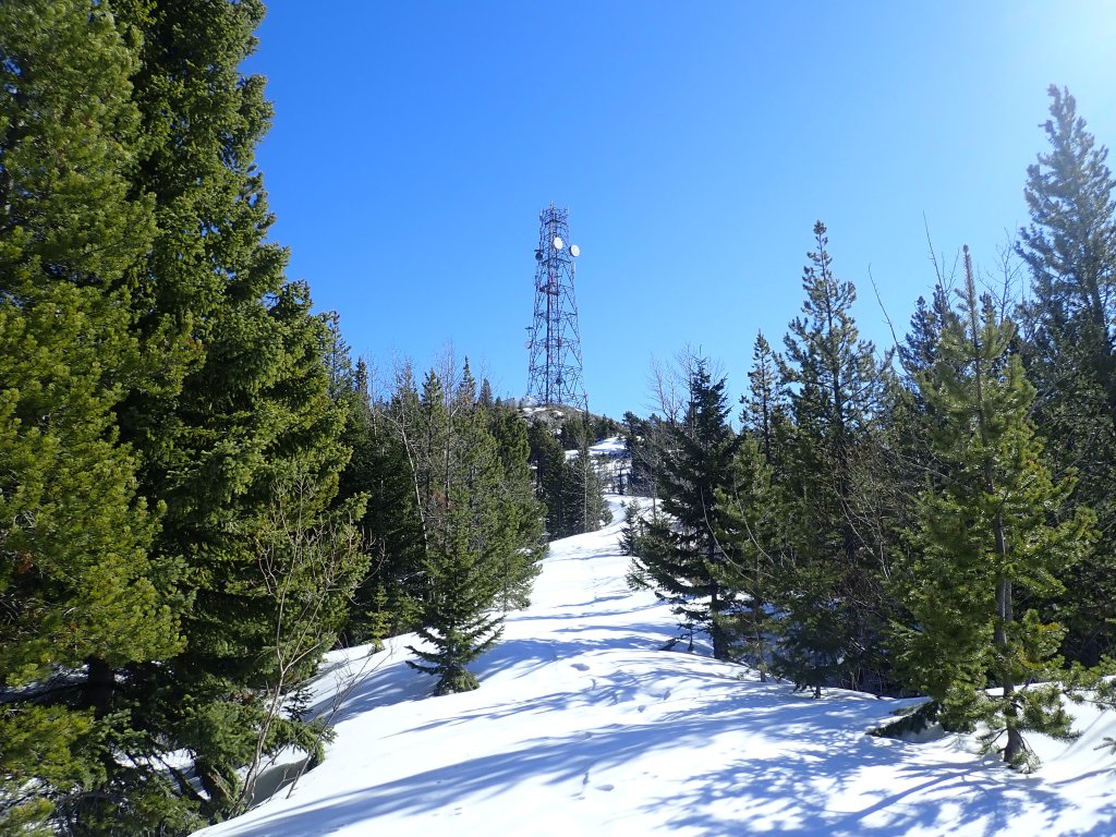 Almost exactly 3 years before this trip I snowshoed to the summit of Island Ridge on a warm and sunny day. I had taken note at that time of Crowsnest Ridge, directly across the valley. A telecom tower sat on top, which made the ridge itself less than picturesque. However, I figured the views would be pretty good, making it a good objective for a future outing. I reviewed Bob Spirko’s trip report, describing a route that began along the same road I used to approach Mount Tecumseh, but deviating to climb directly up a cutline ascending the northwestern toe of Crowsnest Ridge. From there Spirko followed the ridge until it intersected an access road that switchbacked from Phillips Pass up the steep north face of the ridge. Then he followed the road to the summit. This struck me as a more interesting route to take rather than climbing up the access road the whole way, and it would keep me out of avalanche terrain, which I thought the lower reaches of the switchback road were definitely in.