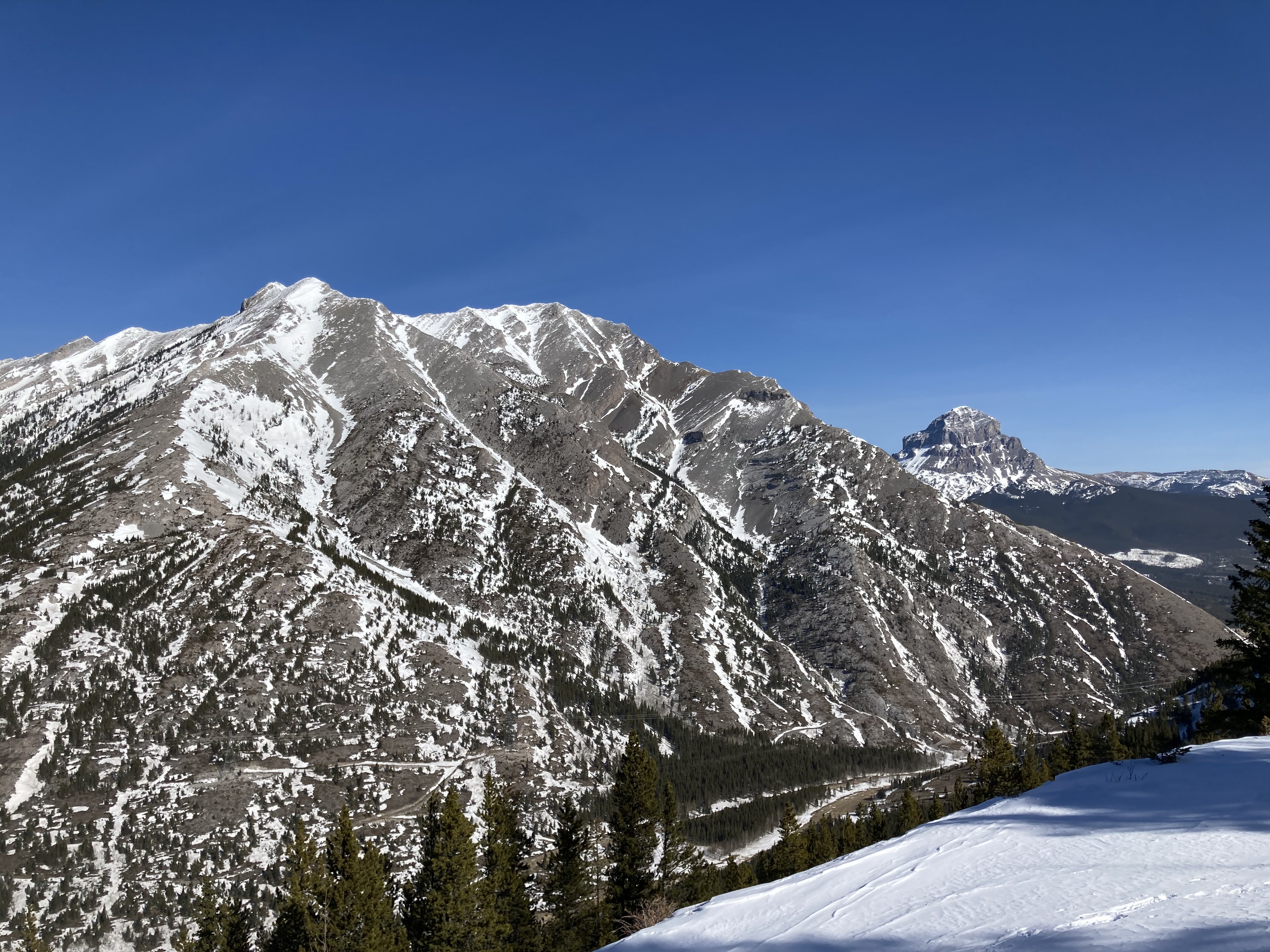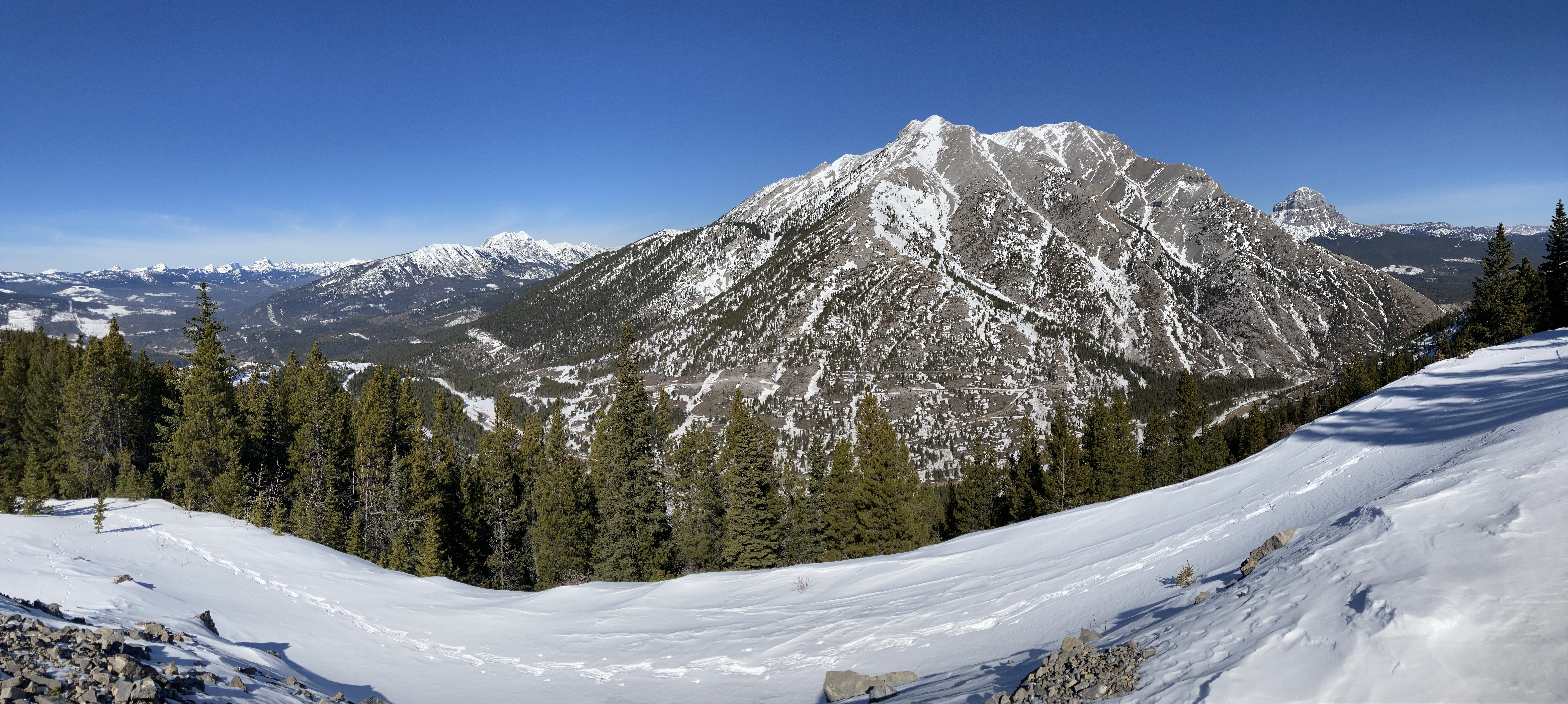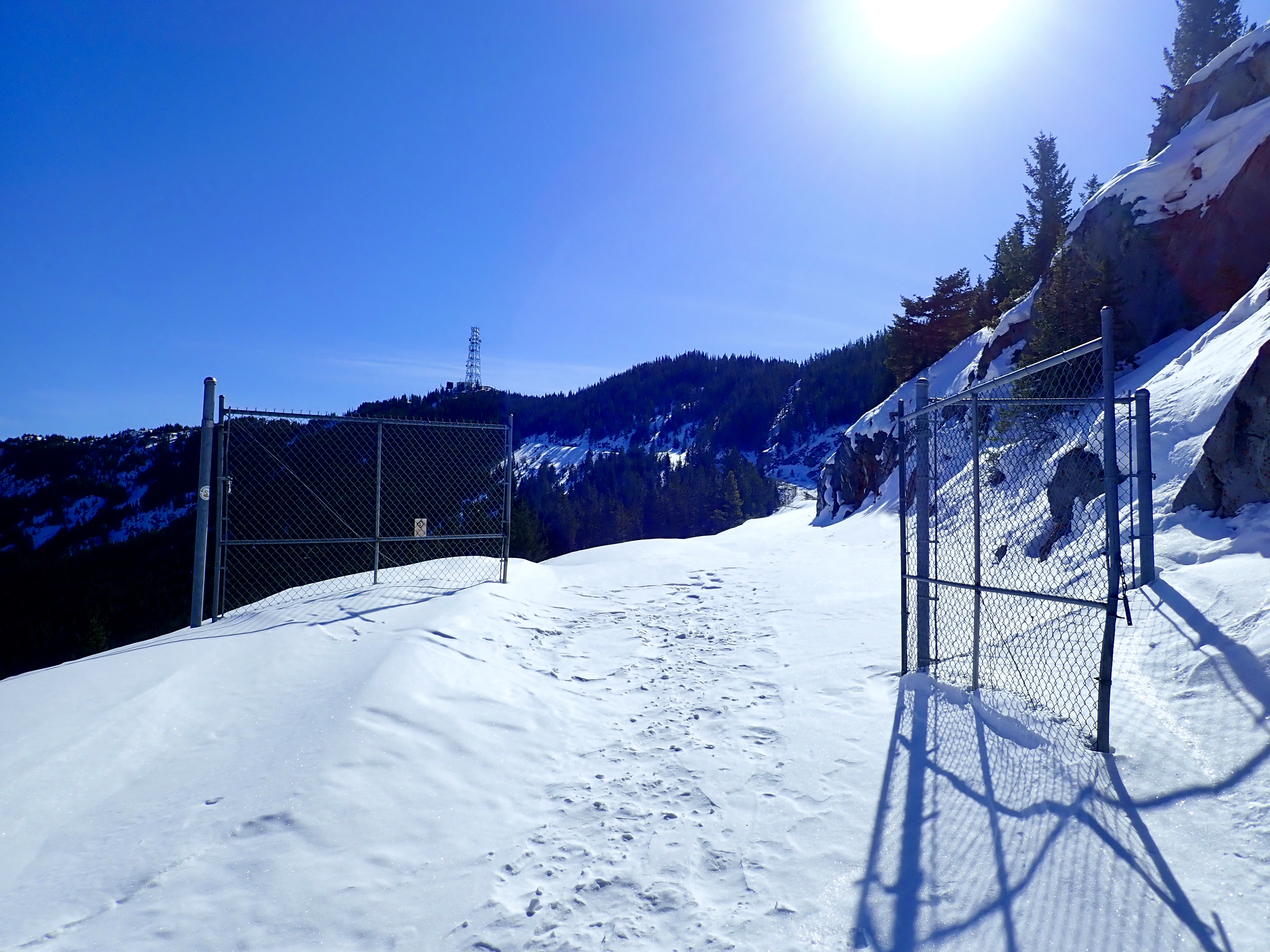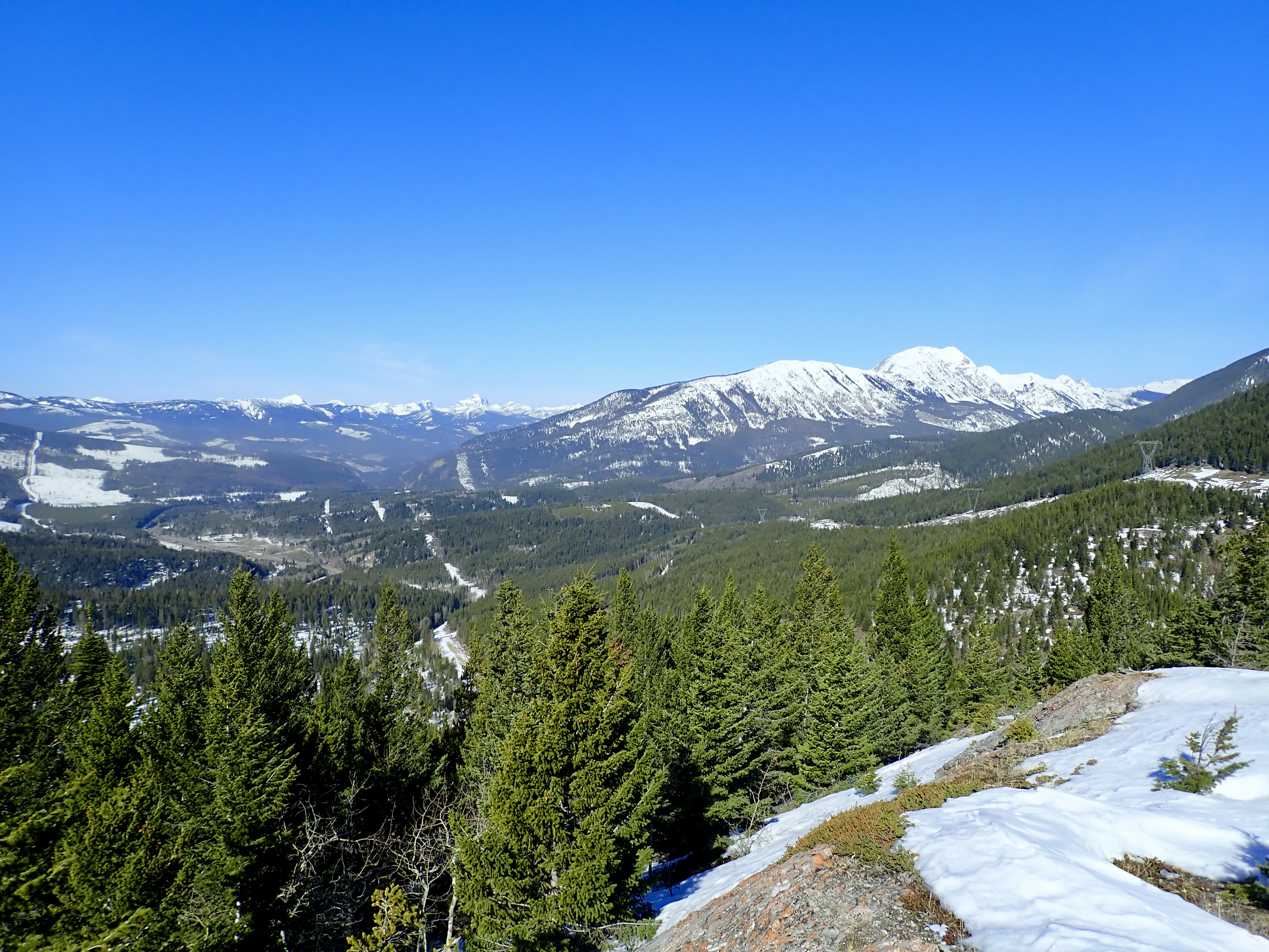 Almost exactly 3 years before this trip I snowshoed to the summit of Island Ridge on a warm and sunny day. I had taken note at that time of Crowsnest Ridge, directly across the valley. A telecom tower sat on top, which made the ridge itself less than picturesque. However, I figured the views would be pretty good, making it a good objective for a future outing. I reviewed Bob Spirko’s trip report, describing a route that began along the same road I used to approach Mount Tecumseh, but deviating to climb directly up a cutline ascending the northwestern toe of Crowsnest Ridge. From there Spirko followed the ridge until it intersected an access road that switchbacked from Phillips Pass up the steep north face of the ridge. Then he followed the road to the summit. This struck me as a more interesting route to take rather than climbing up the access road the whole way, and it would keep me out of avalanche terrain, which I thought the lower reaches of the switchback road were definitely in.