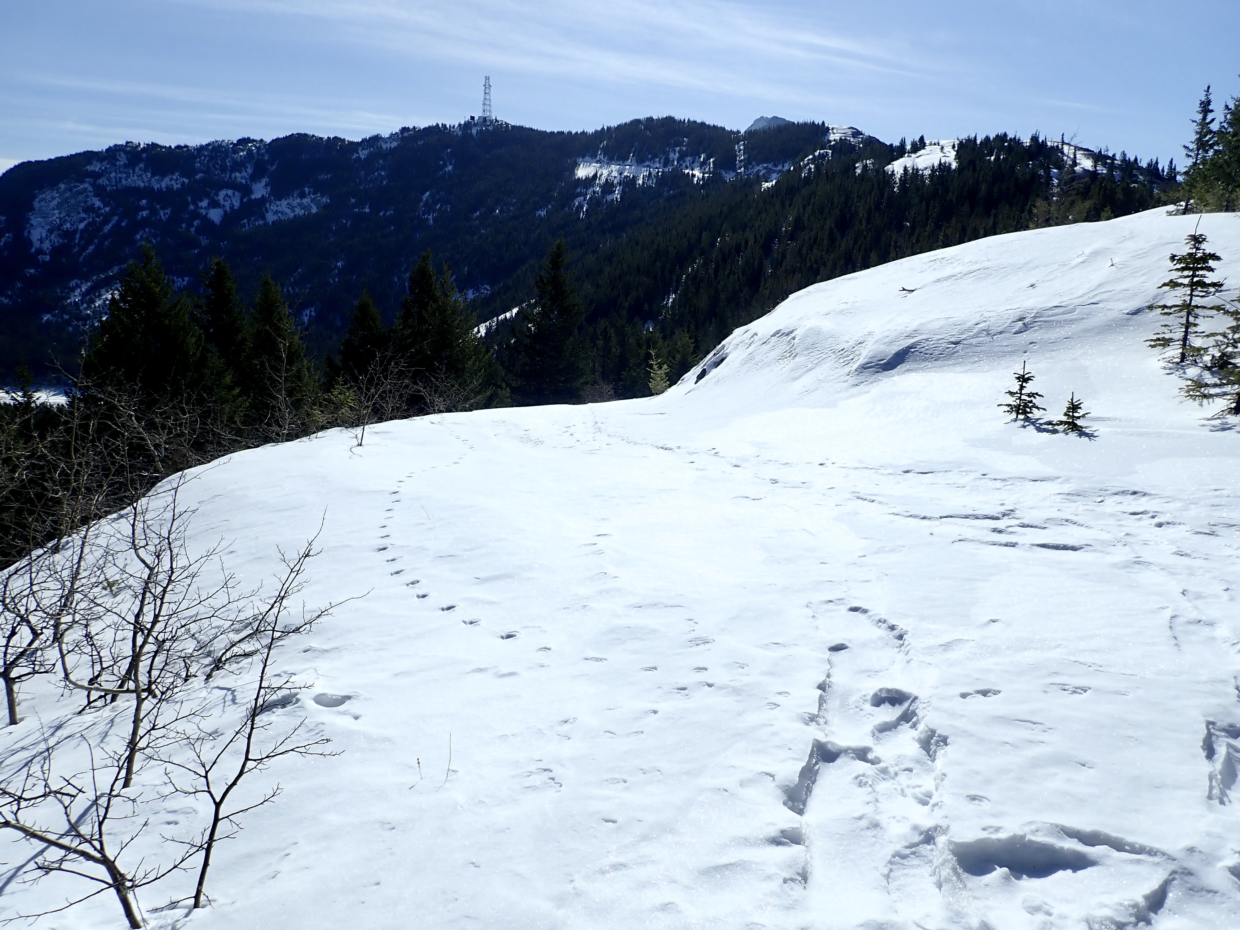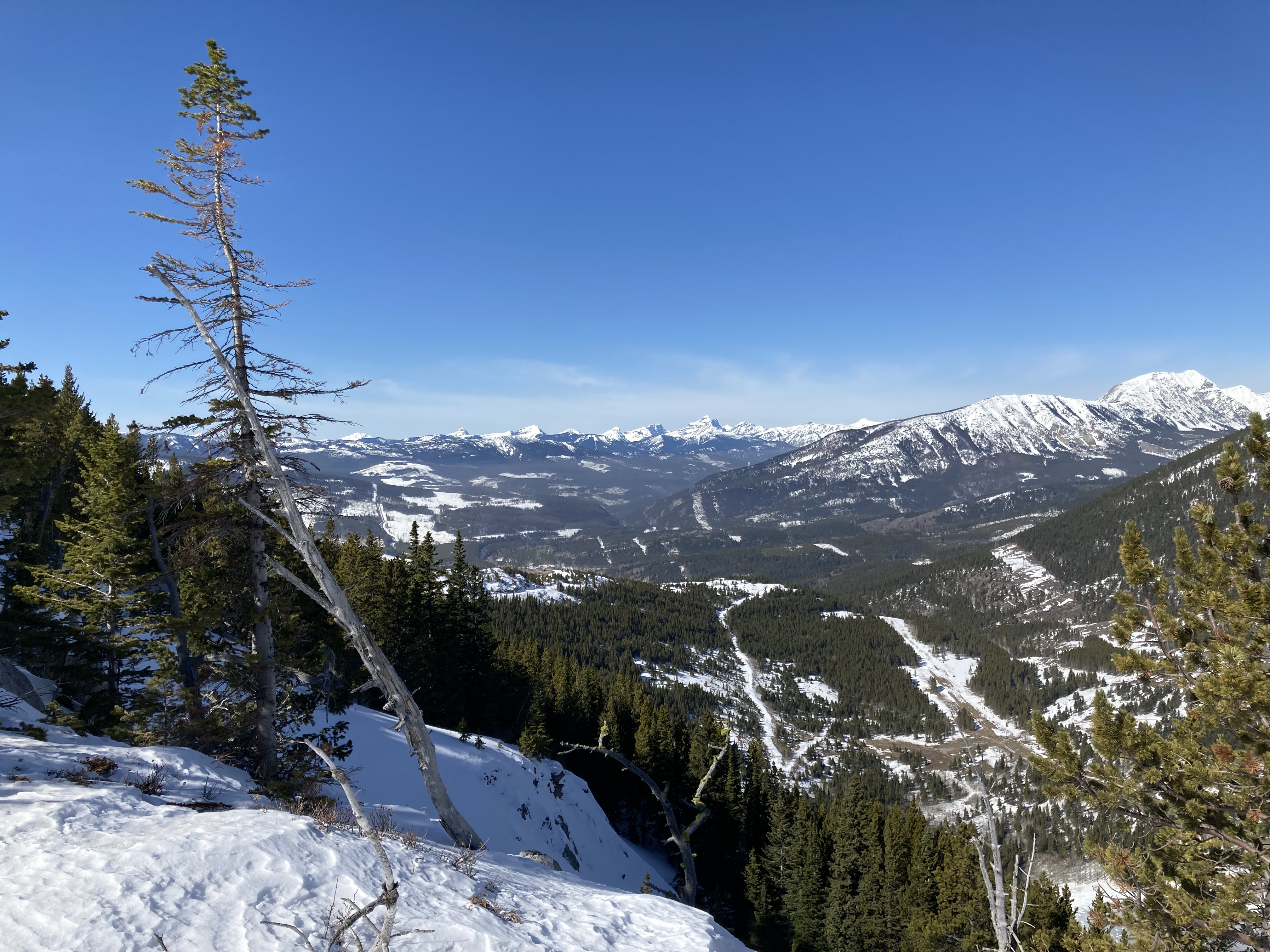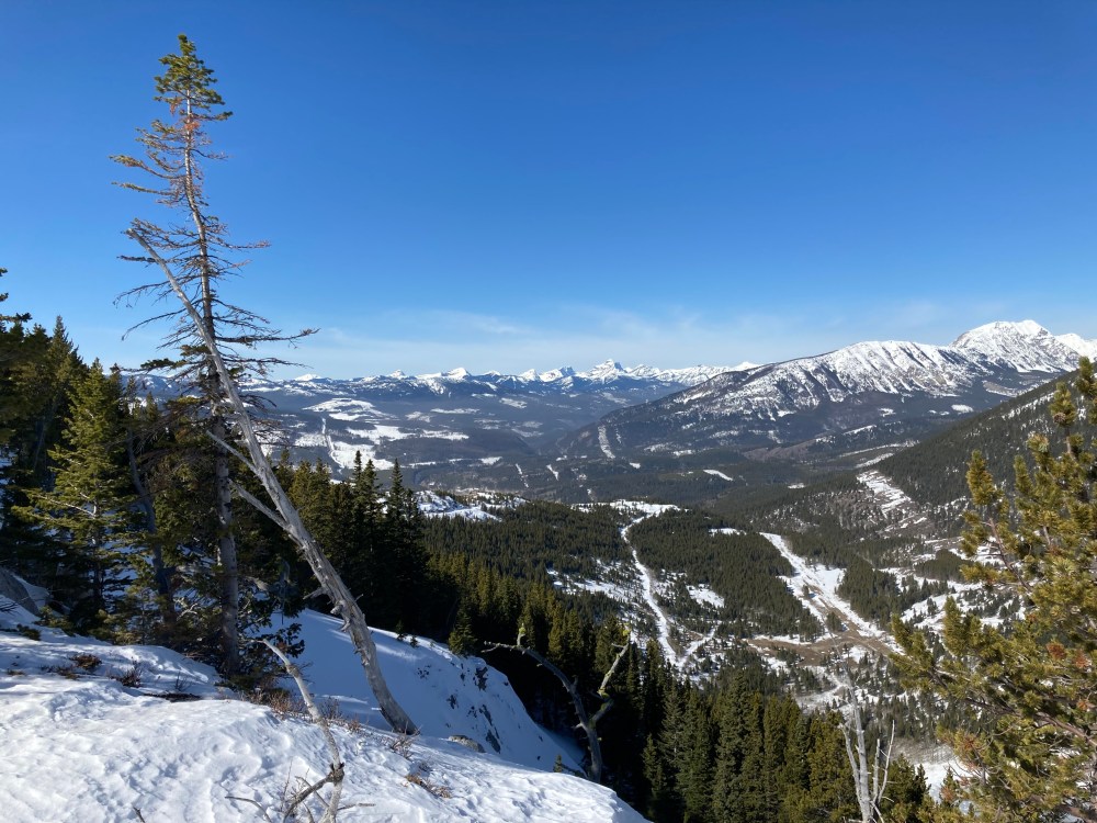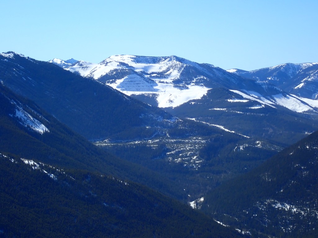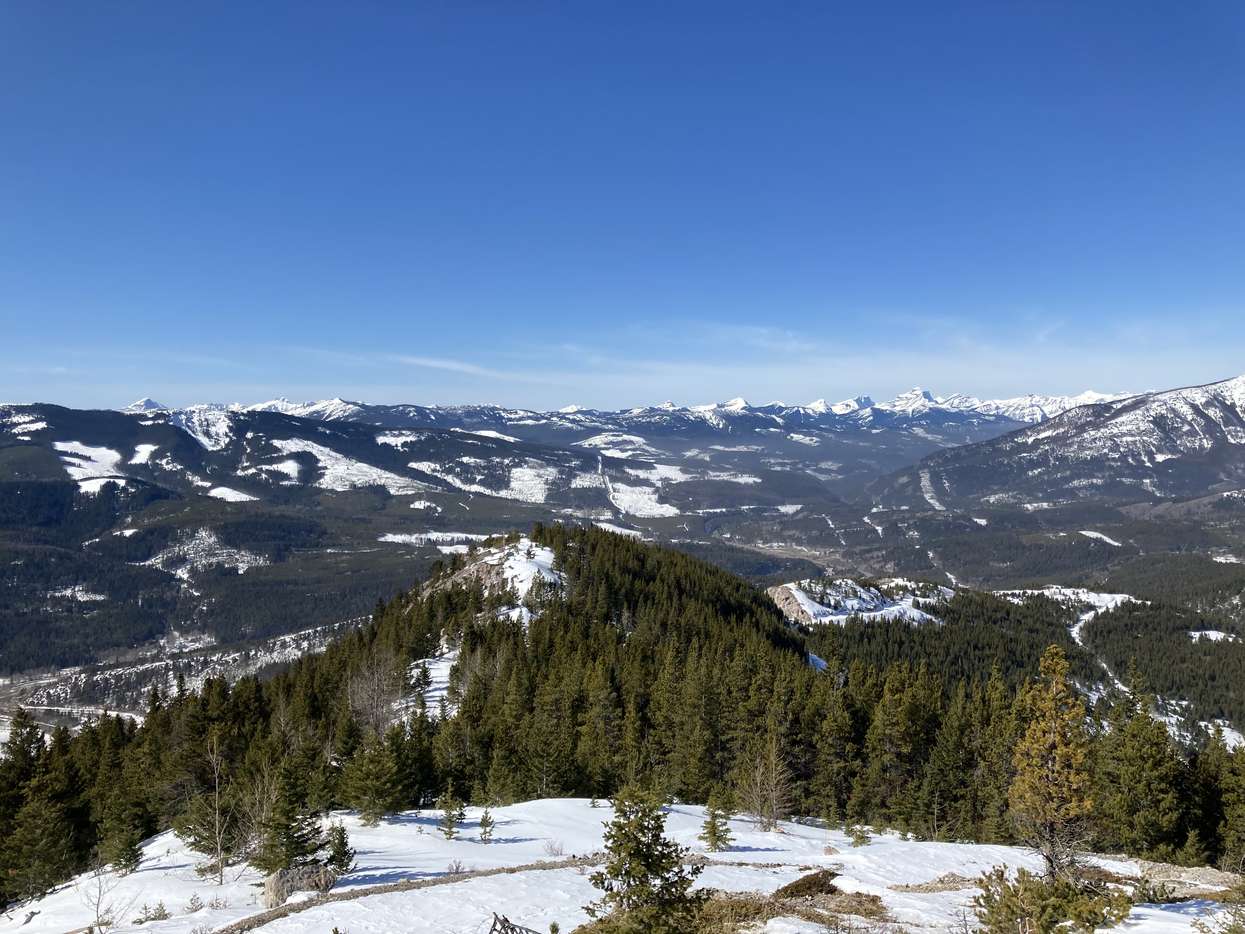 Almost exactly 3 years before this trip I snowshoed to the summit of Island Ridge on a warm and sunny day. I had taken note at that time of Crowsnest Ridge, directly across the valley. A telecom tower sat on top, which made the ridge itself less than picturesque. However, I figured the views would be pretty good, making it a good objective for a future outing. I reviewed Bob Spirko’s trip report, describing a route that began along the same road I used to approach Mount Tecumseh, but deviating to climb directly up a cutline ascending the northwestern toe of Crowsnest Ridge. From there Spirko followed the ridge until it intersected an access road that switchbacked from Phillips Pass up the steep north face of the ridge. Then he followed the road to the summit. This struck me as a more interesting route to take rather than climbing up the access road the whole way, and it would keep me out of avalanche terrain, which I thought the lower reaches of the switchback road were definitely in.
