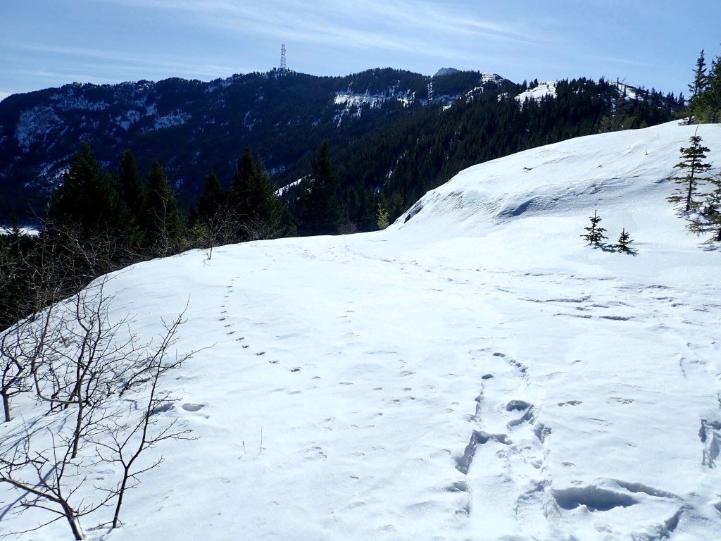Ascending the cutline made for fairly steep climbing, but it was short lived. The cutline’s apex, where it intersected the wide ridge-top, was marked by a distinctive boulder. Up to this point I hadn’t needed snowshoes, since the wind and warmth had scoured much of the snow from the west-facing slopes. On the ridge and on the leeward side there was still lots of deep snow remaining, so I put my snowshoes on then departed the cutline, heading south and ascending the ridge. Eventually I intersected the snow-buried road as it reached the ridge, and then I followed it to the summit. Spirko had mentioned that staying high on the ridge crest just above the road that wasn’t a good idea since a deep notch part of the way to the summit would require you to down-climb. I can confirm that’s good advice.
