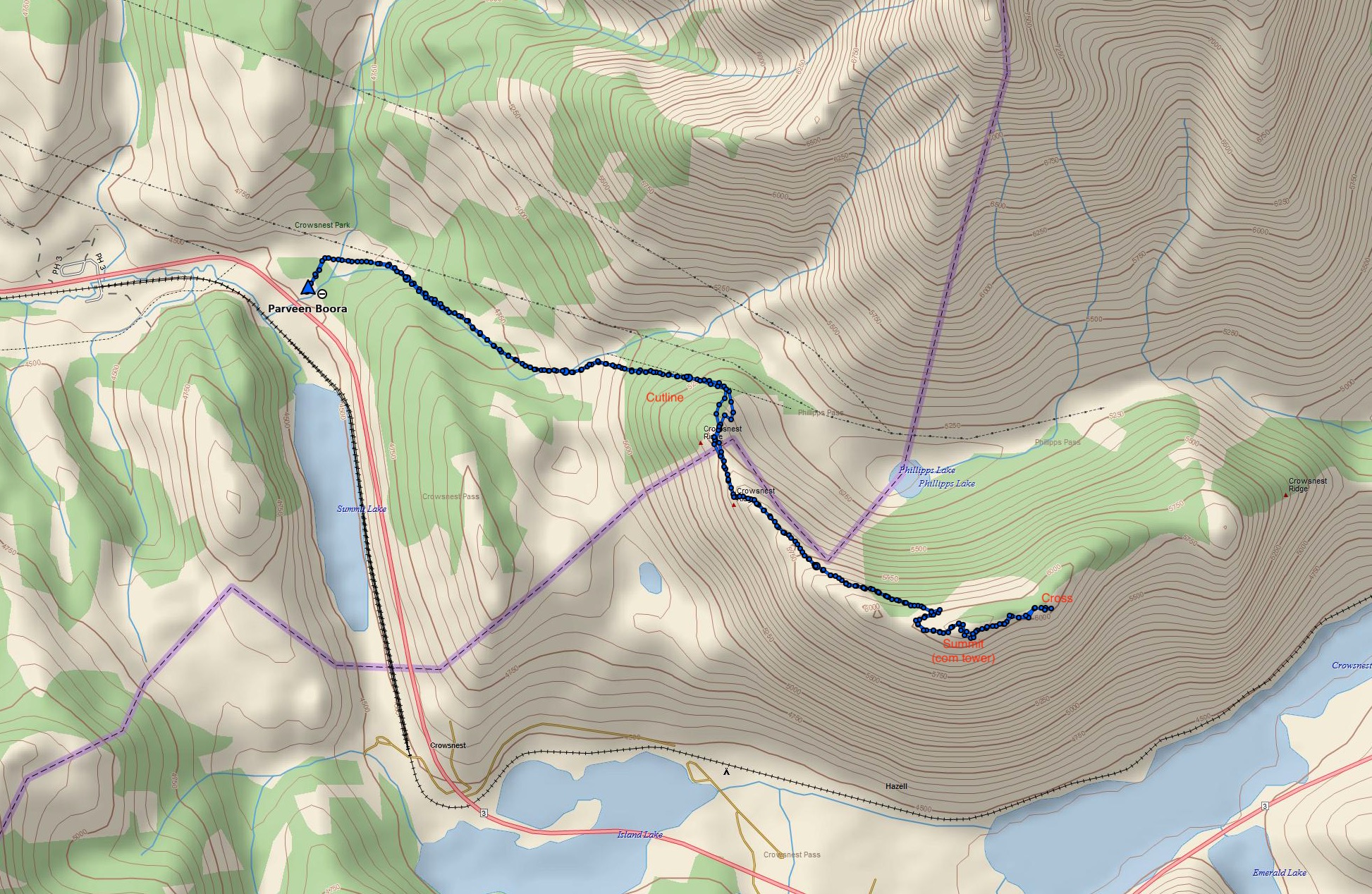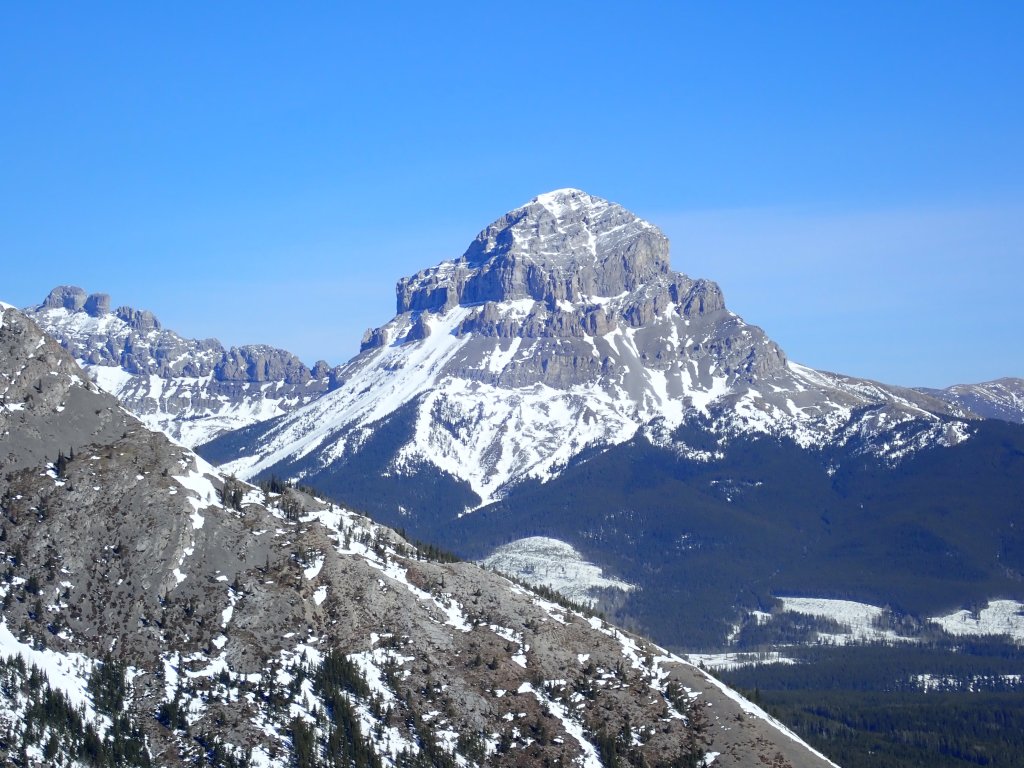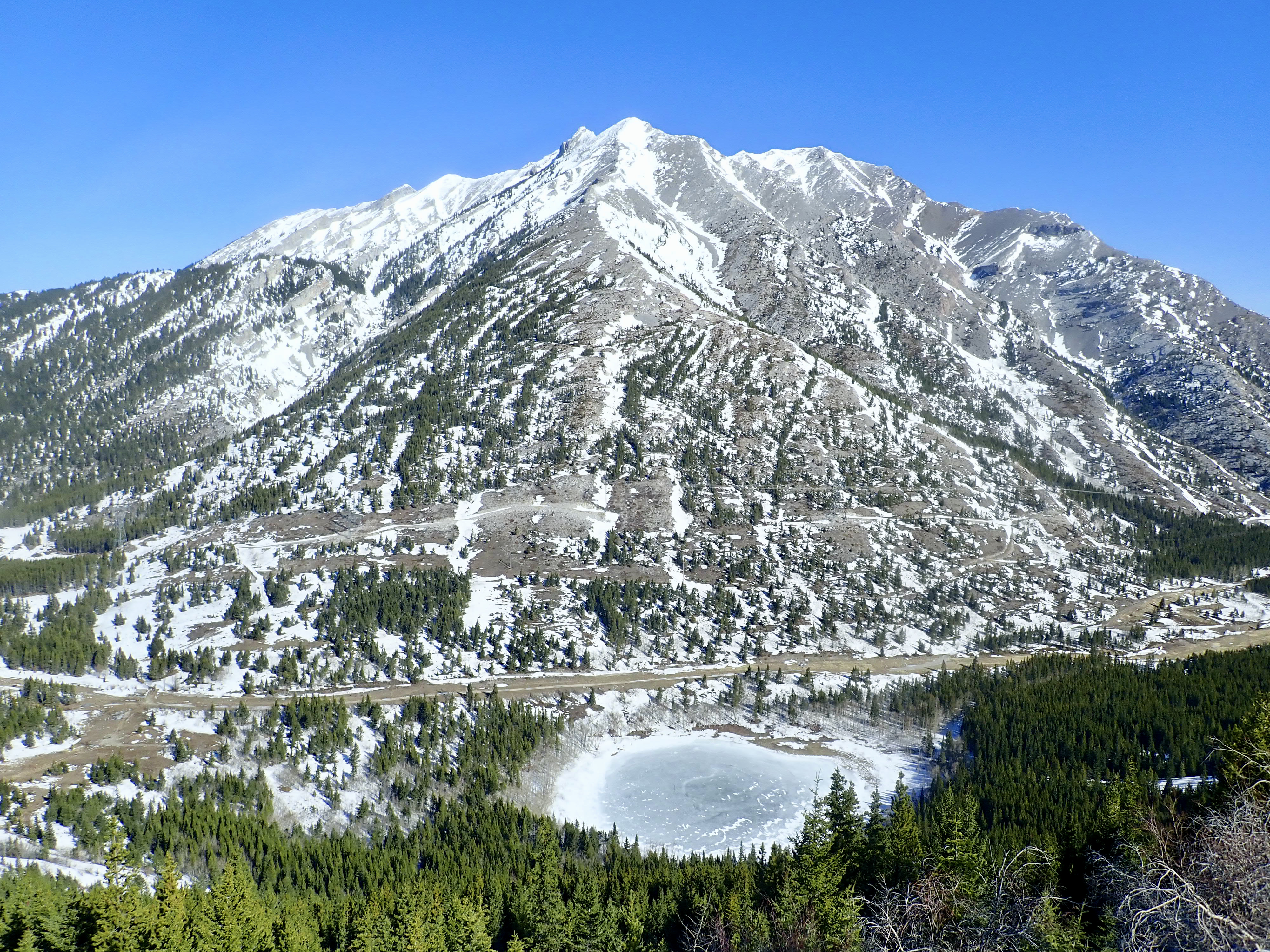 The summit is the site of a giant telecom tower and some service buildings. There’s even a pit toilet up there. The views from the summit were excellent. Mount Phillips and Tecumseh are nearby to the north, Crowsnest Mountain peeks around Tecumseh’s shoulder to the northeast. Sentry Mountain dominates the view across the valley to the south. Directly below the ridge to the south are Crowsnest, Island and Emerald Lakes. Far to the west is the distinctive shape of Mount Washburn.