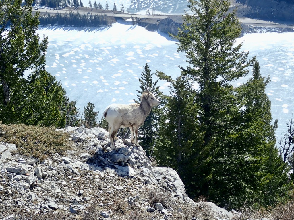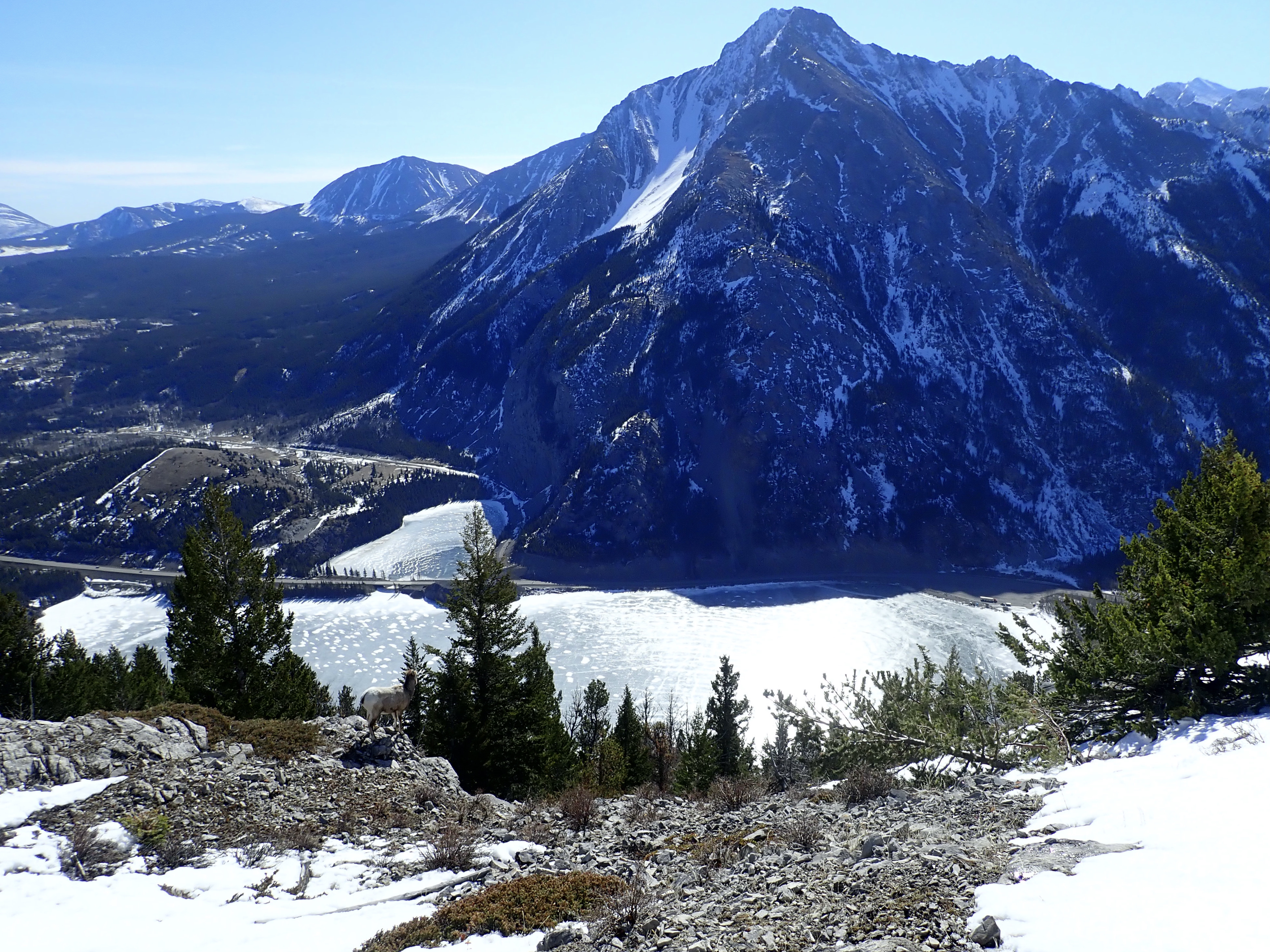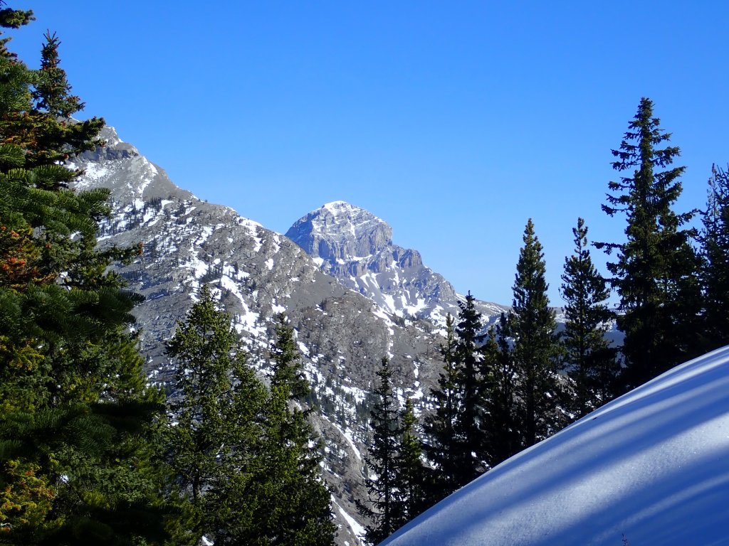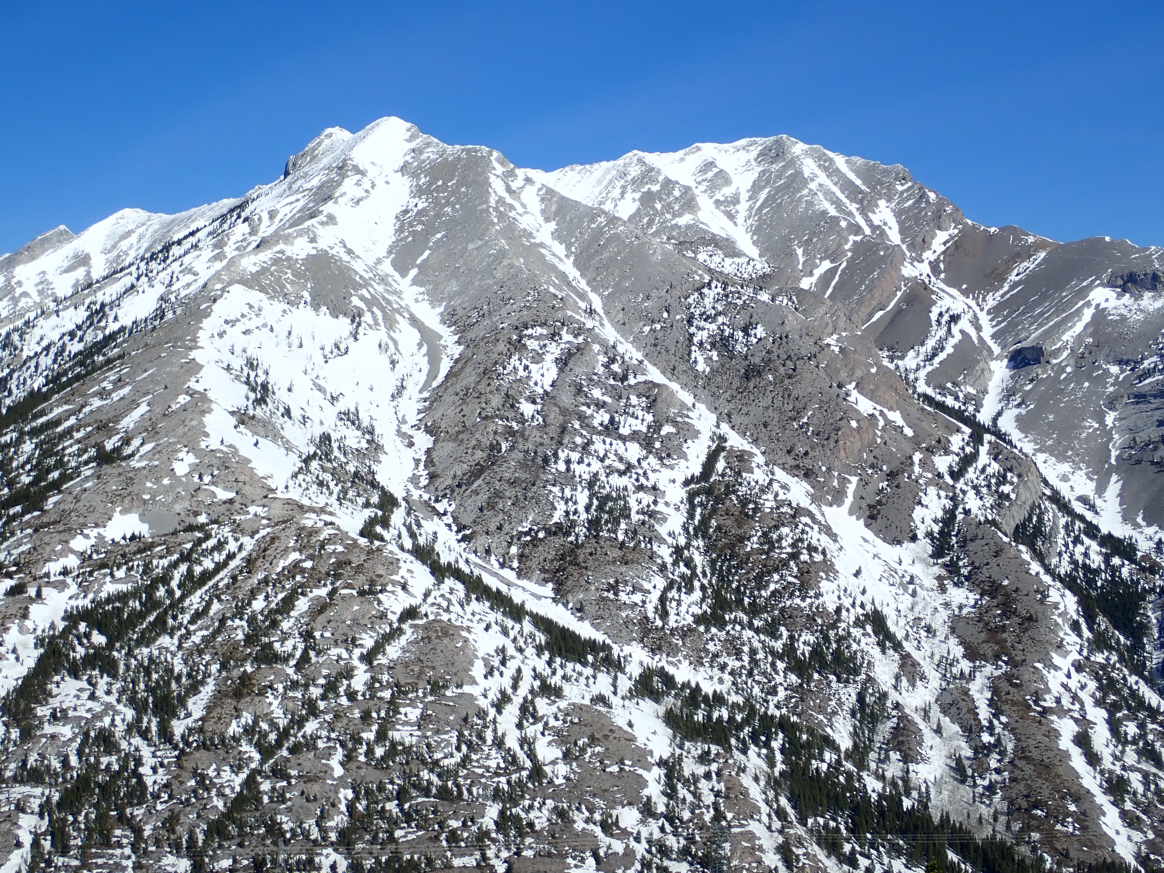 The summit is the site of a giant telecom tower and some service buildings. There’s even a pit toilet up there. The views from the summit were excellent. Mount Phillips and Tecumseh are nearby to the north, Crowsnest Mountain peeks around Tecumseh’s shoulder to the northeast. Sentry Mountain dominates the view across the valley to the south. Directly below the ridge to the south are Crowsnest, Island and Emerald Lakes. Far to the west is the distinctive shape of Mount Washburn.