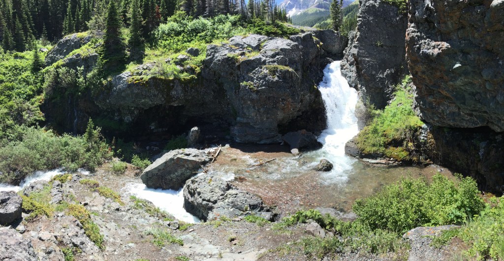 The road ends at a bit of a high-point and a trail descends a bit from there to the waterfall, which is actually not visible from that point even though it’s very close. The trail crosses over a stream coming down from Pincher Ridge via a newly built little bridge. Finally, it reaches the falls.