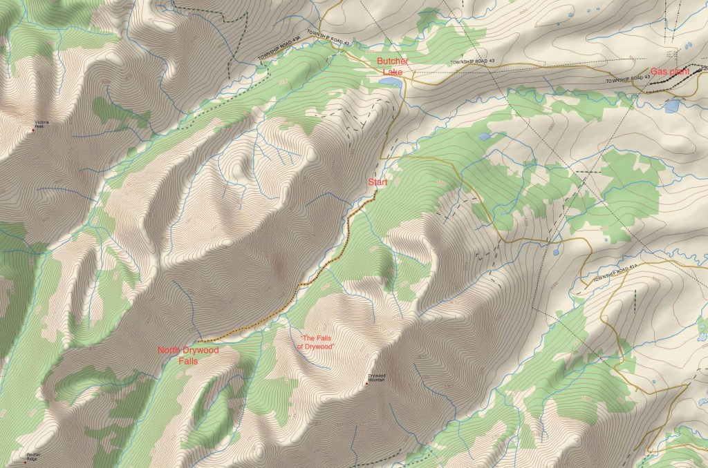 Often just referred to as Drywood Falls, this trail is a favourite all-season destination. It involves a walk along a valley bottom following a broad gas exploration road, eventually reaching a point where the road ends and a short footpath carries on to a lovely waterfall. The simplicity of the route means that it’s ideal for a broad range of abilities and ages. Rain or snow should be no impediment to making the journey, but a very hot day may be sweltering in the valley bottom and there’s no shade. Also, be aware that windy weather is accentuated because of how the valley funnels the wind. I have only done this as a summer trip so I’ll leave my impressions on suitability for snowshoeing for another time. I wouldn’t hesitate to suggest it as a rainy day or shoulder season trip, though. I have previously biked up this road so I can report that it’s doable even for the non hard-core cyclist, but I did have to push the bike in one or two places.