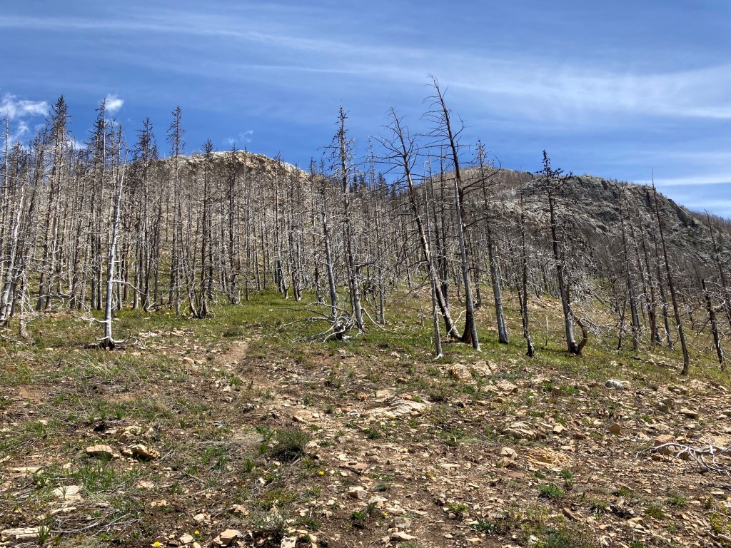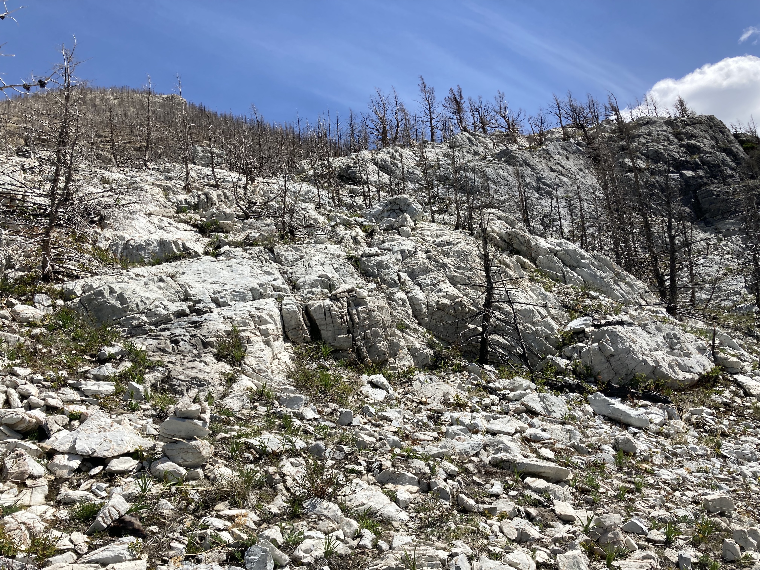 The path first went up to a small outcrop of exposed orange rocks, then deviated to the right and ascended towards an obvious interface of two cliff bands higher up. Ascending through that weakness, it then proceeded to the right (south west) near the edge of grey rocks. A few cairns were present here and there to prompt me in the right direction as the route periodically ascended and traversed. Eventually the trail stopped traversing on the grey rocks and proceeded more or less directly uphill through the remains of the forest. The peaked shape of the top of the ridge was in sight by this point. This part was a slog, but didn’t last too long. Another rocky area and another traverse followed, then a less steep climb through more trees. After passing above the treed area, the way to the ridge top was obvious and I climbed up.