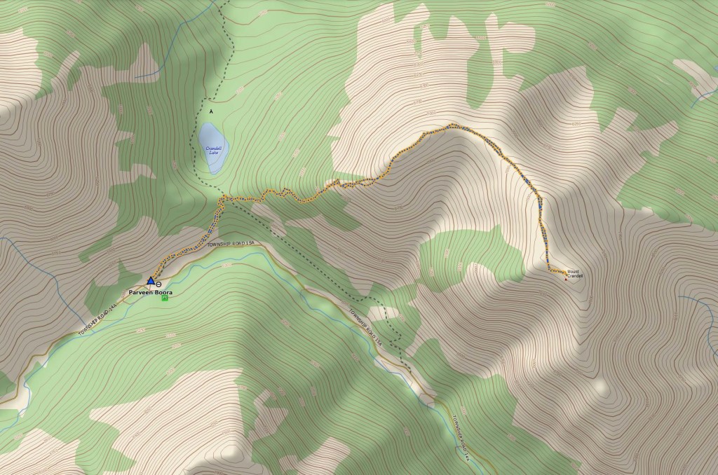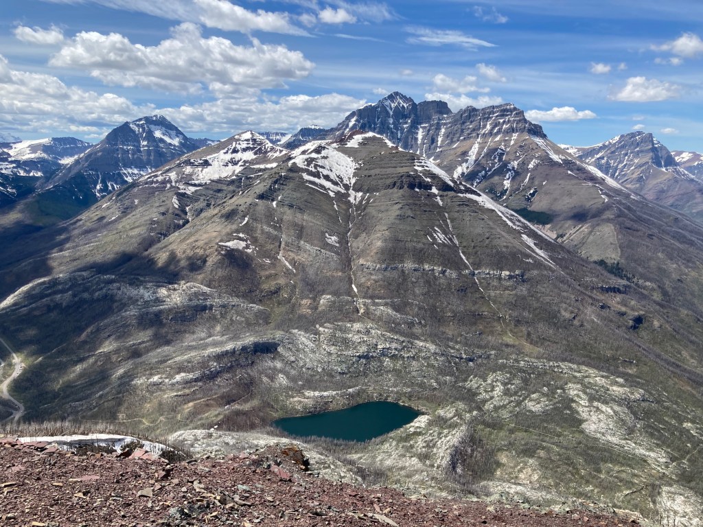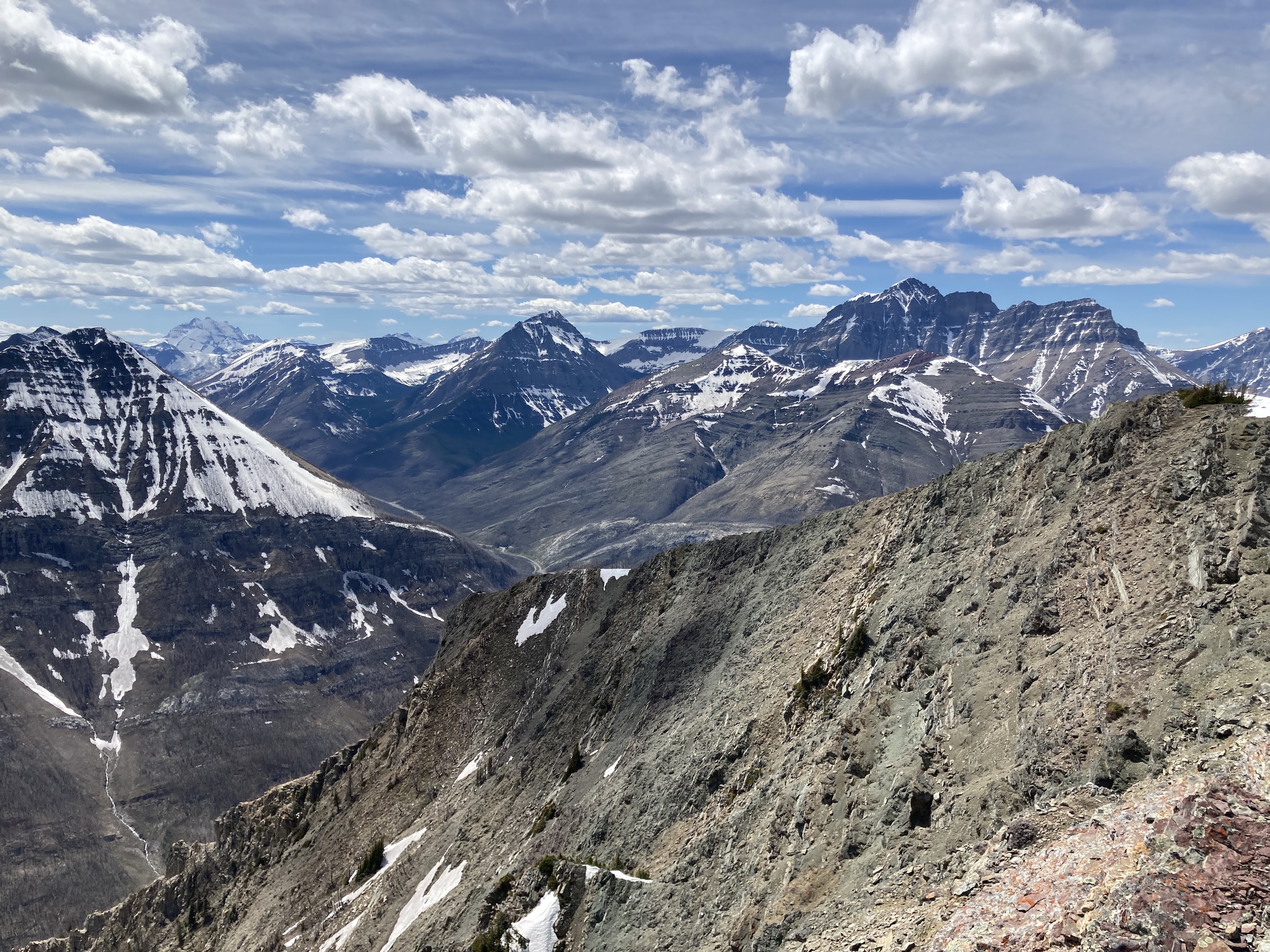 Route overview looking northeast. Google Earth doesn’t have cloud-free imaging of this area.A very rough sketch of the route.1 km up the Crandell Lake trail, there’s a signed intersection where I turned right. 50 m down the trail towards the townsite there’s a little cairn marking a trail into the woods.During the initial climb, an interface between two cliff bands is soon visible through the trees. The trail heads up to there and passes through in an area of rocky terrain. No tricky climbing is involved.The route ascends and traverses to surmount additional rocky outcrops and low cliffs.Eventually the terrain uphill starts to look like this. The faint trail in the rocks continues a short way beyond here, then turns to ascend straight up through the trees.This uphill grind doesn’t last too long, fortunately. Eventually the grade eases and the route is back on more solid rock terrain.Another bit of traversing on white rocks brought me to this distinctive spot with a small standing stone. It was a useful landmark for directing my descent.Looking down towards Crandell Lake from the landmark stone. Ruby Ridge rises behind the lake with Mount Blakiston towering behind.Ascending above the marker stone. The grade isn’t as steep anymore. After passing a few more rocky outcrops, I made it to the ridge top.Almost at the top, checking out some of the black rocks with green lichen that are characteristic of many summit blocks in the southern Rockies.On the ridge top, looking east. The summit isn’t visible at first, but soon pops into view.Looking west from the ridge. The Akamina Valley on the left heads towards Cameron Lake. Akamina Ridge beyond the spot where the valley turns. The valley on the right heads towards Red Rock Canyon. These are the views you won’t get if you ascend by the eastern approaches.Crandell Lake, with Mount Lineham, Ruby Ridge, Mount Blakiston, and Anderson Peak behind. The parking area at the trailhead is at the left of the frame.Upper Waterton Lake as seen from the start of the ridge walk. Mount Cleveland was looking great that day.From left to right: Avion Ridge, Mount Glendowan, Cloudy Peak, Mount Dungarvan, “Rogan Peak”, and Mount Galwey. The Crandell campground is in the valley bottom. At the moment it’s still closed for rebuilding after the fires.The summit eventually comes into view, featuring sensor station of some kind. Chief Mountain is in the distant background on the left.Closer to the summit the terrain becomes a little more interesting, and the views along Upper Waterton Lake continue to improve.The summit of Mount Crandell, looking south. Mount Cleveland dominates the view. The sensor station is to the left of this frame. It’s a big green cylinder with an antenna. Nearby there’s a wooden platform which is apparently a helicopter pad.Southeast. Sofa Mountain, Vimy Peak, and Mount Boswell are directly across the valley. Chief Mountain is in the distance to the left of centre.More mountains to the south. Mount Richards is to the immediate right of the lake. Bertha Peak is near centre, and Mount Alderson is to its right.Looking southwest. The end of Buchanan Ridge is directly across the valley. Mount Alderson, Mount Carthew, and Buchanan Peak are behind it. Portions of Mount Custer are visible in the distant background. The big snowy peak in the distance to the right is Long Knife Peak in Glacier National Park in Montana.Looking west. Long Knife Peak, Mount Rowe, Mount Lineham, Mount Hawkins, Ruby Ridge, and Mount Blakiston.Summit panorama.I finally remembered to bring my little tripod so I could get a picture of myself.Mount ClevelandMount Alderson. A sliver of Alderson Lake is visible surrounded by snow at the base of the massive cliffs of the northern face. The 2 Carthew Lakes are in the snow-filled hanging valley to the right. The very popular Carthew Alderson Traverse hiking trail descends through tis area on its way back to the townsite.Mount Blakiston and Ruby Ridge.Long Knife PeakPeering between Vimy Peak and Mount Boswell at the snowy valley containing Crypt Lake.Akamina Ridge. The summits of Kintla Peak and Kinnerly Peak rise beyond the ridge.Heading back along the ridge, enjoying excellent simultaneous views of Mount Cleveland and Mount Blakiston.