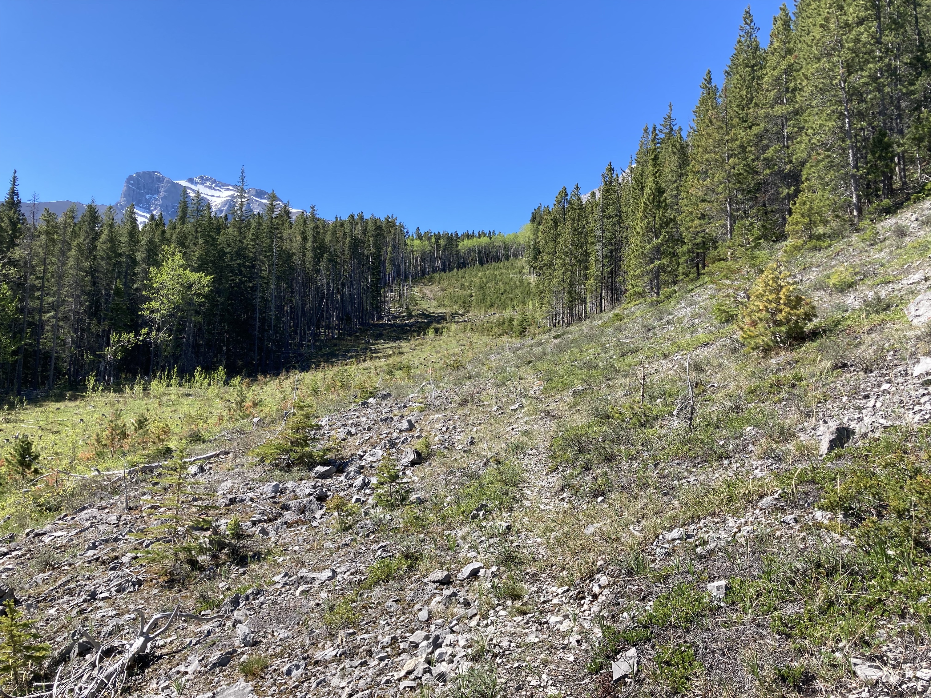 For my first trip to Sentry Mountain, I decided to use the eastern slopes approach which Matthew Clay describes on his blog. It’s also the route which Nugara has in his new book Popular Day Hikes: The Castle and Crowsnest. Typically, scramblers use the west ridge approach but that involves crossing a creek and I didn’t feel like doing that on a hot spring day when the flow was potentially problematic. The eastern route proved to be easy to access and provided me with an excellent day on the mountain.