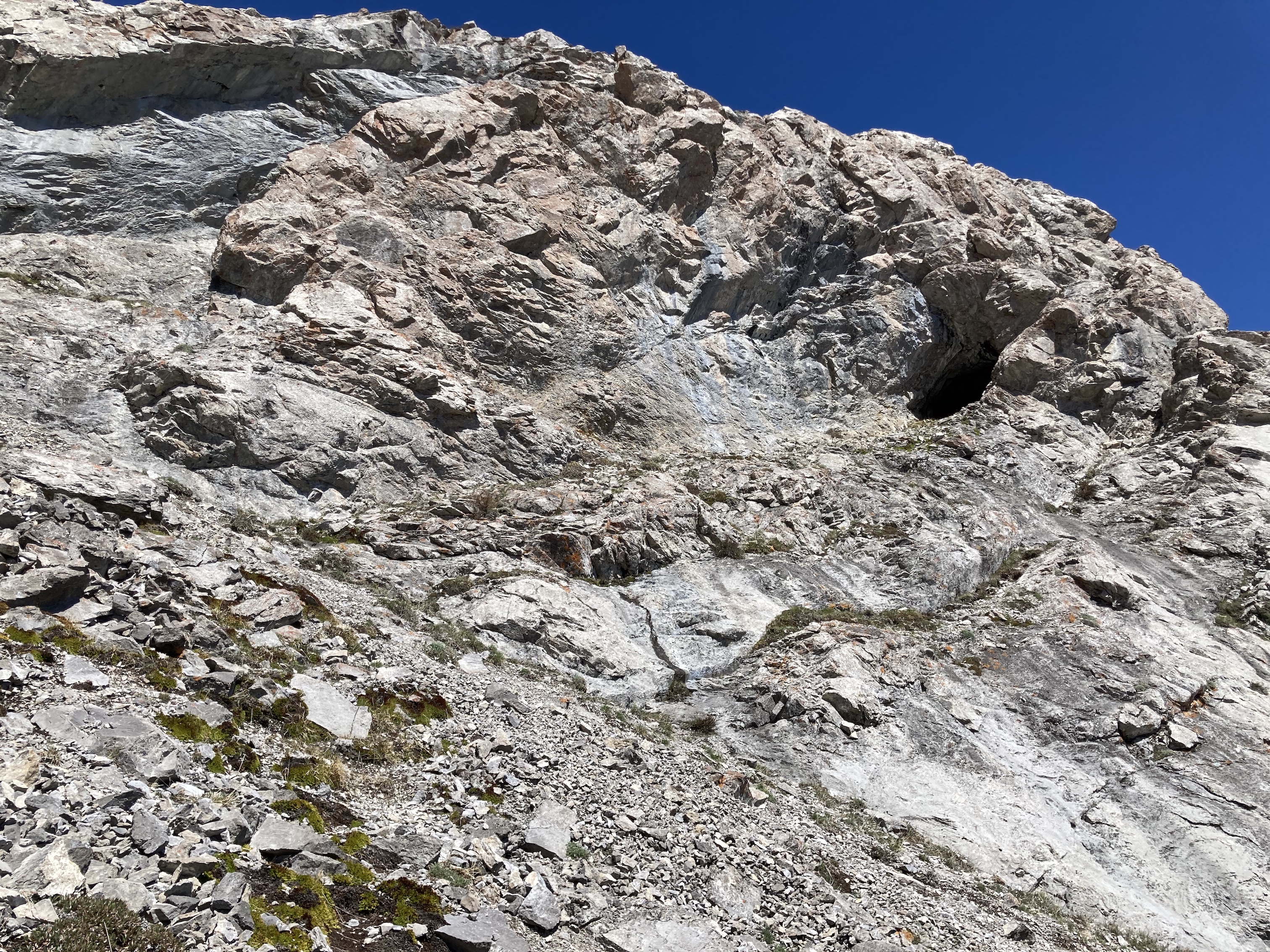 From this point the eastern face of Sentry Mountain is clearly in view. I began to ascend, heading to a drainage that still had some snow in it. I kept to the right of this drainage on my way up and boot-skied it on the way down. The ascent is quite steep and leads to a rock face. When I reached there I found a small cave which sits a short distance up the face. I checked out the cave entrance, which was absolutely carpeted by animal droppings, so not really that pleasant a place to visit. After climbing down from the cave I continued up the slope beyond the rock face. The summit rocks came into view above and to the right, but I bore left towards the low point of the col between Mount Sentry and Ostracized Peak. Once on the col, I turned right and enjoyed some easy scrambling to get to the summit. It took 2 hours 24 minutes to ascend.