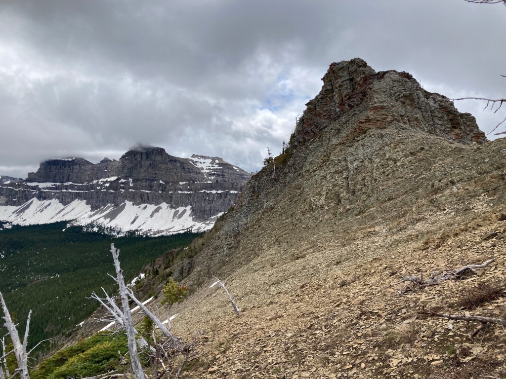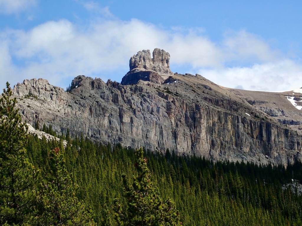 Mount Gladstone sits adjacent to the very picturesque Castle Peak and Windsor Mountain in the Castle Wilderness. The most frequently described scrambling route to the summit approaches from the east and ascends the southern aspect. This route appears in Nugara’s More Scrambles in the Canadian Rockies 3rd ed. Gladstone was on my list of objectives, but I decided to come at it from the other direction – from the west, first biking roughly 4 km along the South Castle Road, then ascending a wooded peak called North Castle, then following the connecting ridge to Mount Gladstone.