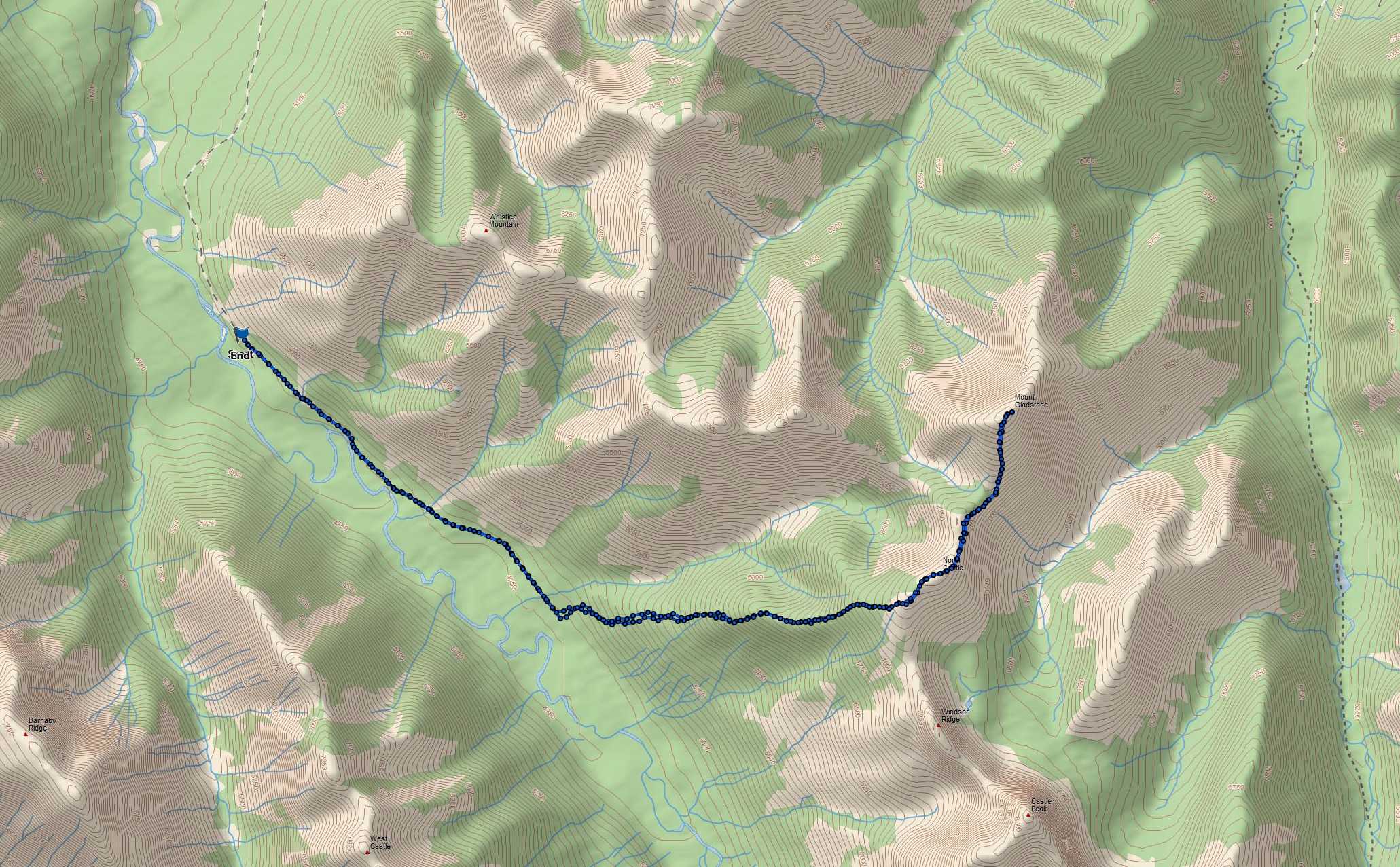 Getting to Mount Gladstone’s summit involved losing about 100 m to get down to the col then climbing about 200 m to the summit. On the way down to the col were 3 rocky steps that had to be down-climbed. The terrain would qualify as moderate scrambling. Beyond the col was just some steep hiking to Gladstone’s summit. I reached the top at 3h 50m. The weather throughout the day had been unsettled. Passing bands of clouds would periodically obscure adjacent peaks, rain and ice pellets fell from time-to-time, and the wind was strong enough to almost push me over. Thus, my stay on the summit was pretty short. I retreated to the col and sheltered behind some trees to eat lunch and enjoy the views of Castle Peak.