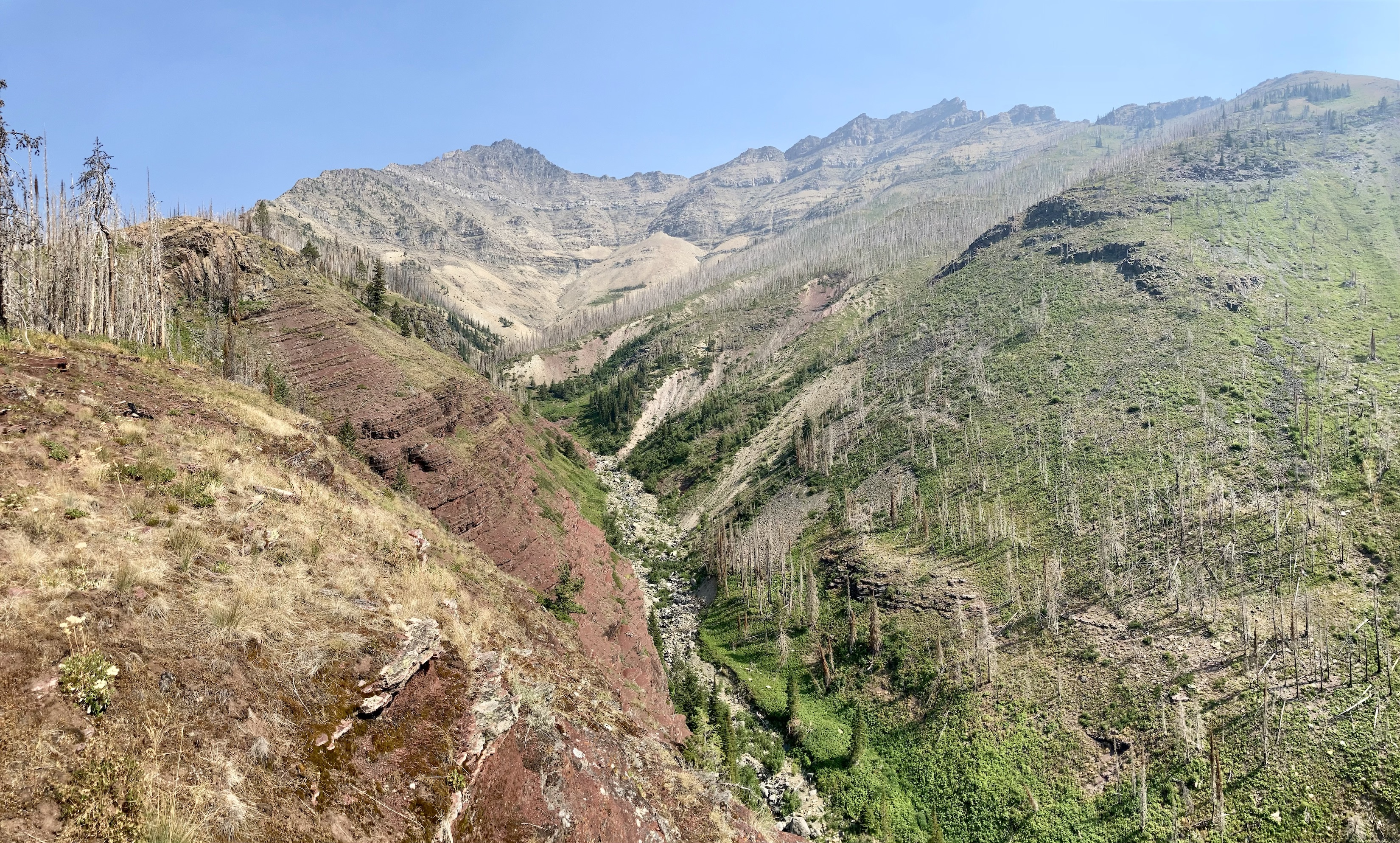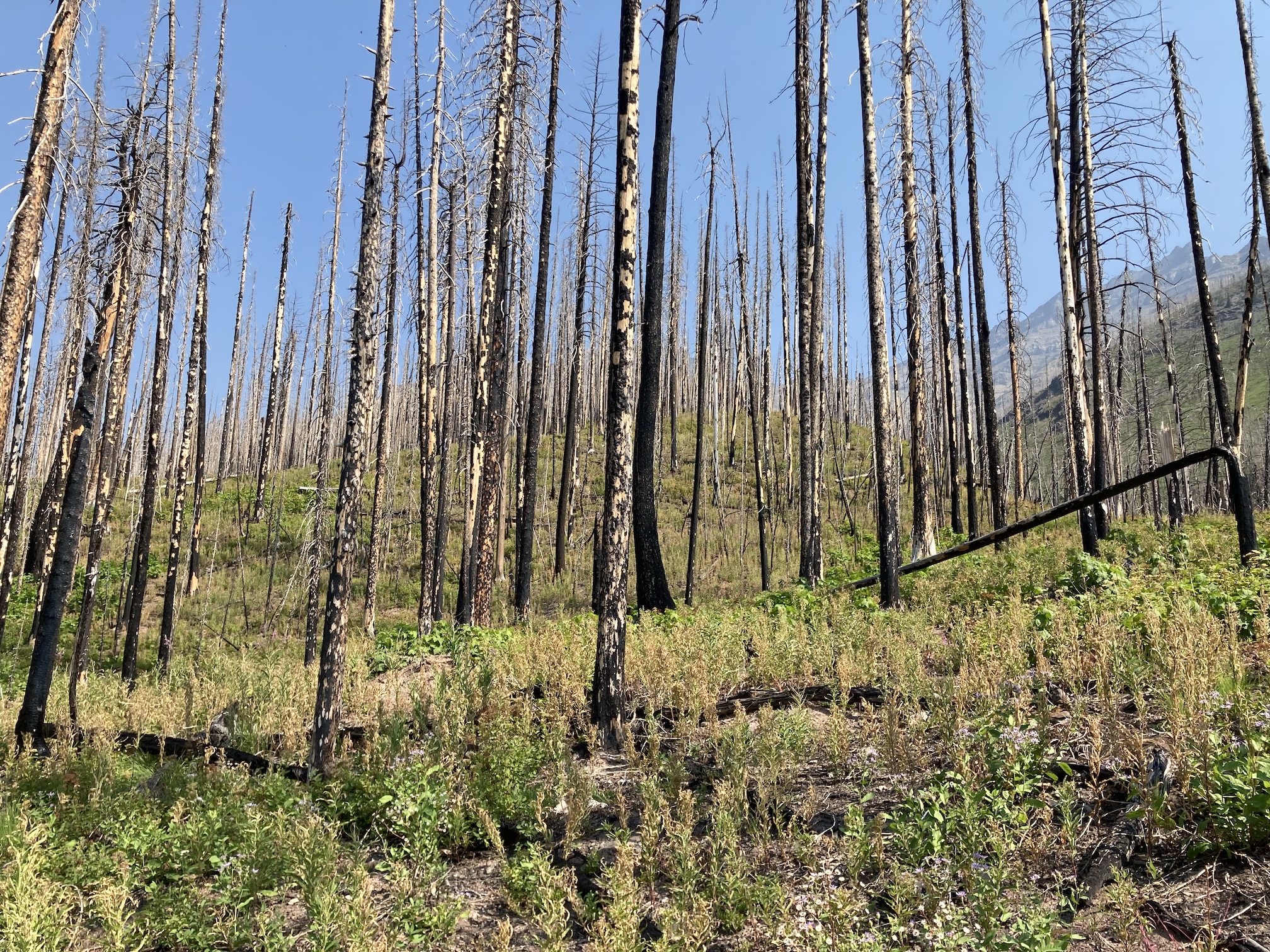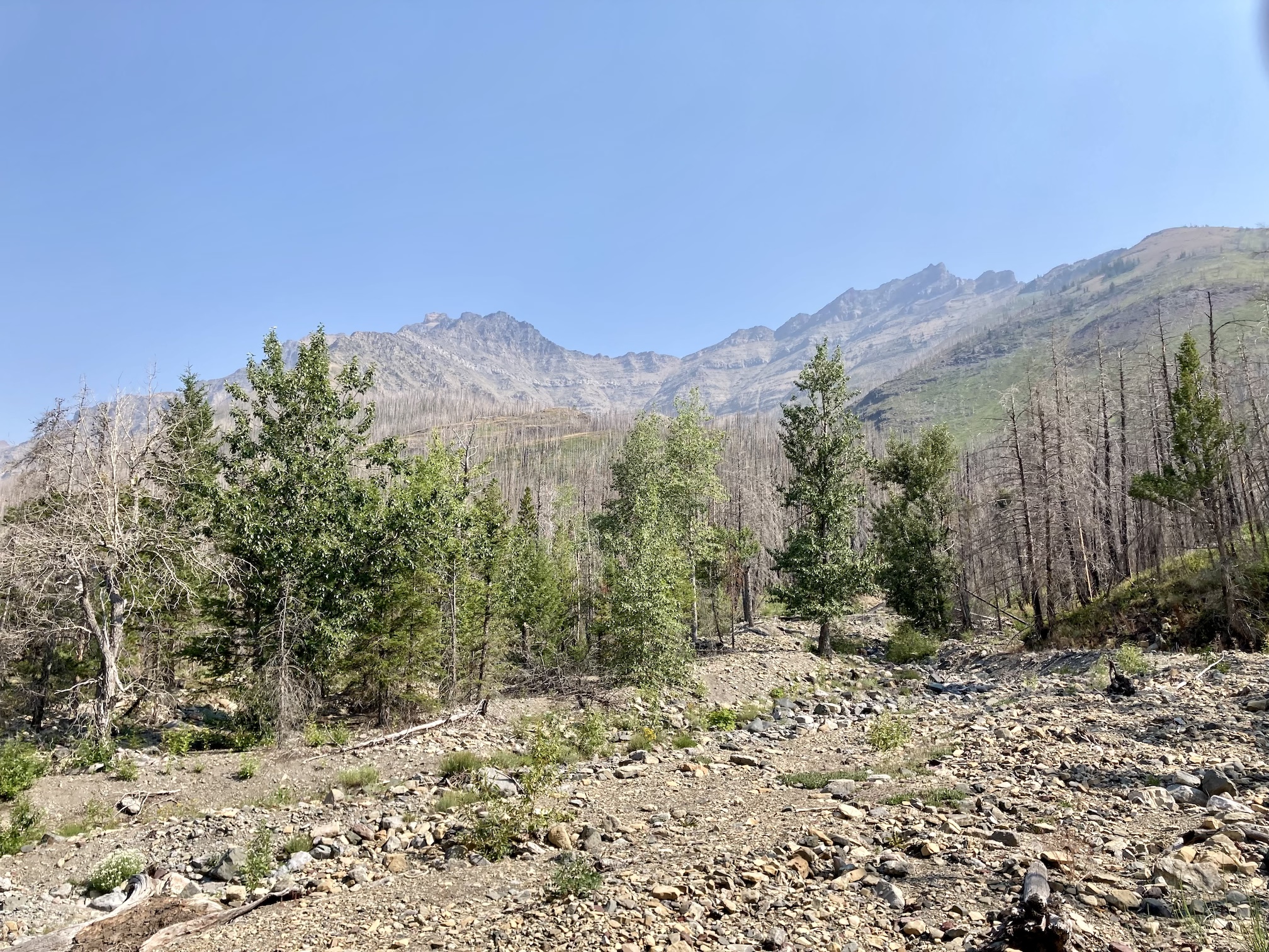 Glendowan is in Waterton Lakes National Park. Access is from the Red Rock Parkway. From the main parking area at Red Rock Canyon I set off along Snowshoe trail. Just over 2 km from the trailhead a major drainage crosses the trail. Off to the right (north) there are clear views of the southern face of Mount Glendowan and an unnamed southern outlier. This is the start of the route. I set off to the north, initially following the dried creek bed, then bearing left into the forest. A rounded ridge began to rise and I climbed onto it and followed it until I got out of the trees. This section of the forest was burned in the recent fires. All the old deadfall has been consumed and now there is only sparse new deadfall and relatively light vegetation among the burned trees. As the years wear on, this section will likely become pretty miserable to traverse as dead trees fall and clutter the forest floor.