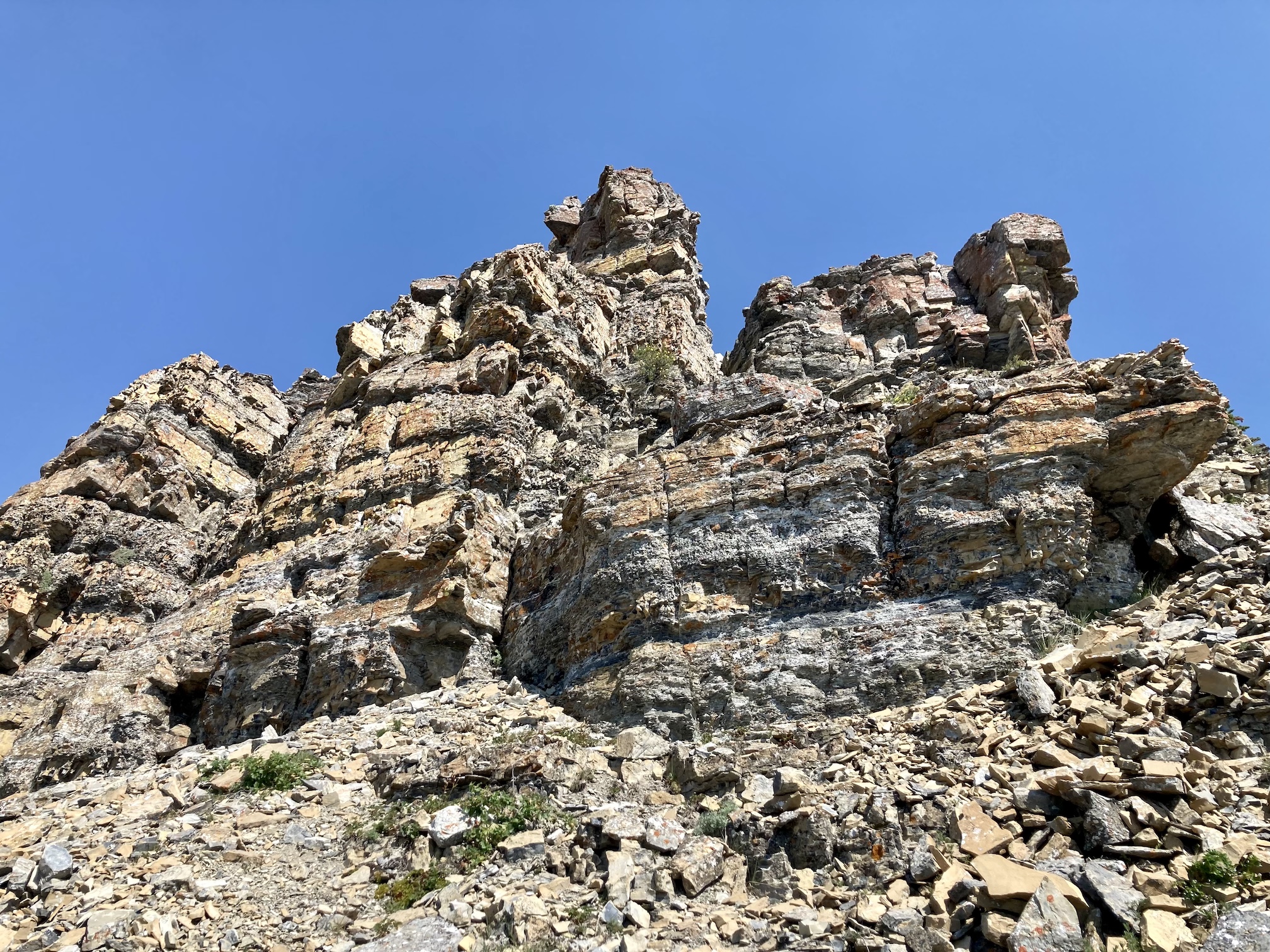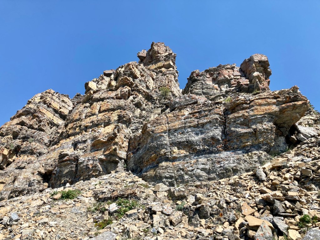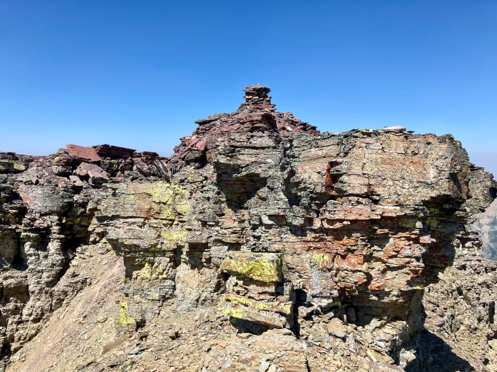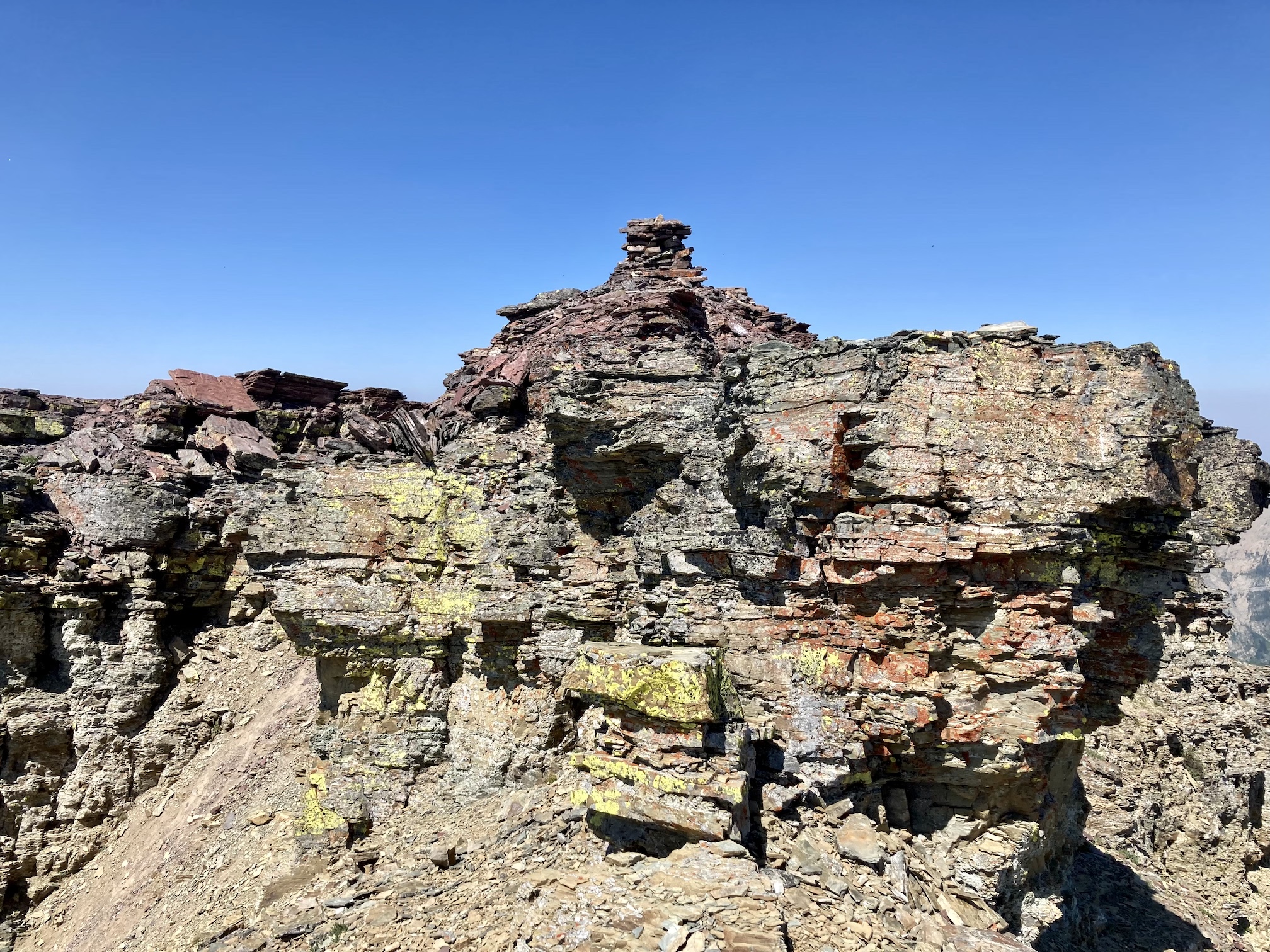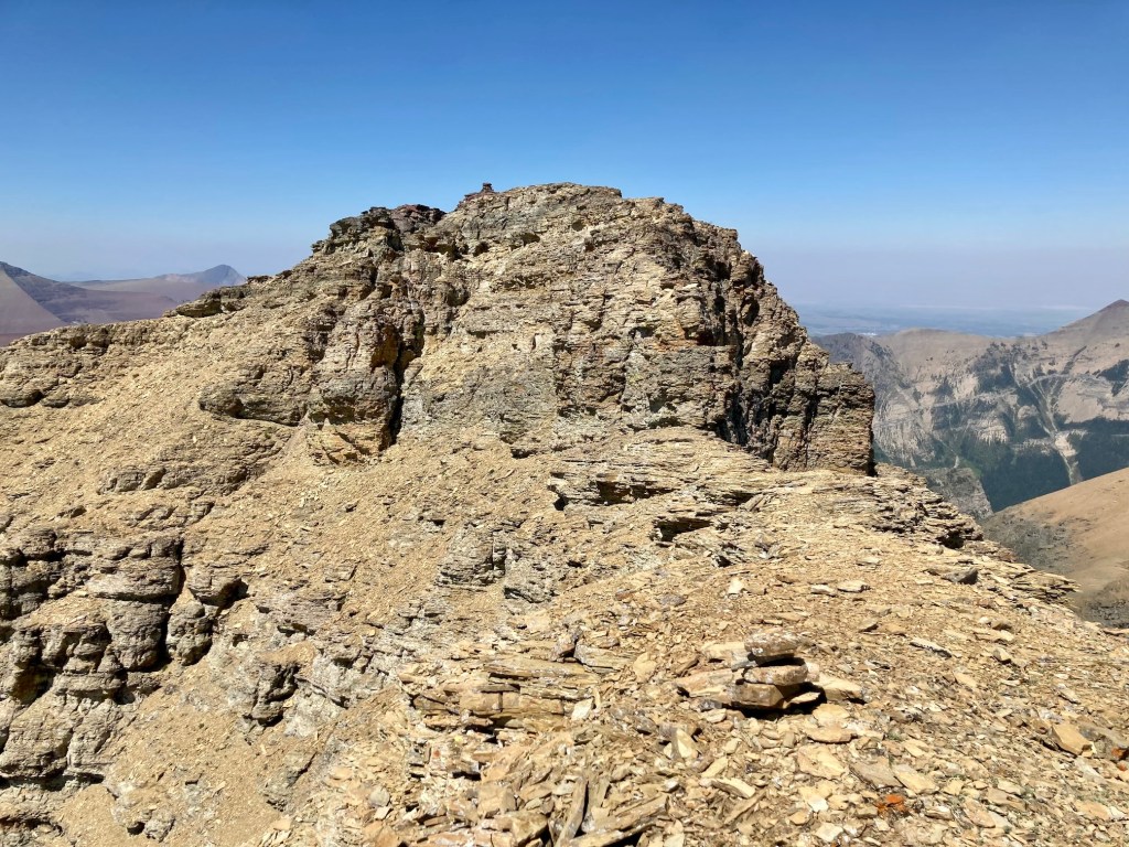 Like essentially all of the mountains in Waterton and the Castle, the rock changed to a black colour with green lichen near the top of the ridge. Nugara suggests departing the ridge at this point and traversing left to a boulder-filled gully, ascending it through the black rock band. I ended up staying on the ridge for some distance beyond that point (mostly because I forgot the advice) and engaged in some trickier scrambling. Eventually, while still on the black rock, I left the ridge and crossed to the left across a bay of rubble. On the other side of the rubble, I rounded a corner on the black rock and then traversed further until I found a weakness and ascended. Once back on sand-coloured rock I went left until I found a weakness. After ascending a scree slope I saw the summit a short distance ahead above one final rock band. A bit more moderate scrambling and I was up.